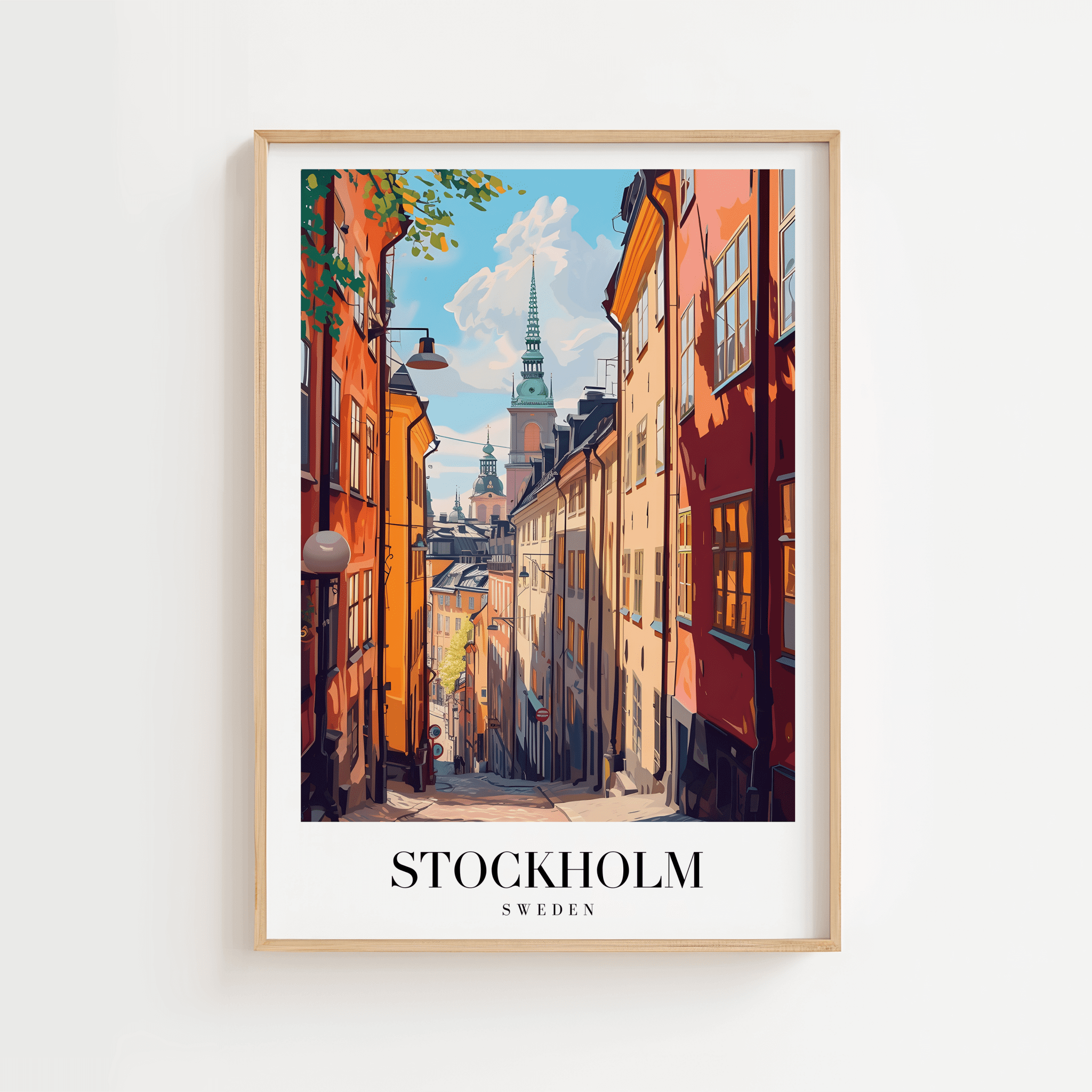 Denne Stockholm Sverige – Byplakat fanger charmen fra Sveriges hovedstad med et smukt motiv fra Gamla Stan. Plakaten viser de farverige huse, hyggelige brostensgader og de karakteristiske spir, der gør Stockholm så elsket som rejsemål.