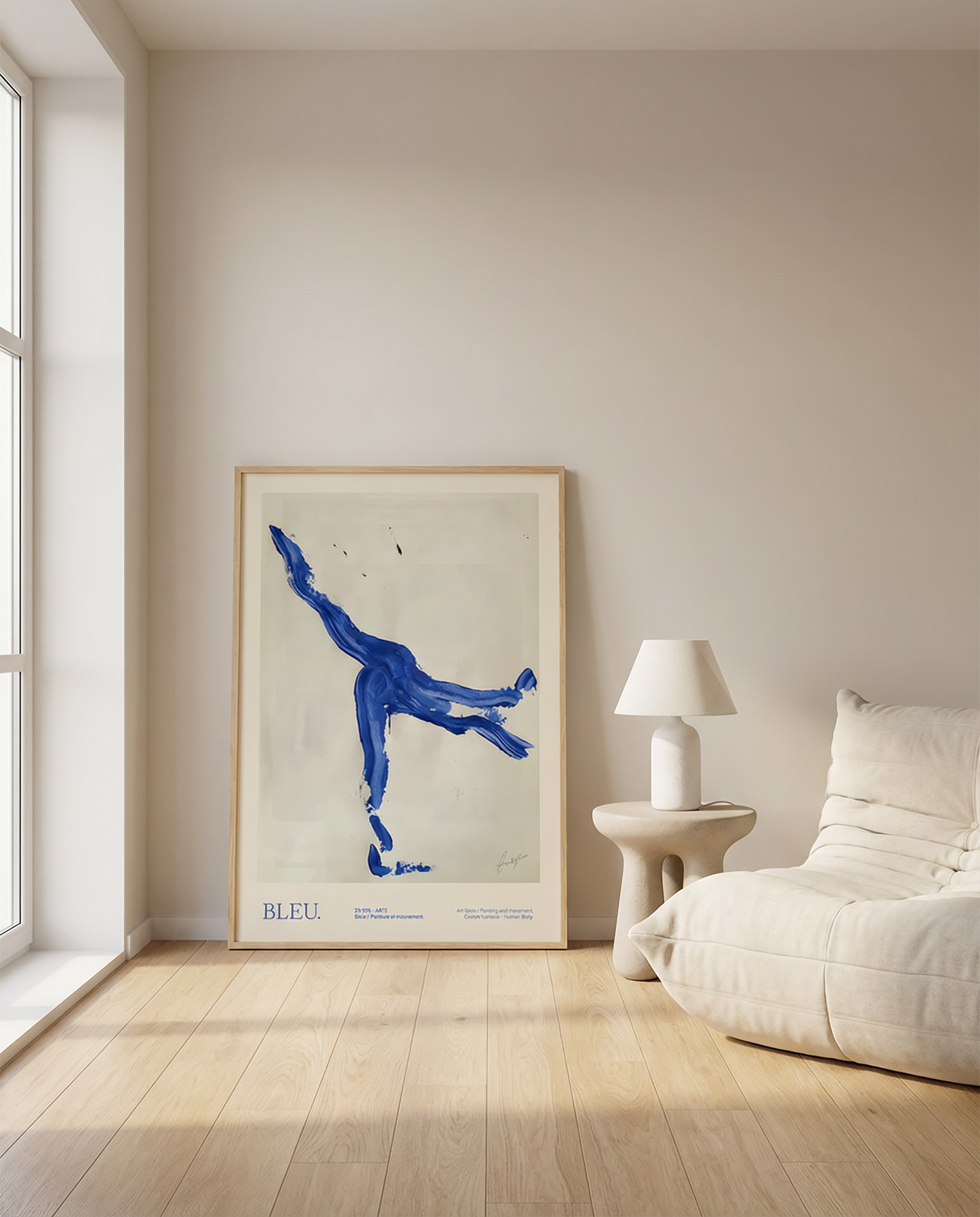 Bring dynamism and artistic energy into your home with the Abstract Bleu Poster. The motif is created by powerful blue brushstrokes that form an abstract and vibrant shape inspired by human movement. The result is a modern art poster that combines simplicity with expressive creativity.