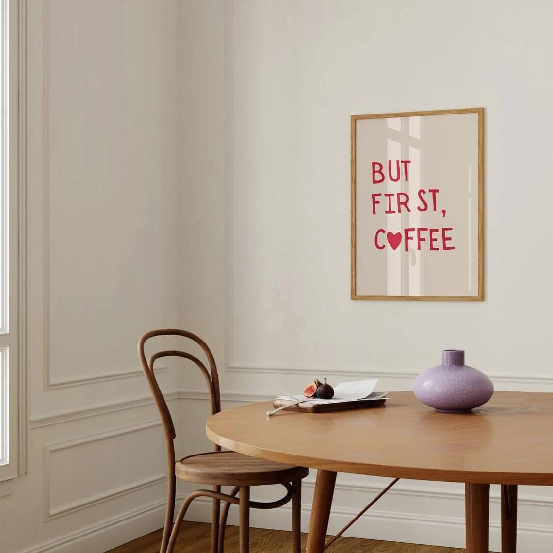 Our But first Coffee Poster is created for all coffee lovers who know that the first priority every day is a good cup of coffee. With its modern design and eye-catching typography, it sends a fun but strong message: first coffee, then everything else. The poster serves as a reminder to enjoy the moment and start the day with energy and inspiration. It fits perfectly in any kitchen, living room or office, where it can help to add a personal and humorous touch. Available in several sizes and printed on quality material - ready to bring a fresh breath of coffee inspiration into your home