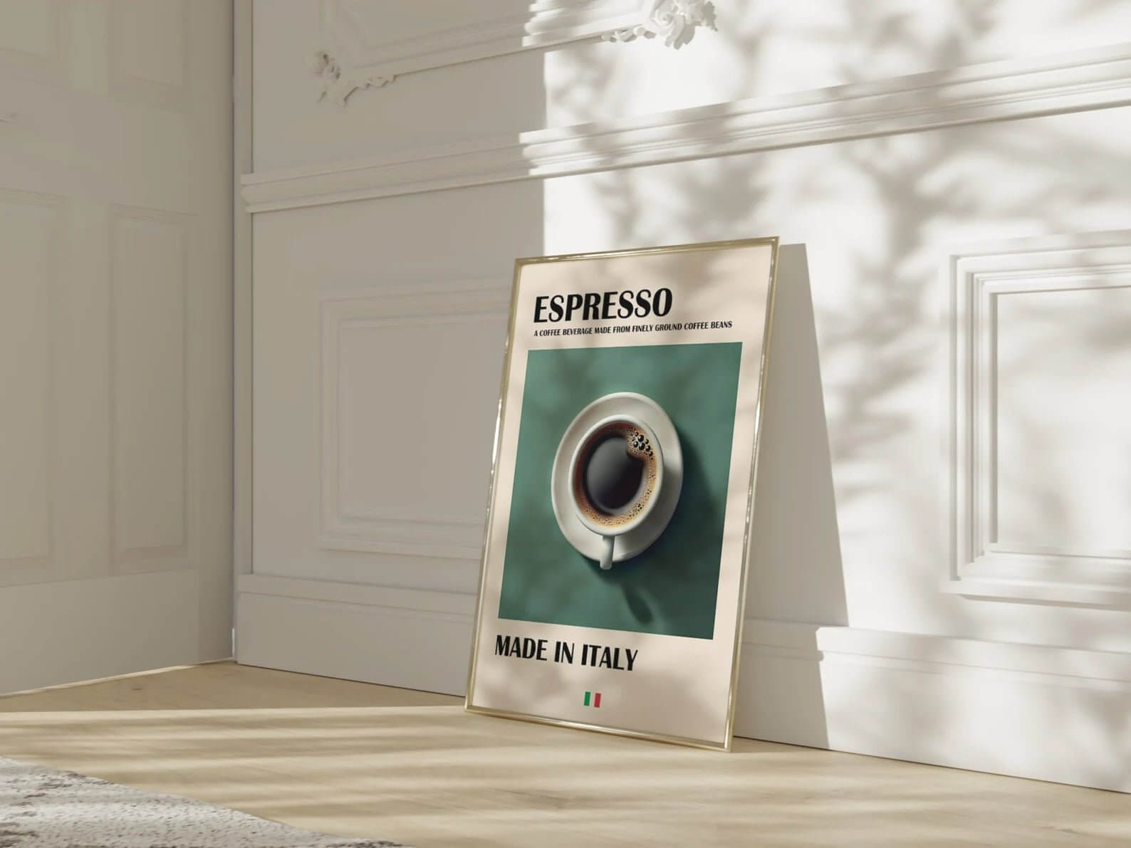 Give your kitchen a touch of Italian café atmosphere with the Espresso Made in Italy Poster . The motif shows an elegant coffee cup with freshly brewed espresso viewed from above, set against a stylish green background. The text “Made in Italy” and the small Italian flag emphasize the authentic origin of the espresso and make the design both decorative and iconic.
