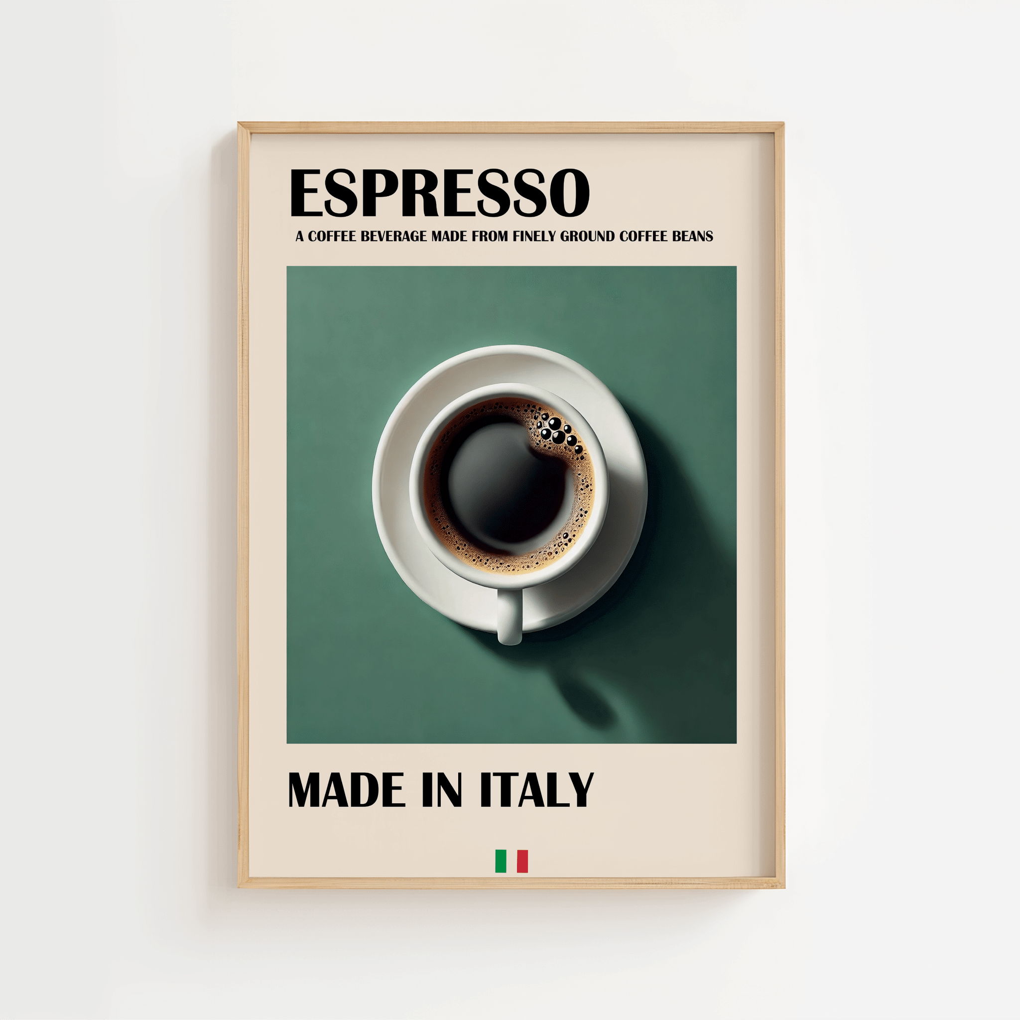 Giv dit køkken et strejf af italiensk caféstemning med Espresso Made in Italy Plakat. Motivet viser en elegant kaffekop med friskbrygget espresso set ovenfra, sat mod en stilren grøn baggrund. Teksten “Made in Italy” og det lille italienske flag understreger espressoens autentiske oprindelse og gør designet både dekorativt og ikonisk.
