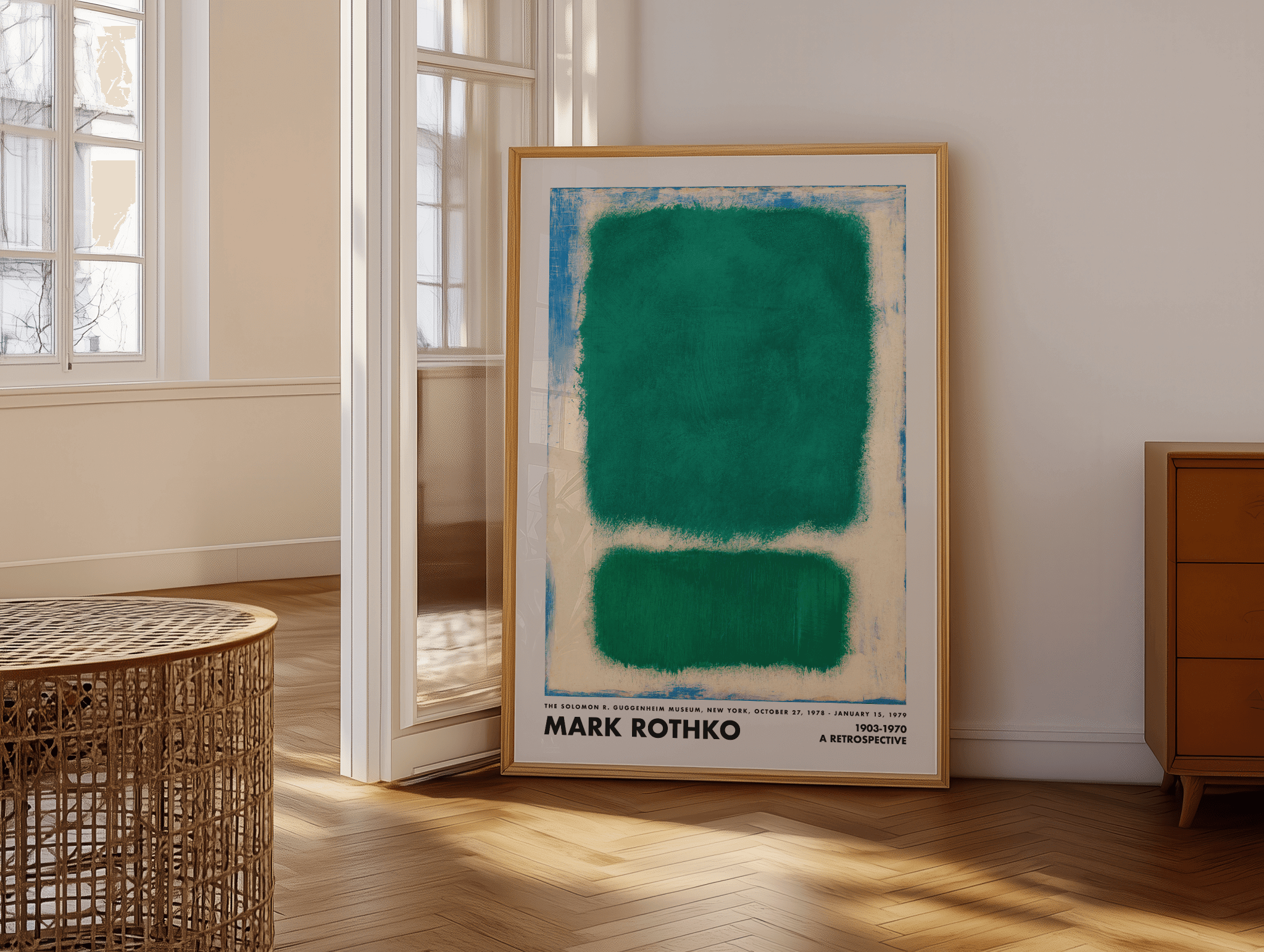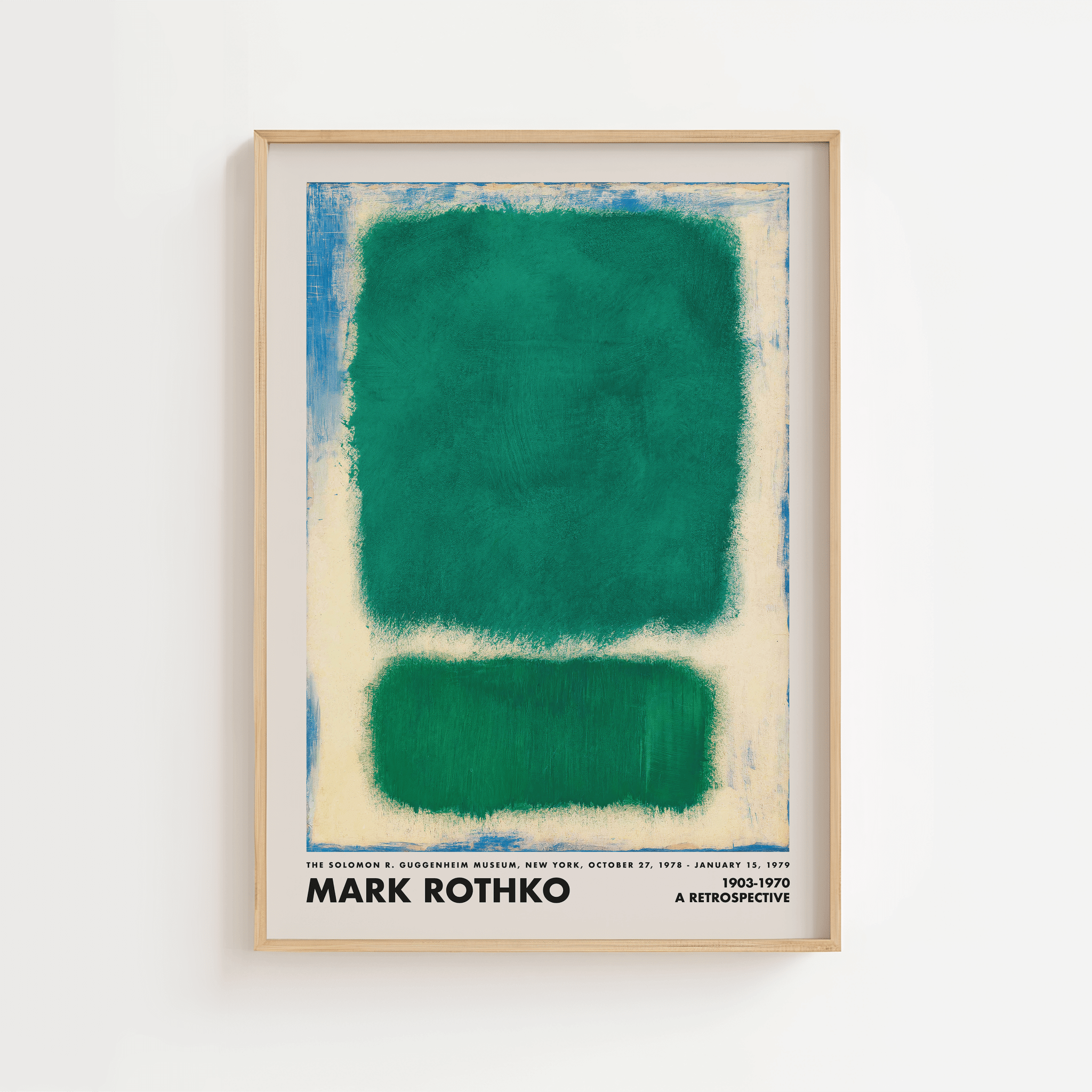 Emerald Horizons er en markant Mark Rothko plakat med to dybe, grønne farvefelter omgivet af rå, teksturerede kanter i creme og blå toner. Det organiske farvespil og de bløde overgange skaber en rolig, atmosfærisk følelse – klassisk for Rothkos ikoniske color-field stil.
