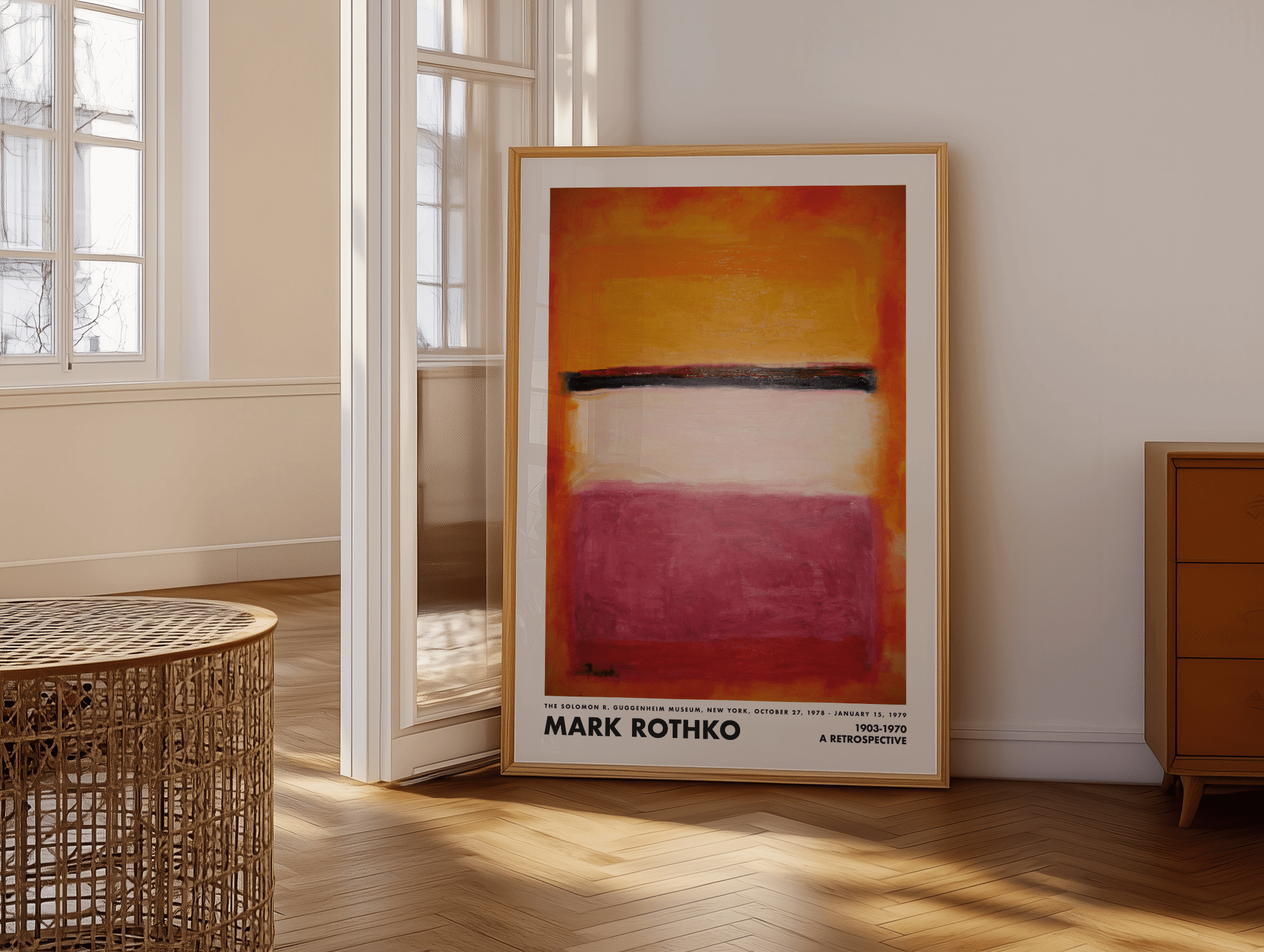 Tilføj varme, dybde og kunstnerisk karakter til din indretning med No.309 – Mark Rothko Plakat. Motivet kombinerer intense orange farver med et lyst, blødt midterfelt og et dybt rødviolet område. En markant, mørk vandret linje binder kompositionen sammen og giver plakaten et dramatisk og moderne udtryk.