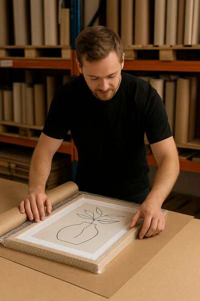Vi håndterer hver plakat med omhu og monterer den i elegante rammer.