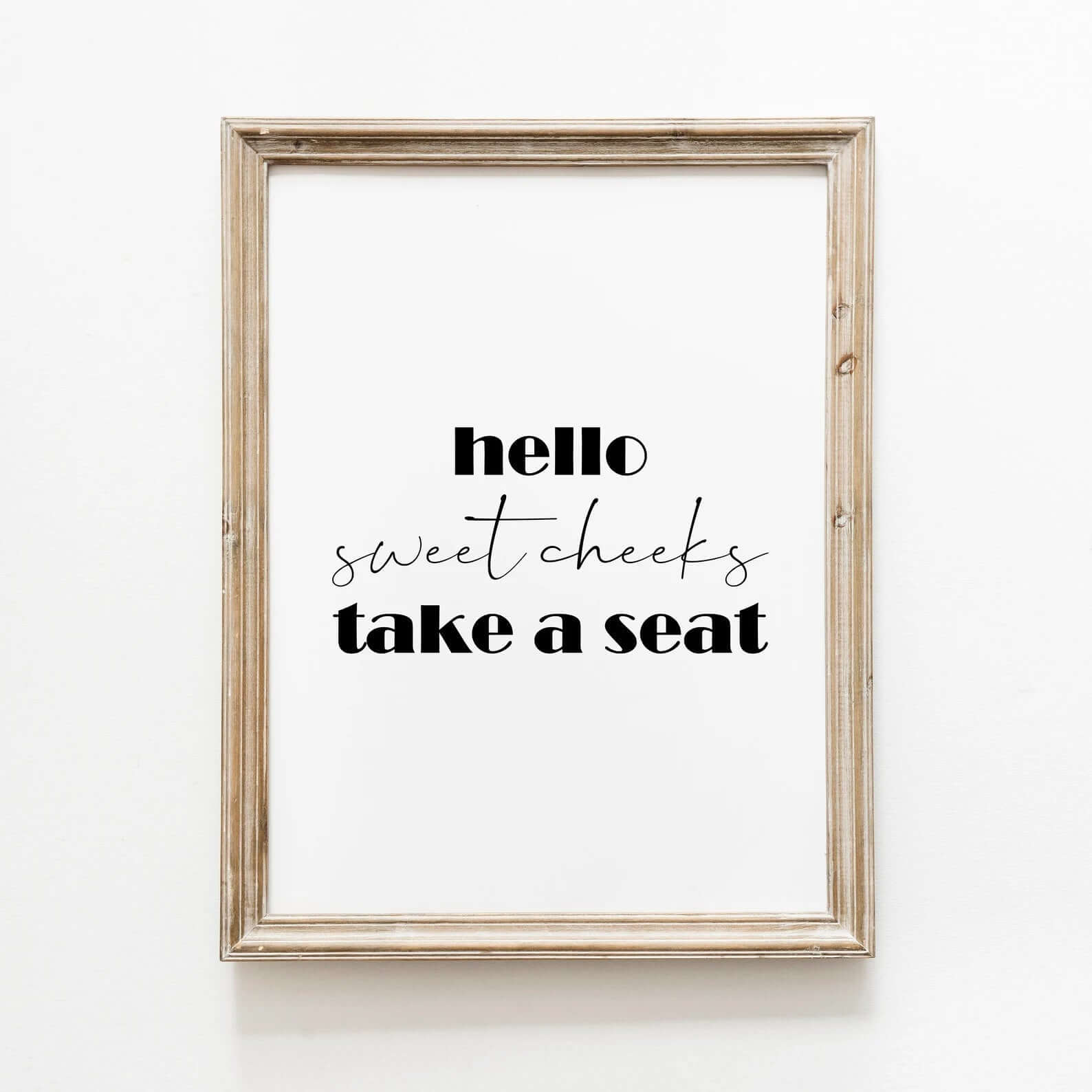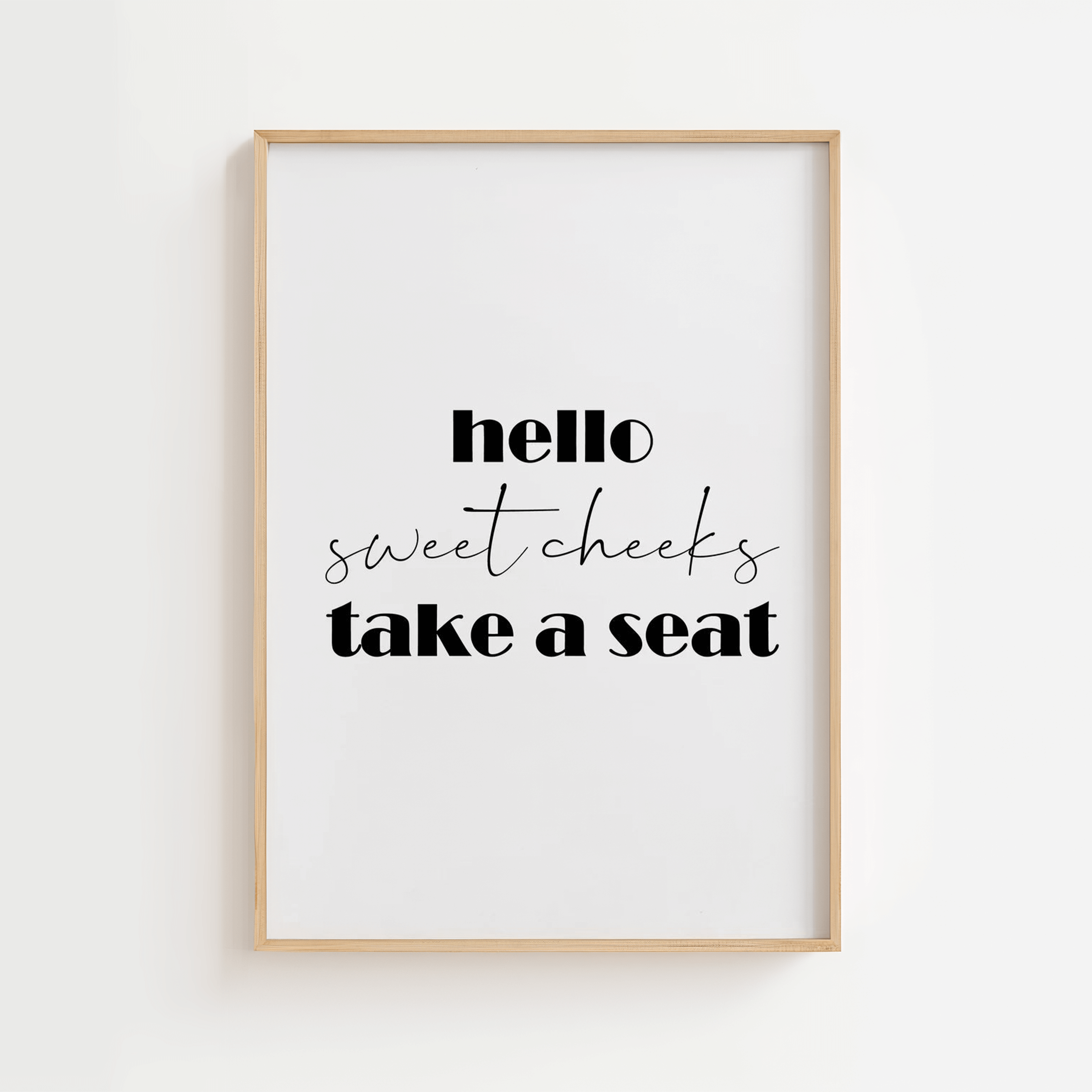 Bring humor into everyday life with this fun poster for the bathroom! The text "Hello Sweet Cheeks – Take a Seat" is both charming and a little cheeky, making it perfect for livening up the atmosphere in your toilet. The minimalist design fits into any interior, whether you're going for a modern, bohemian or retro style. A fun gift idea for a housewarming party or just to treat yourself. Printed on quality paper and available in several sizes.