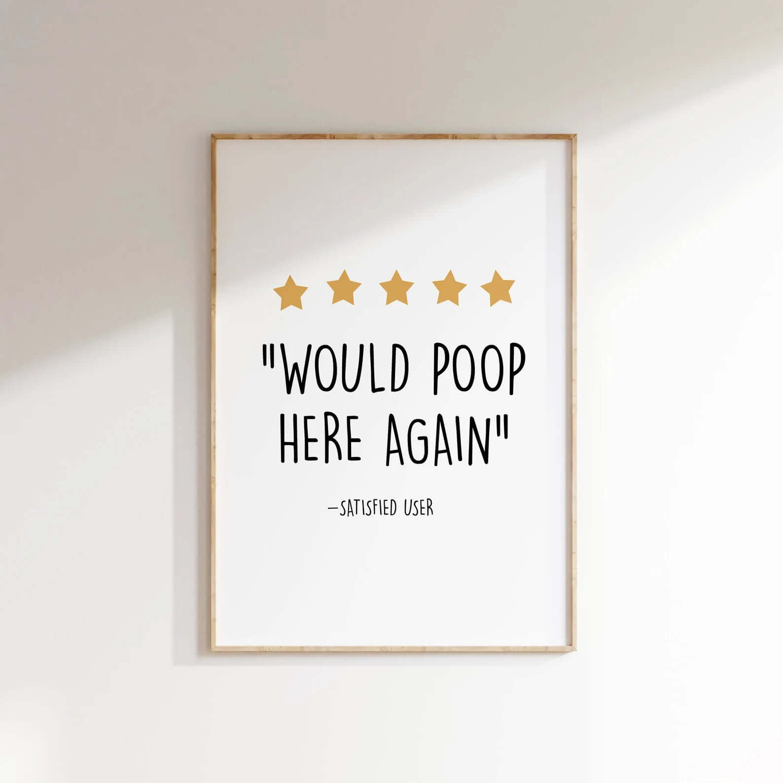 Would Poop Here Again is the perfect humor poster for the bathroom or guest toilet. With its clean design, warm colors and iconic 5-star review, the poster delivers a laugh – every single day.