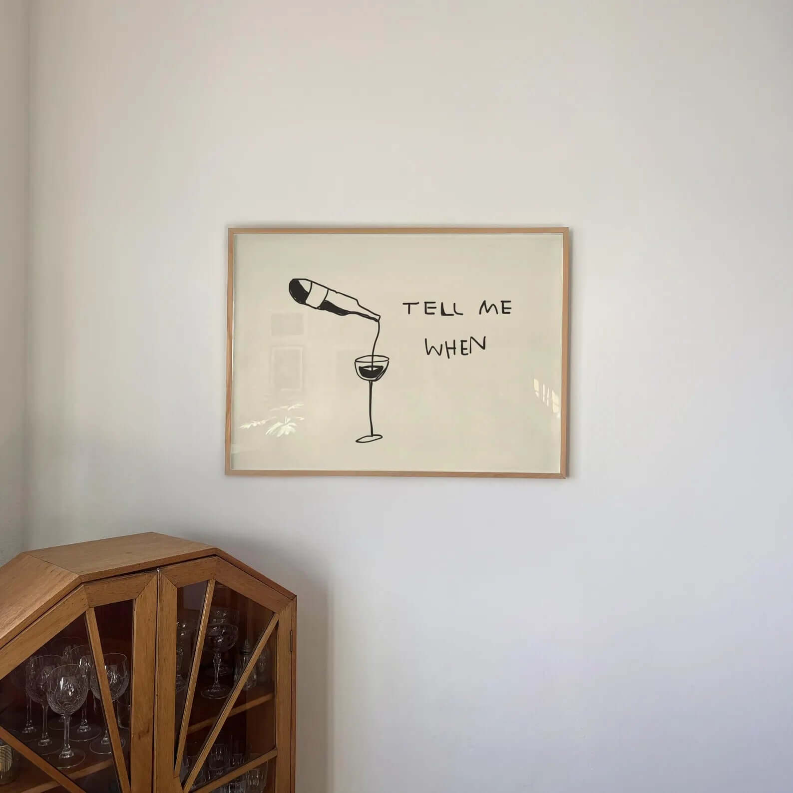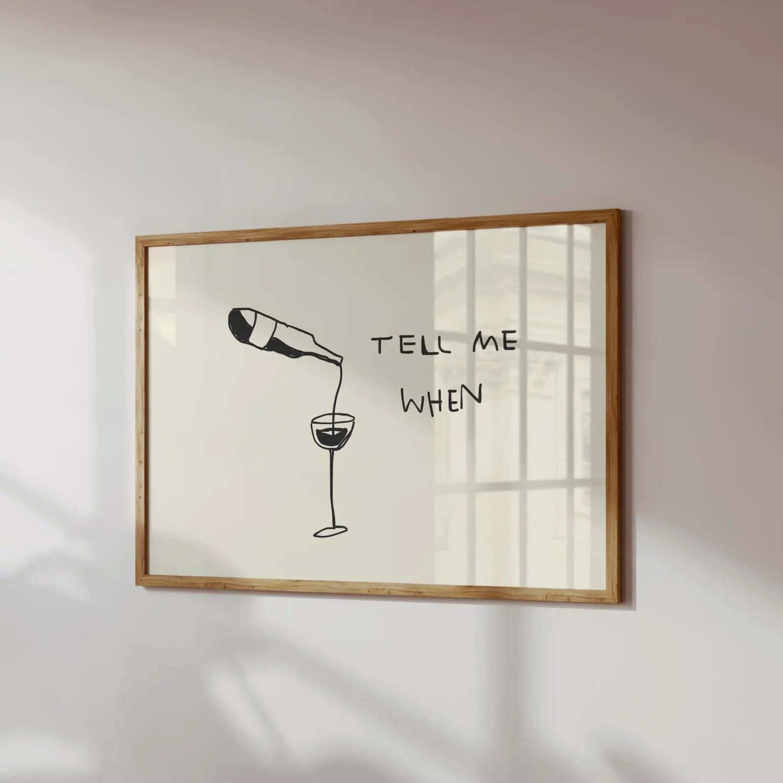 Tilføj et smil til væggen med Tell Me When Vinplakat – et minimalistisk og humoristisk motiv, der viser en vinflaske, der hælder i et vinglas, ledsaget af teksten “Tell Me When”. Den enkle stregtegning gør plakaten stilren og moderne, og den passer perfekt ind i både skandinaviske køkkener og hyggelige hjemmebarer.