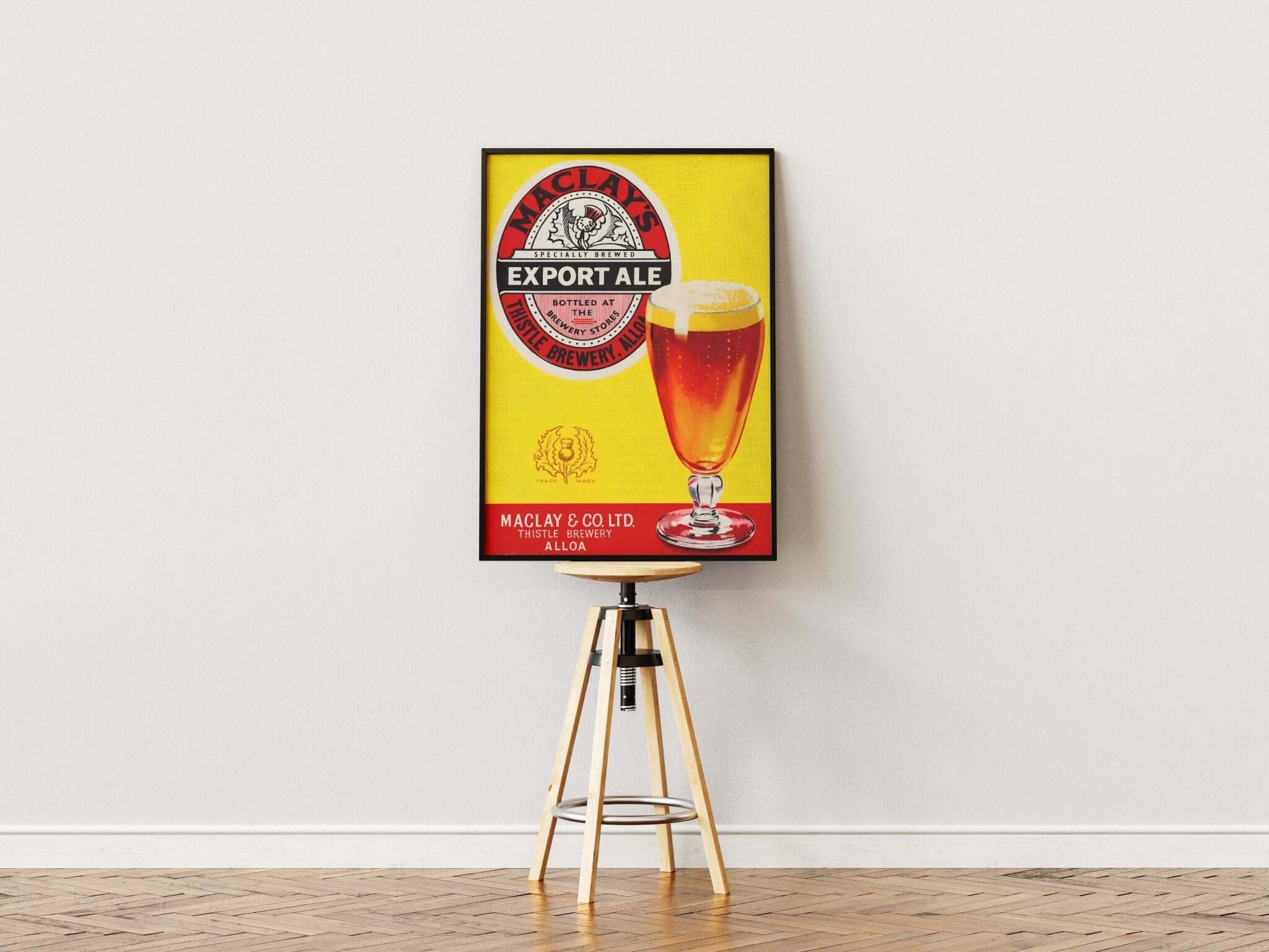 Bring the atmosphere of old British pubs into your living room with this brightly colored vintage poster of Maclay's Export Ale. With its strong yellow background, classic beer glasses and retro logo from Thistle Brewery, the poster is a must-have for beer lovers and collectors of old advertisements.