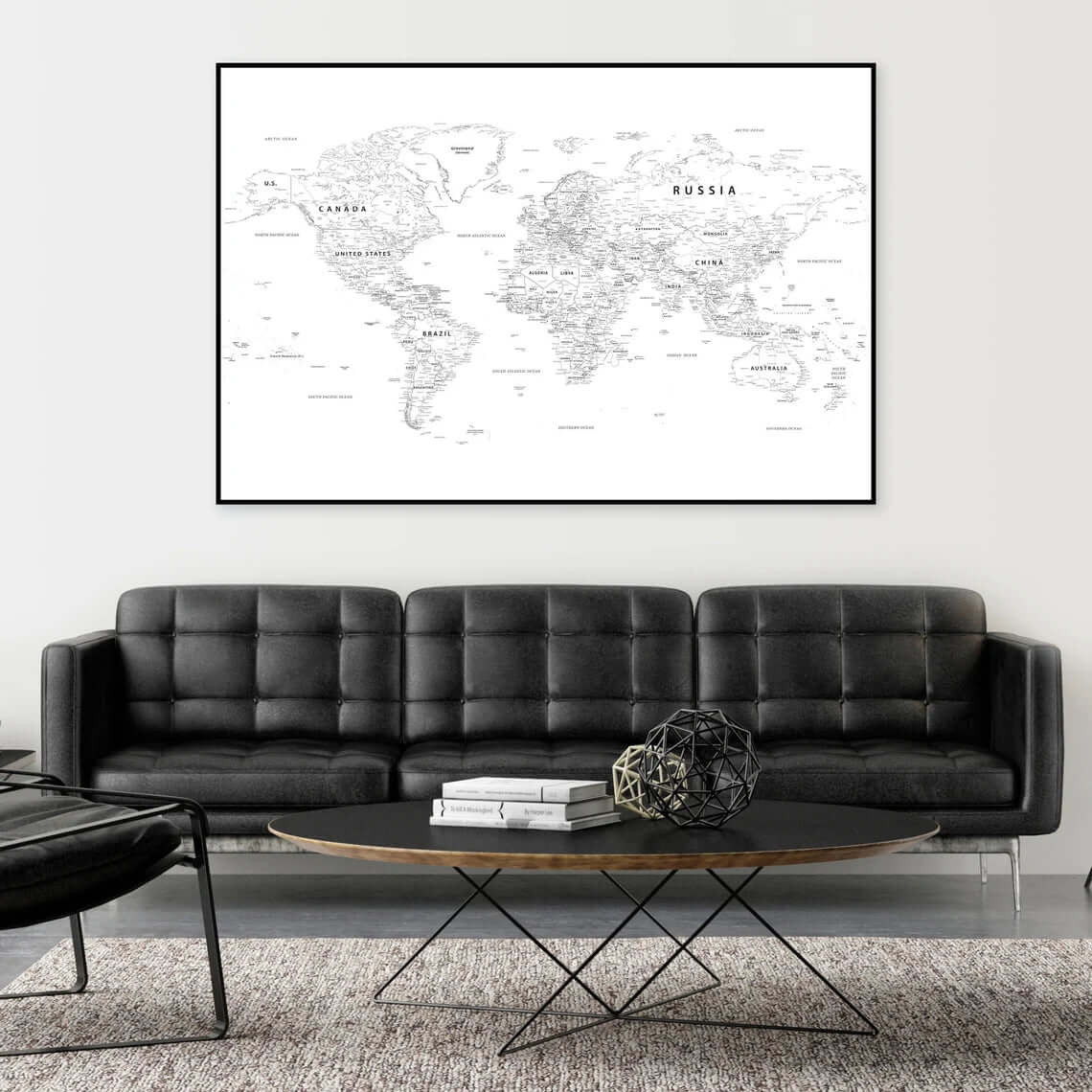 This stylish world map poster works beautifully on its own or as part of a larger picture wall where you want to add a global touch without disturbing the tranquility of the room.