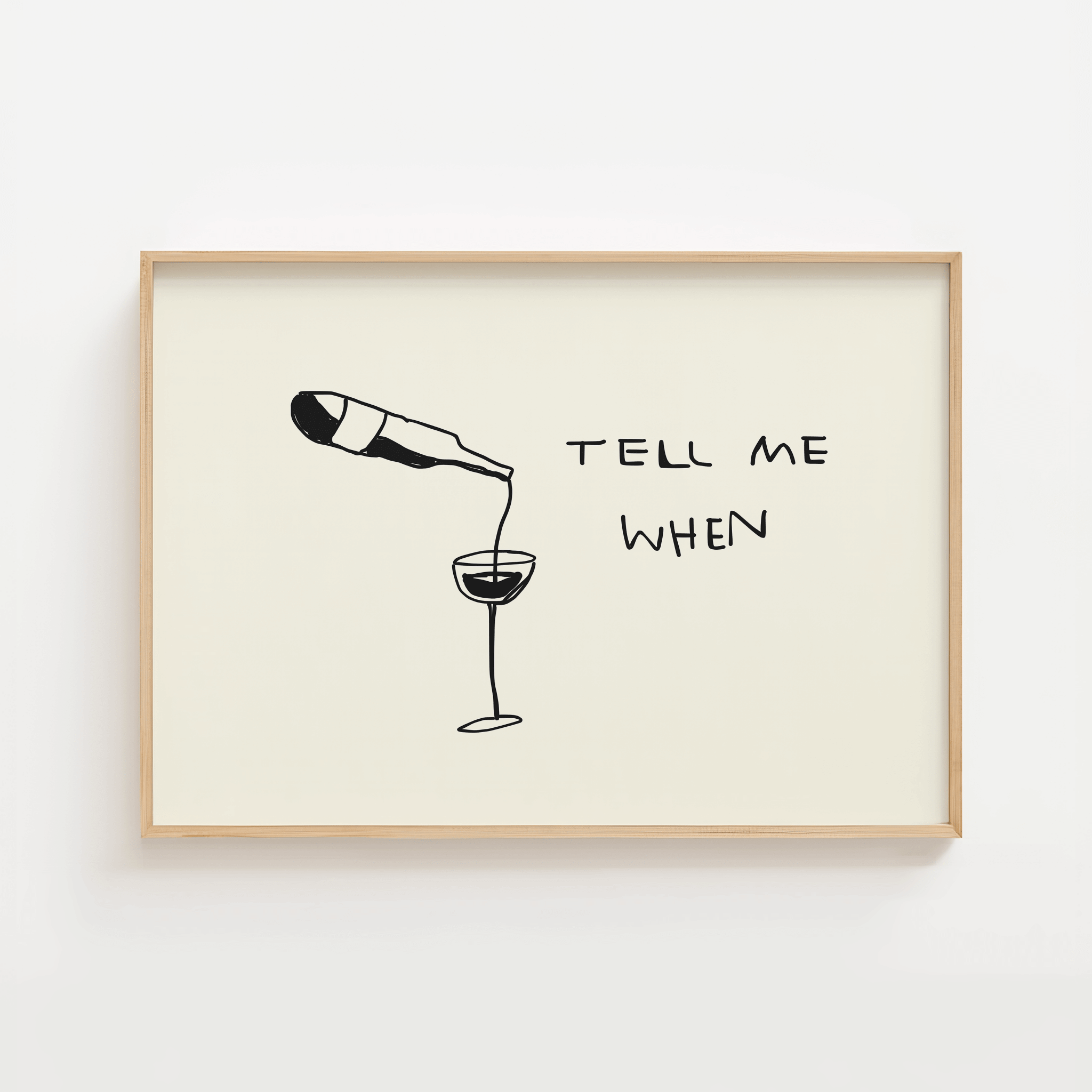 Tilføj et smil til væggen med Tell Me When Vinplakat – et minimalistisk og humoristisk motiv, der viser en vinflaske, der hælder i et vinglas, ledsaget af teksten “Tell Me When”. Den enkle stregtegning gør plakaten stilren og moderne, og den passer perfekt ind i både skandinaviske køkkener og hyggelige hjemmebarer.