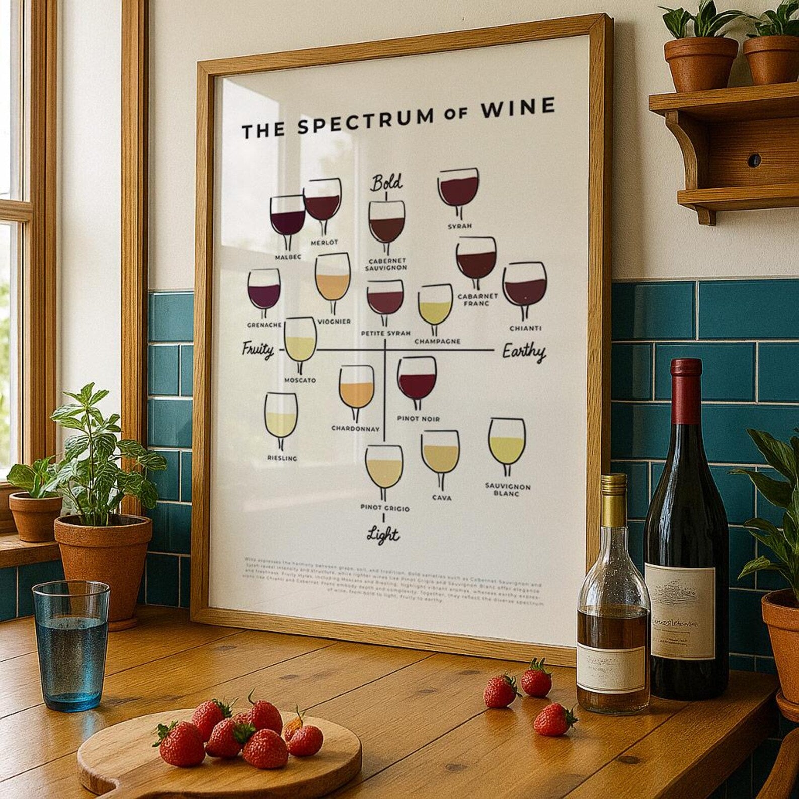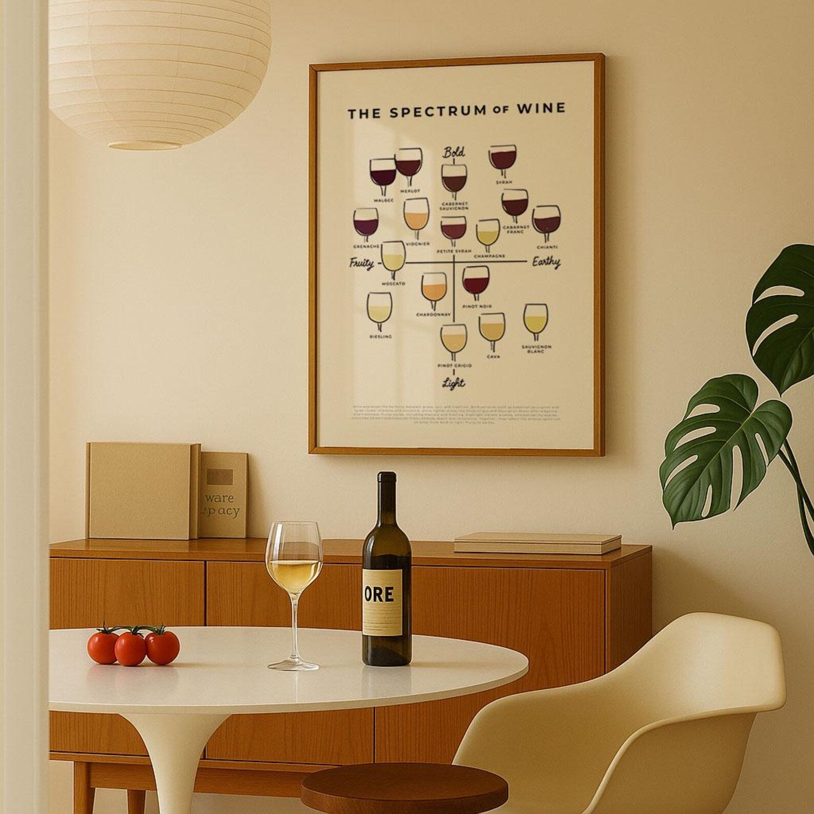 Gør din indretning både stilfuld og informativ med The Spectrum of Wine Plakat. Plakaten viser vinens smagsspektrum fra bold og earthy til fruity og light, illustreret med små vinglas i forskellige farver og vinvarianter som Merlot, Syrah, Viognier, Chardonnay og Pinot Grigio.