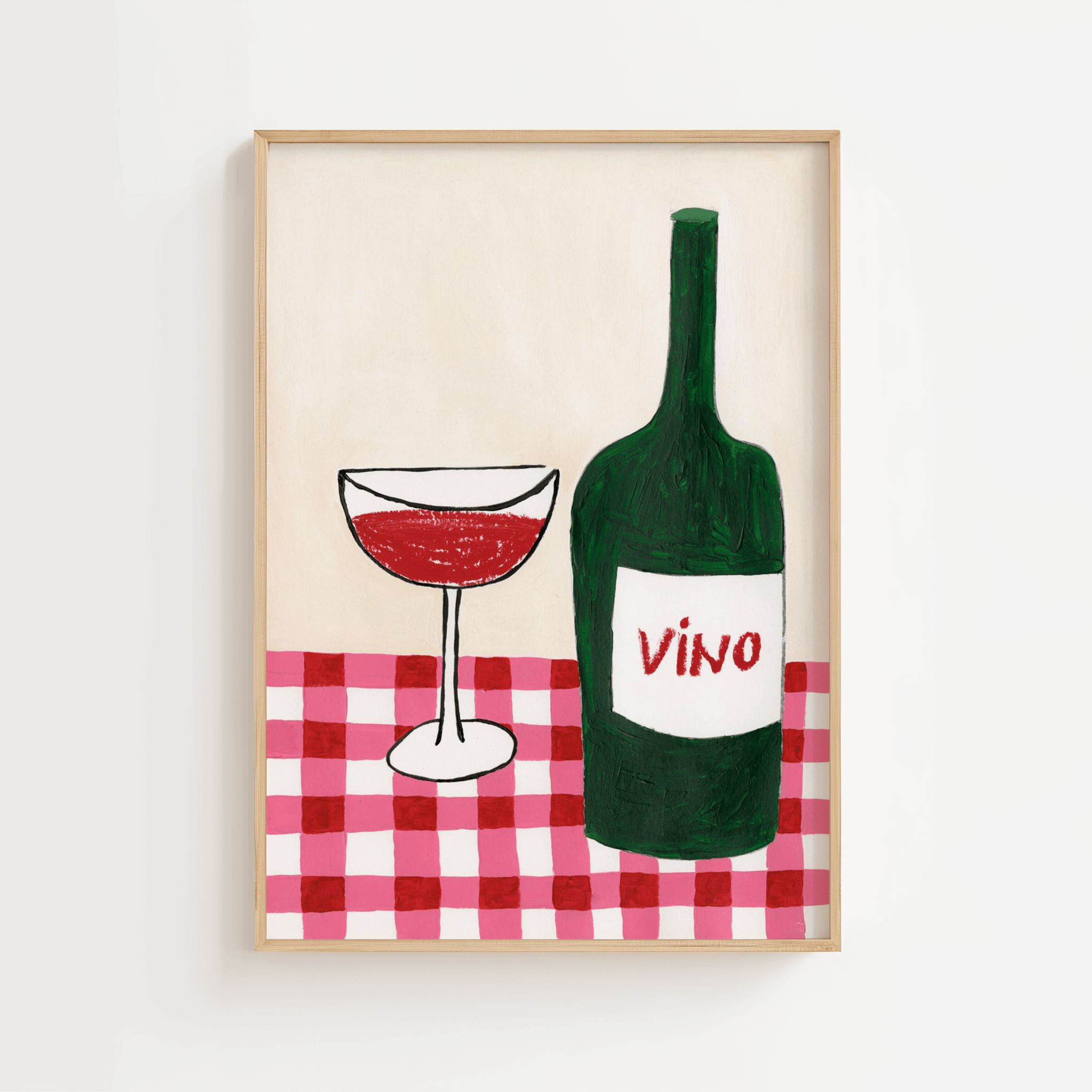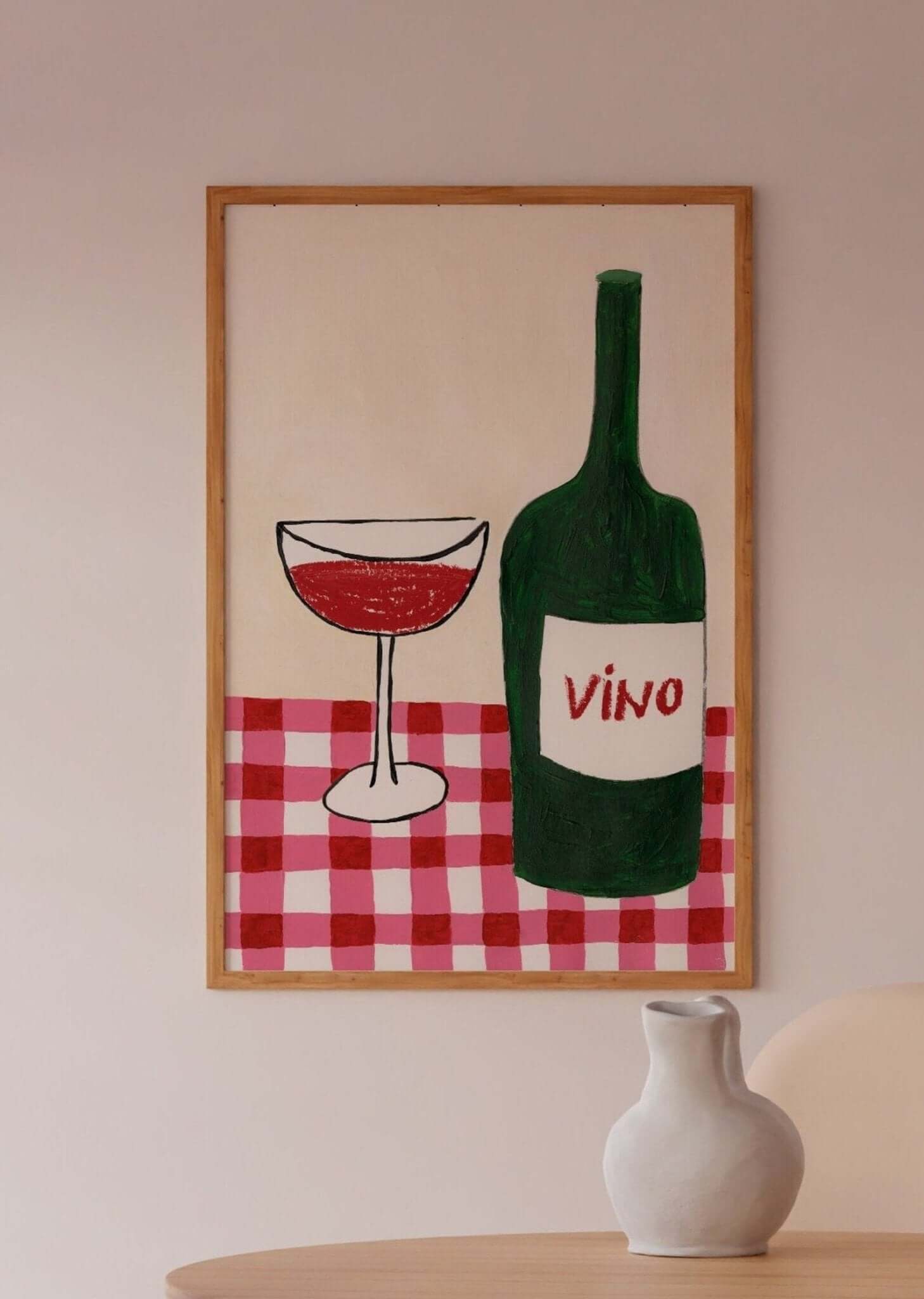 Tilføj varme, charme og italiensk stemning til dit køkken med VINO Plakat – Italiensk Vin Illustration. Plakaten viser en grøn vinflaske med teksten “Vino” og et glas rødvin, sat på en klassisk rød/hvid ternet borddug. Det håndmalede udtryk og de kraftige farver giver motivet en autentisk, retro-inspireret vibe, som passer perfekt til både moderne og hyggelige køkkenmiljøer.