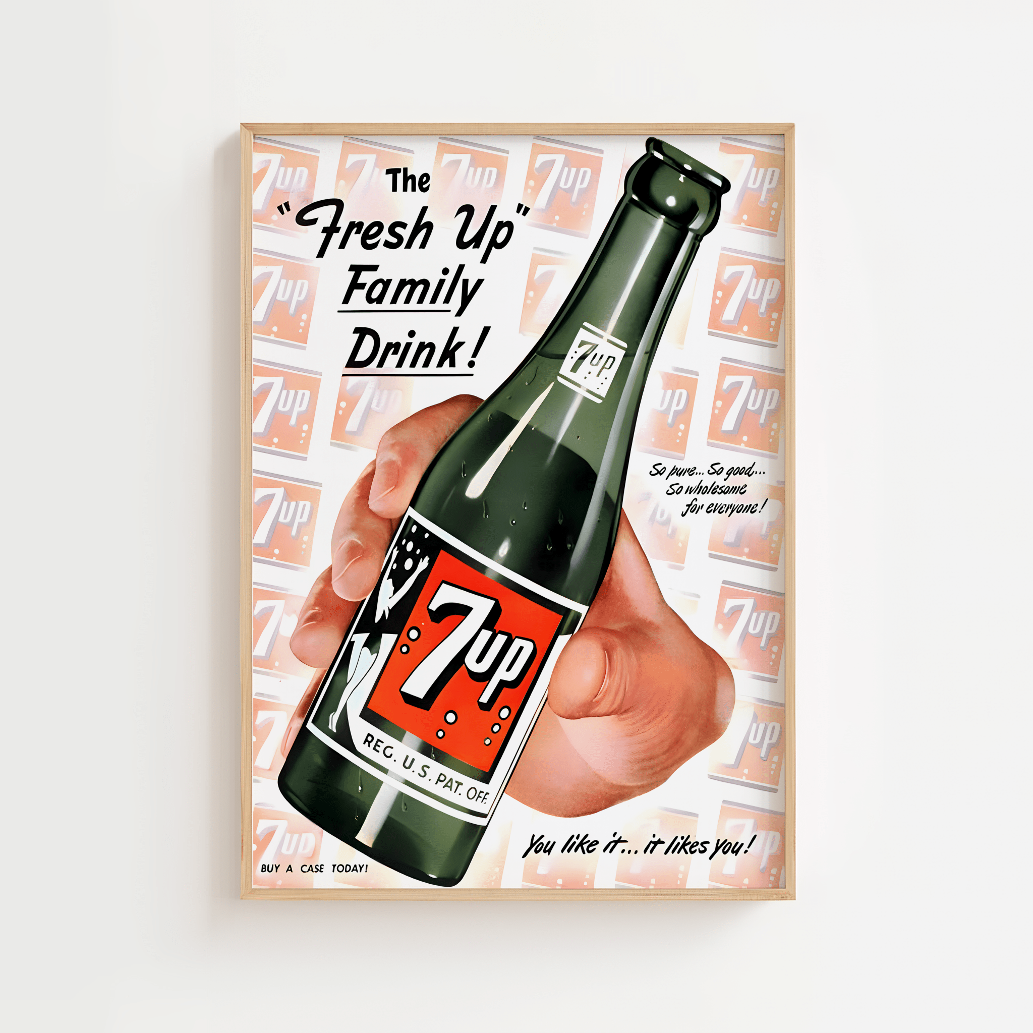 Bring a touch of American retro charm into your home with this iconic vintage 7up poster. Dating back to the 1950s, the poster features a classic bottle with the text "You like it... it likes you!" - a timeless slogan from the colorful advertising universe of the time. The background is decorated with repetitions of the original 7up logo, giving the poster a vibrant and playful look.