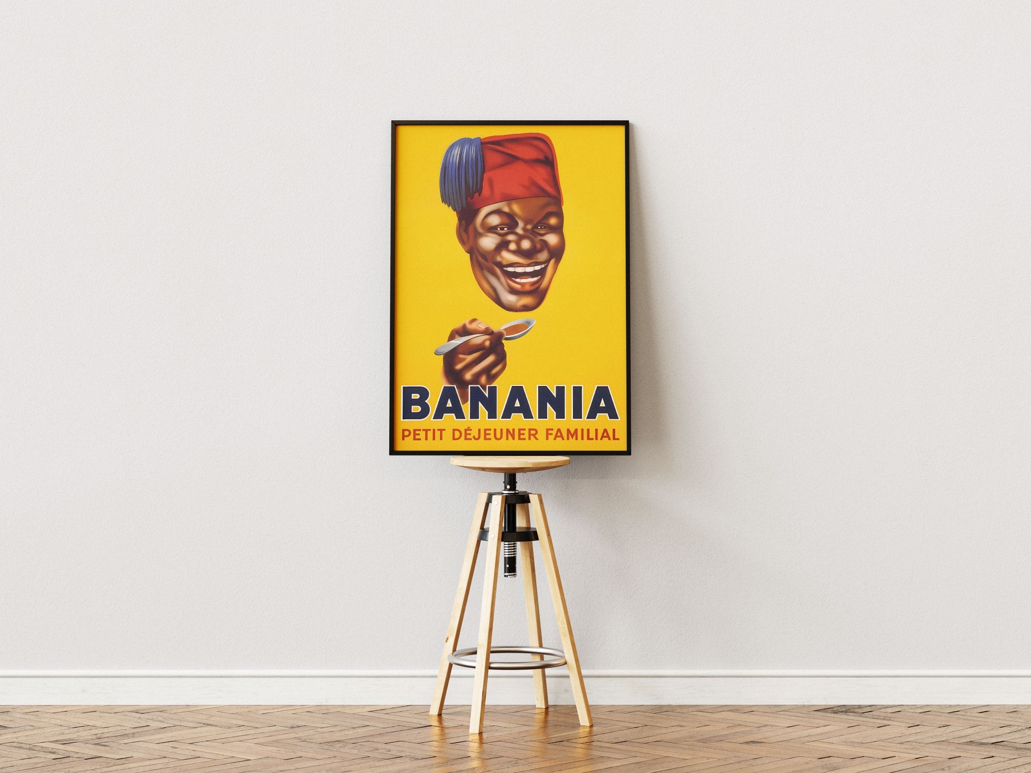 This colorful and iconic vintage poster advertises the French breakfast product Banania and originally dates back to the early 20th century. The motif depicts a smiling man with a red fez and blue tassel, lifting a spoon - an image that has become one of the most recognizable in French advertising history. With its strong yellow background and bold typography, the poster catches the eye and evokes nostalgia. A decorative classic for the kitchen, dining area or collector of European advertising posters with character.