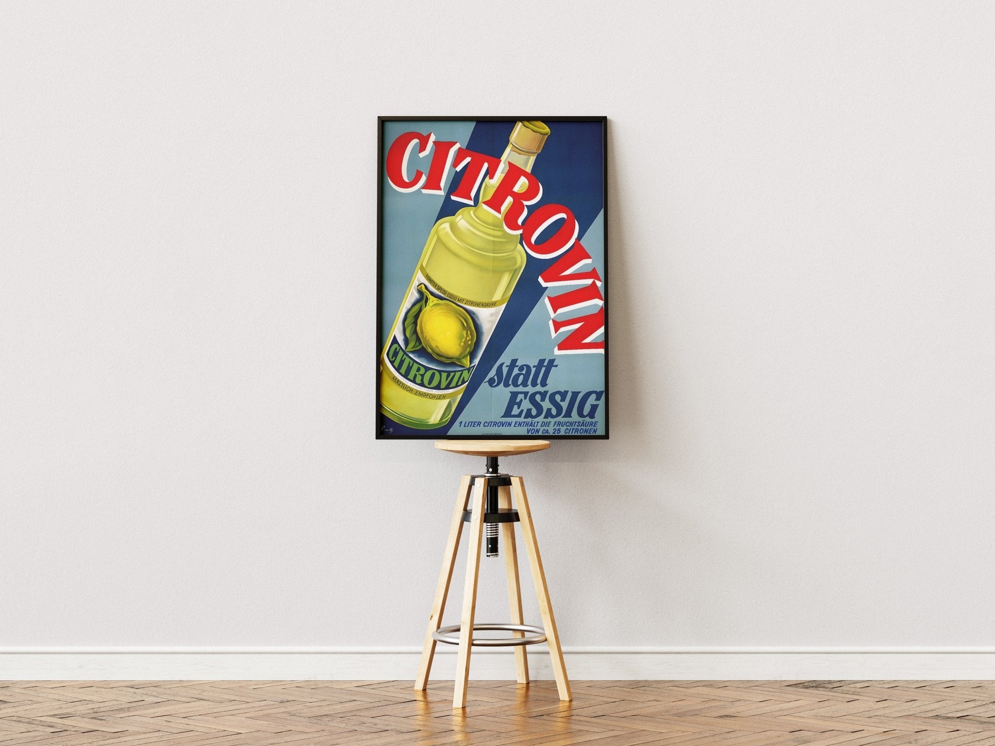 Bring color and German nostalgia into your home with this eye-catching Citrovin poster. The poster is an authentic vintage advertisement for lemon essence – a classic household item from Germany. The graphic expression combines blue and yellow shades with strong typography and a large lemon bottle at an angle, giving the poster a modern and humorous retro look. It is perfect for the kitchen, as a wall decoration in the café or for those who love food art and old advertisements. A unique gift idea for food nerds and retro lovers.