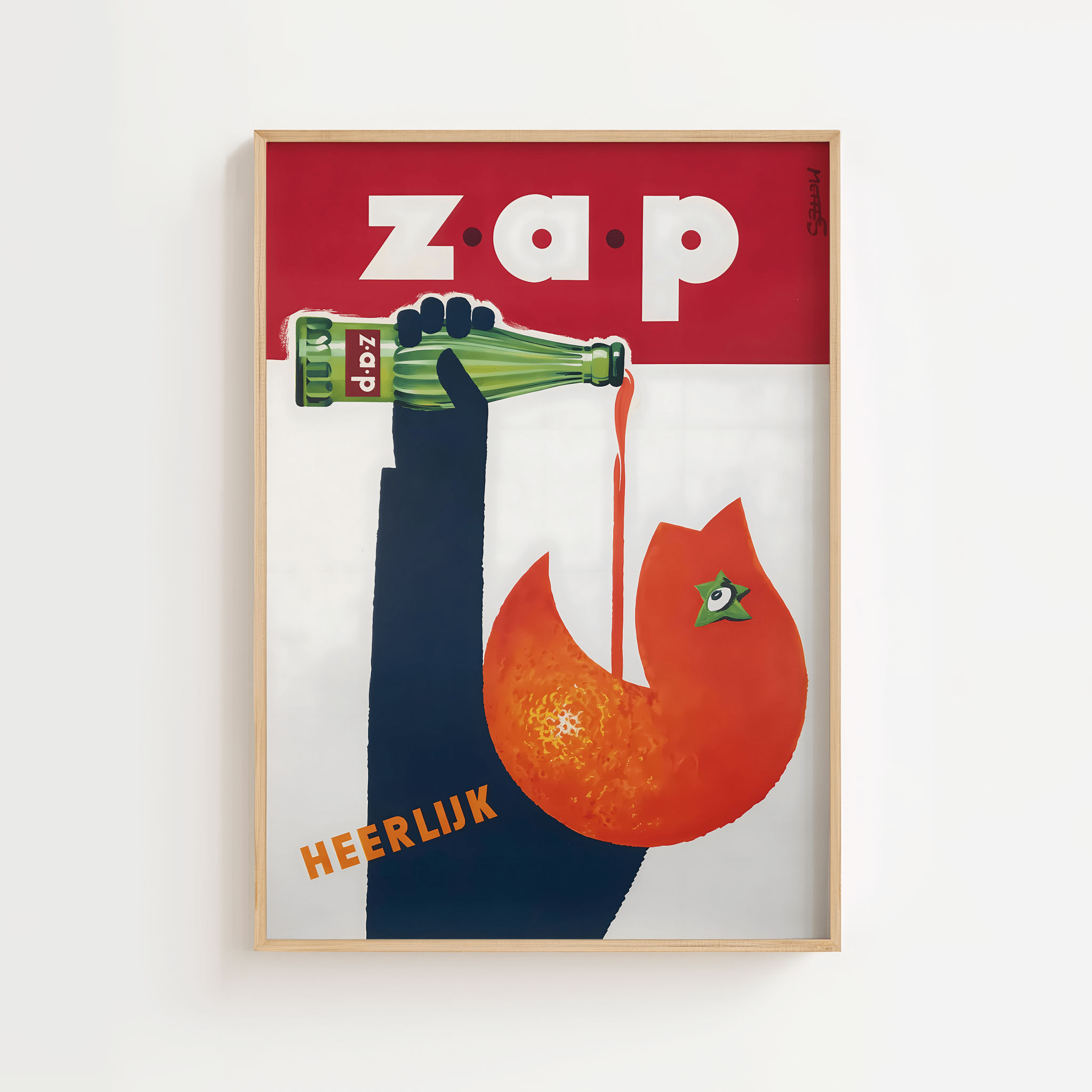 Bring life and energy into your home with this colorful Zap orange juice poster. The vintage design comes from an old advertisement and exudes nostalgia, charm and a 50s vibe. With its strong visual expression and retro bottle, it is perfect for those who love classic graphic design.