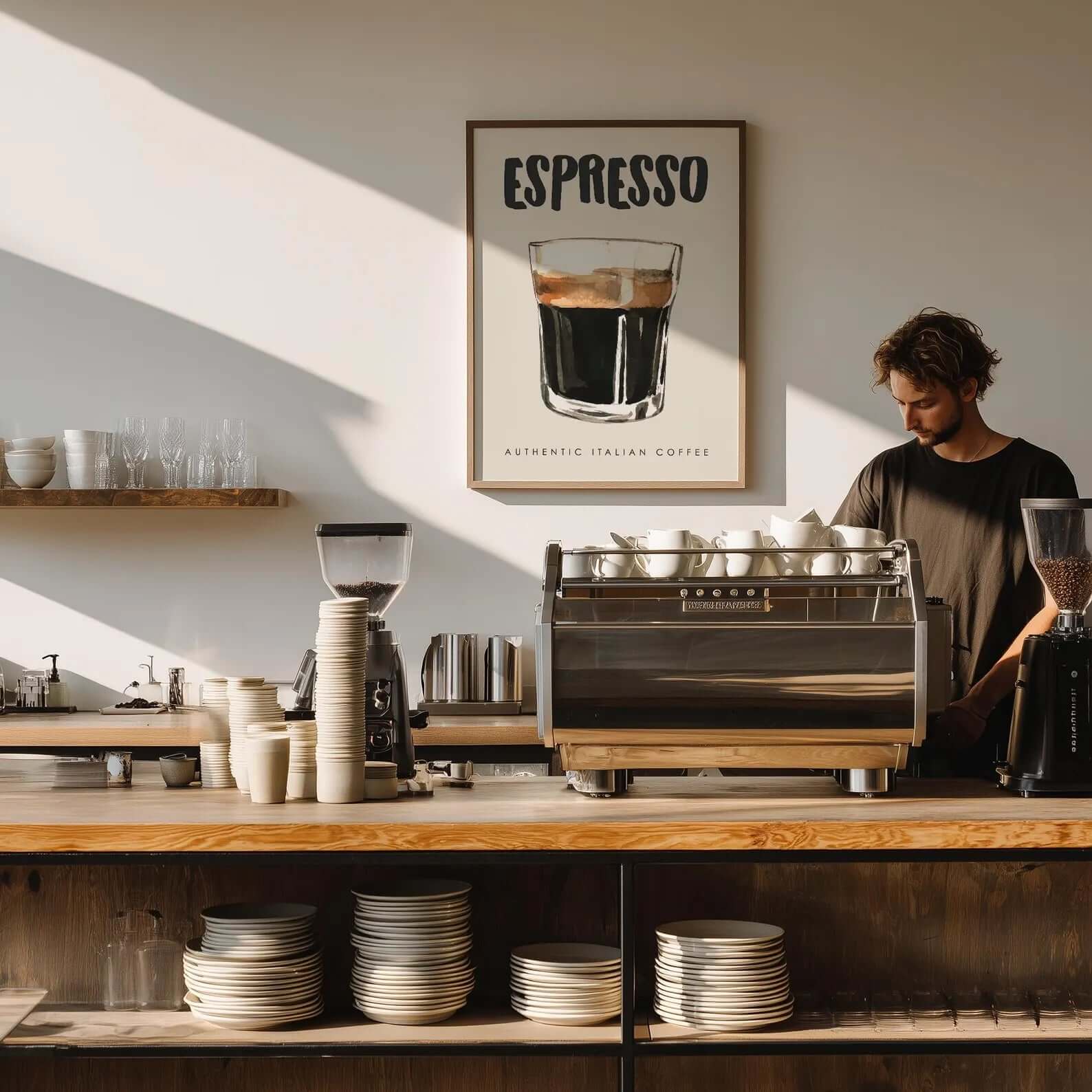 Opgrader dit køkken med denne elegante Espresso Authentic Italian Coffee Plakat. Motivet viser et håndmalet akvarelglas fyldt med dyb espresso og en smuk, gylden crema, kombineret med tydelig typografi og teksten “Authentic Italian Coffee”.