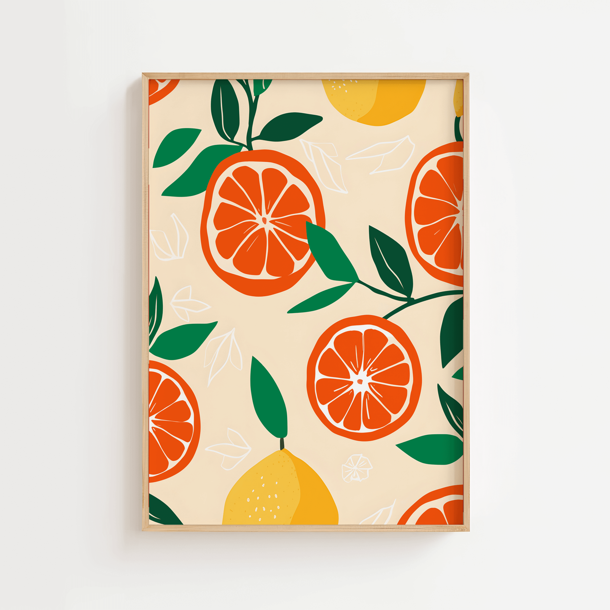 Gør dit køkken eller spisestue mere frisk og indbydende med Citrus Fruits Plakat. Motivet viser saftige appelsiner og citroner i et legende grafisk design med grønne blade og en lys baggrund.
