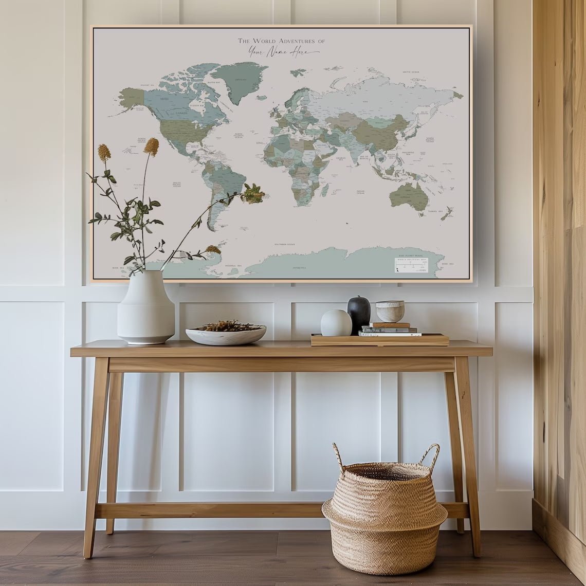 Dieses Weltkartenposter eignet sich ideal als großflächiger Blickfang an der Wand oder als Teil einer inspirierenden Kunstwand, an der globale Perspektive und schlichte Eleganz aufeinandertreffen.