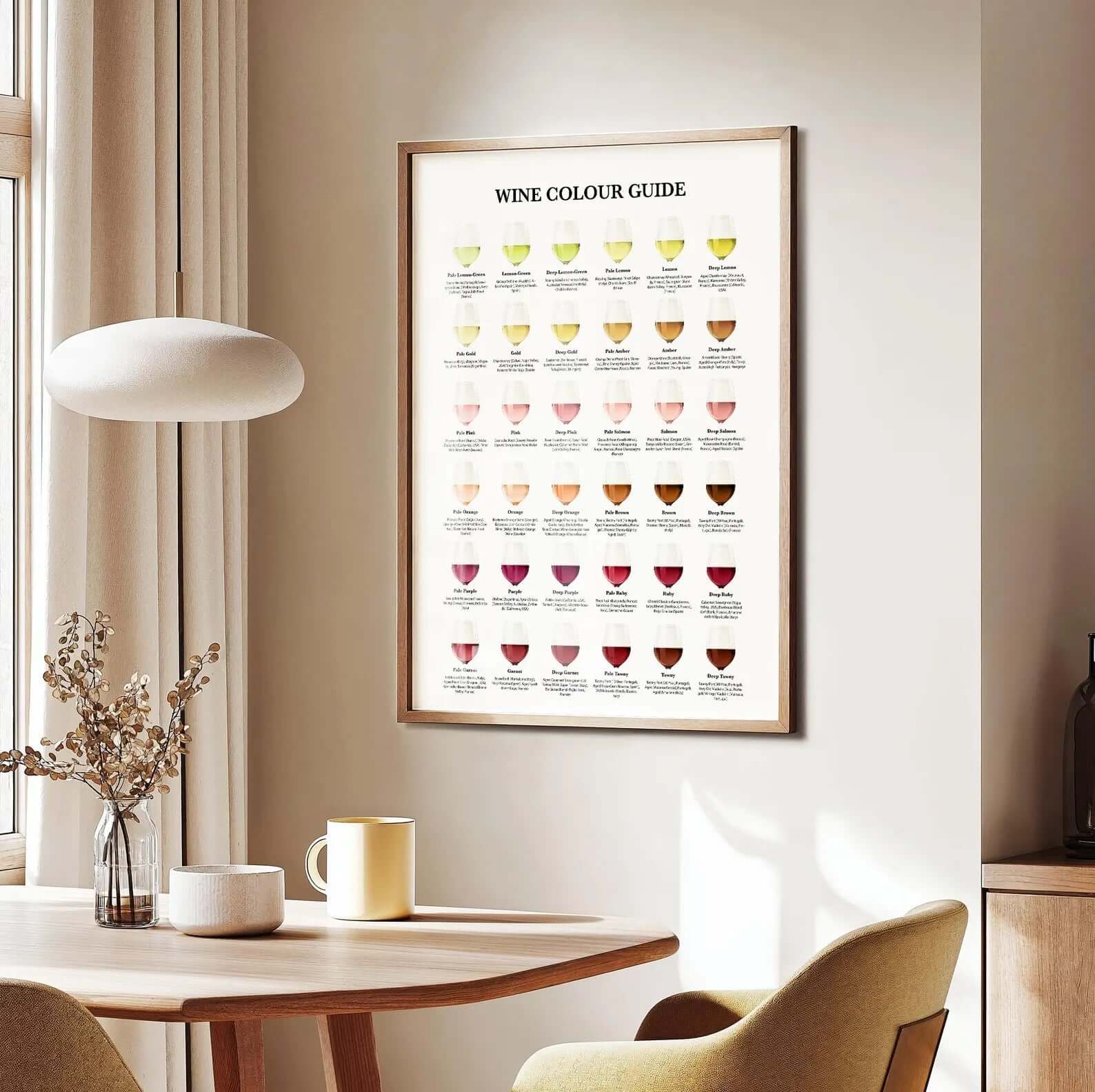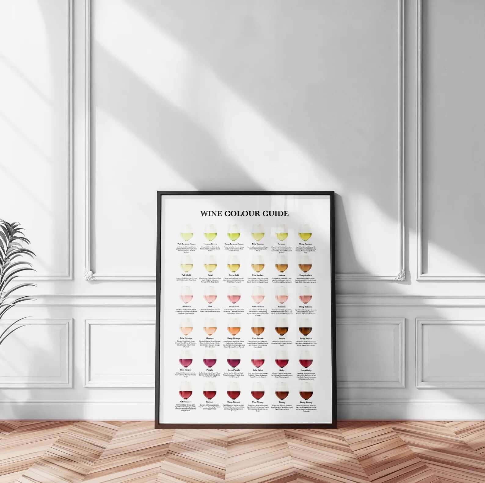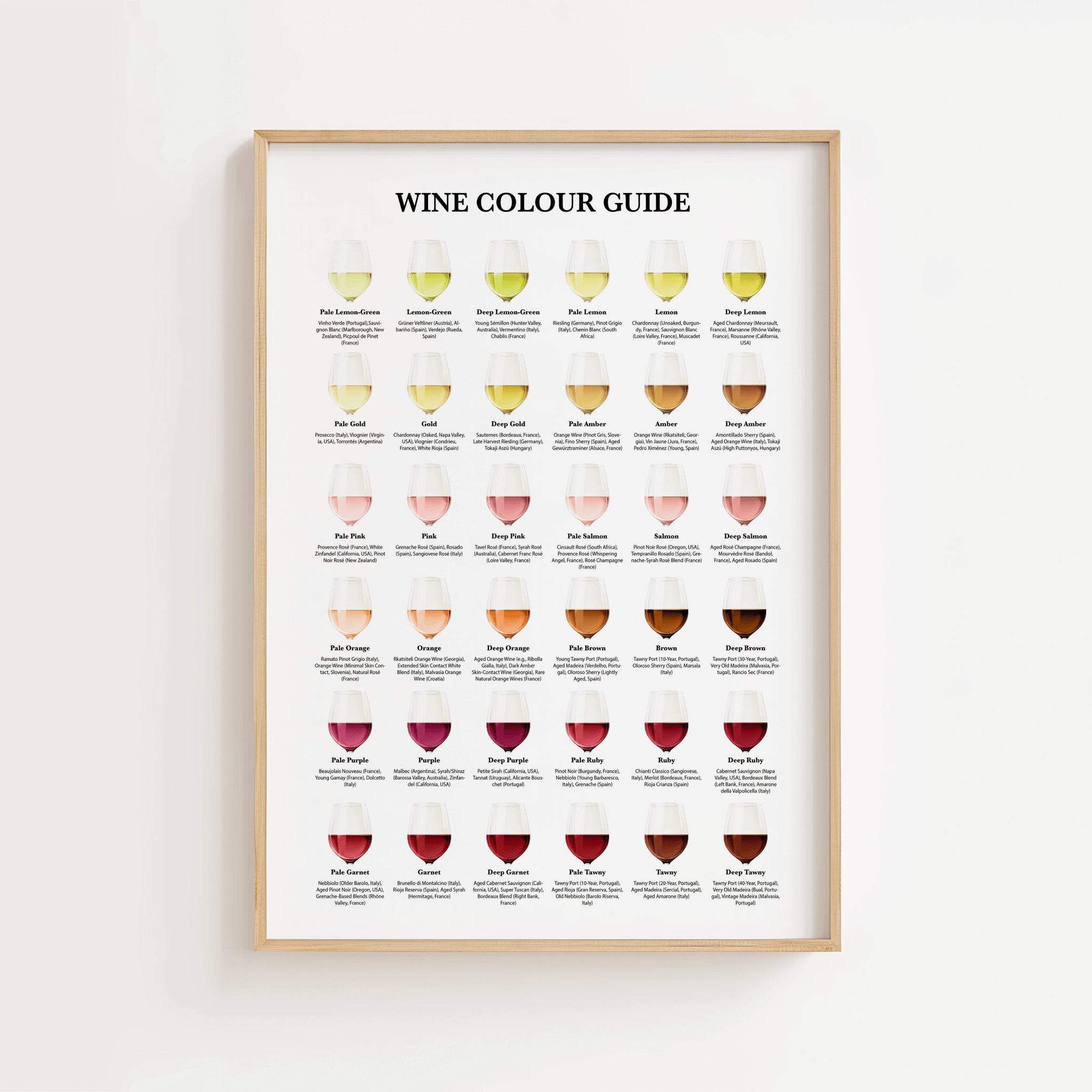 Opgrader dit køkken eller hjemmebar med denne Wine Colour Guide Plakat – en smuk og informativ oversigt over forskellige vinfarver fra hvidvin og rosé til fyldige rødvine. Plakaten viser hver nuance i et stilrent glasikon med letlæselige beskrivelser, der gør den både dekorativ og lærerig.