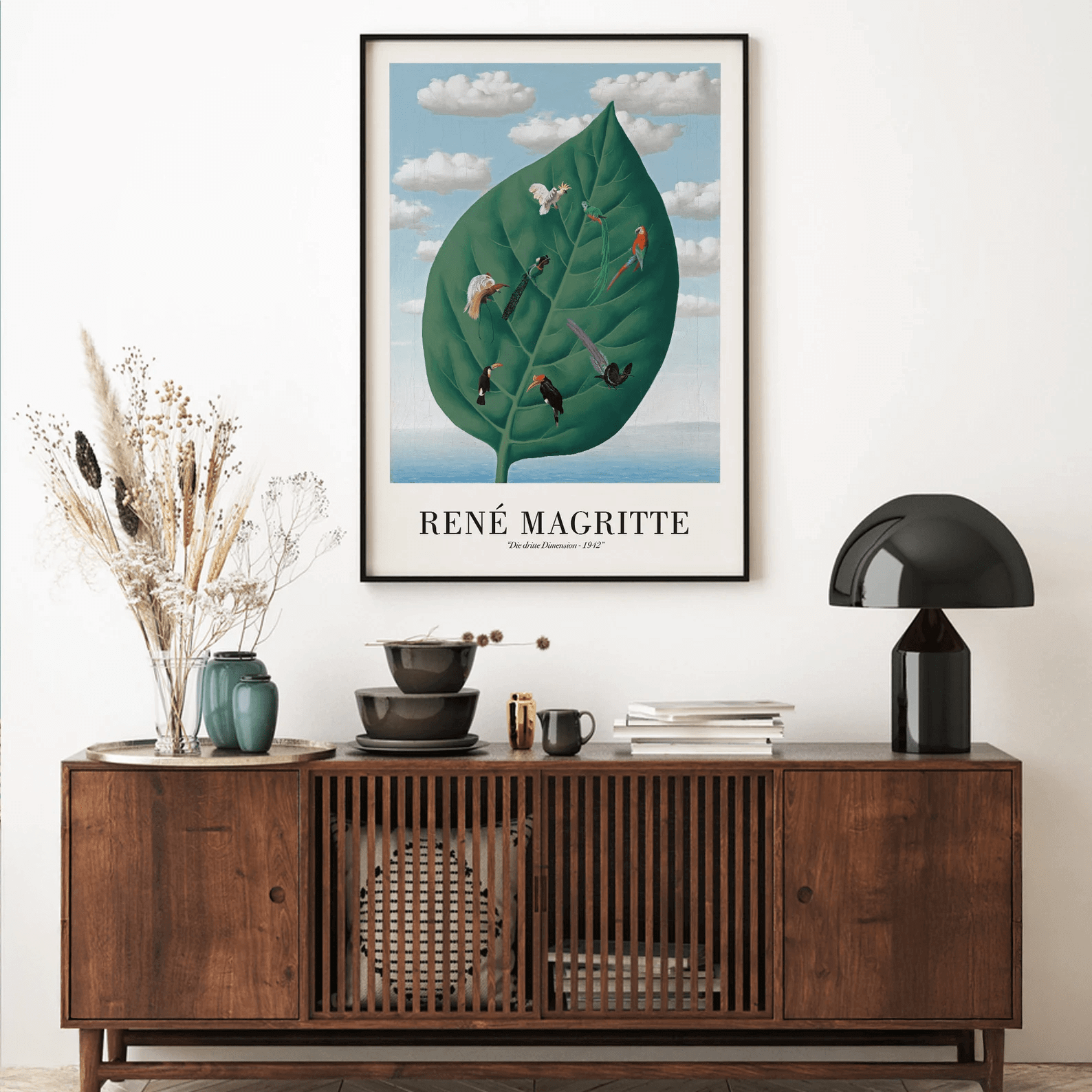 "Birds in the Leaf – René Magritte Poster" is a breathtaking tribute to the surrealist art universe. The poster depicts a large green leaf, with birds placed on the veins of the leaf as on a branch – set against a clear sky with clouds. This visual poem transforms the logic of nature into artistic magic and brings both a playful and poetic expression to the home. Perfect as a conversation piece or as an artistic eye-catcher in the living room