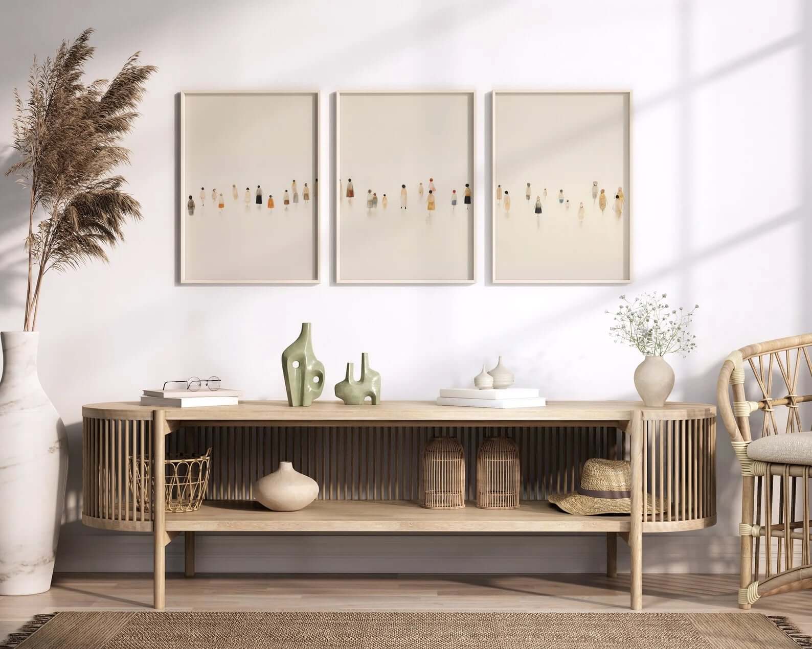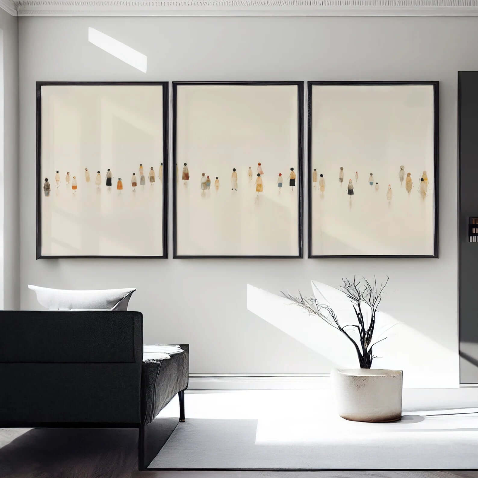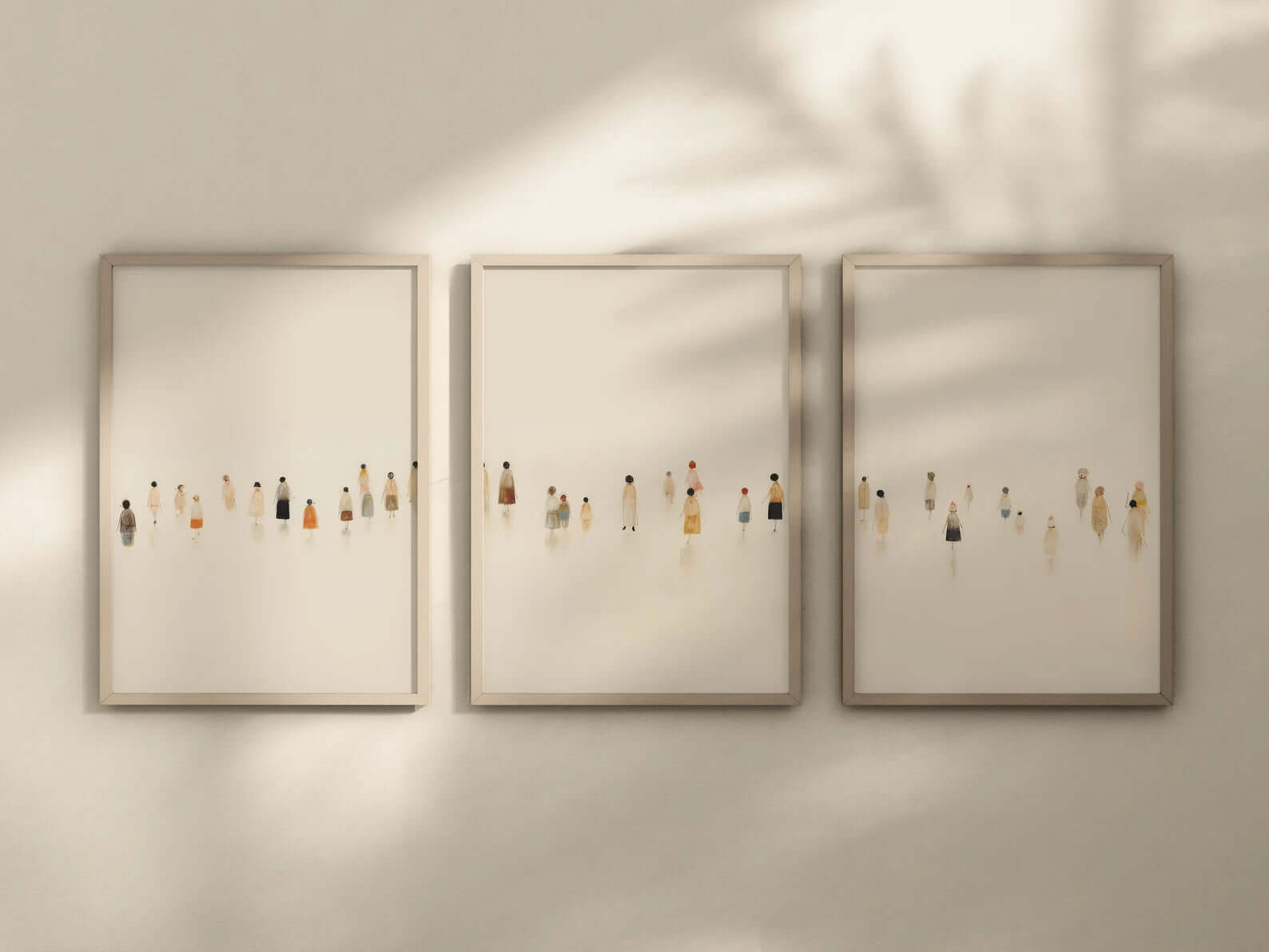 Soft Figures Billedvæg er en moderne og stemningsfuld billedvæg bestående af tre matchende plakater med små, stiliserede figurer i rolige beige og varme jordtoner. Det minimalistiske udtryk kombineret med de fine menneskelige detaljer skaber en rolig, poetisk stemning, der inviterer til fordybelse.
