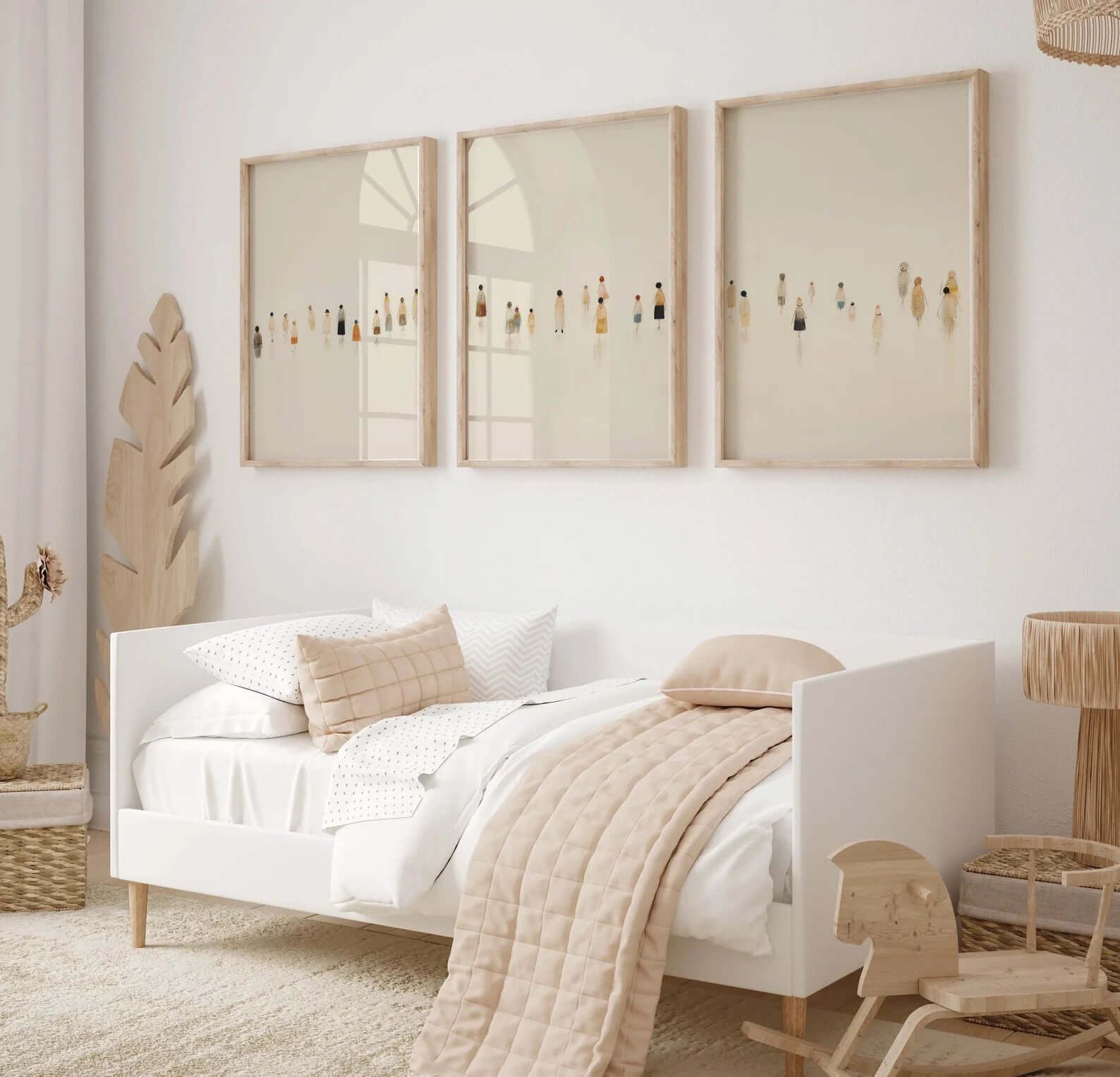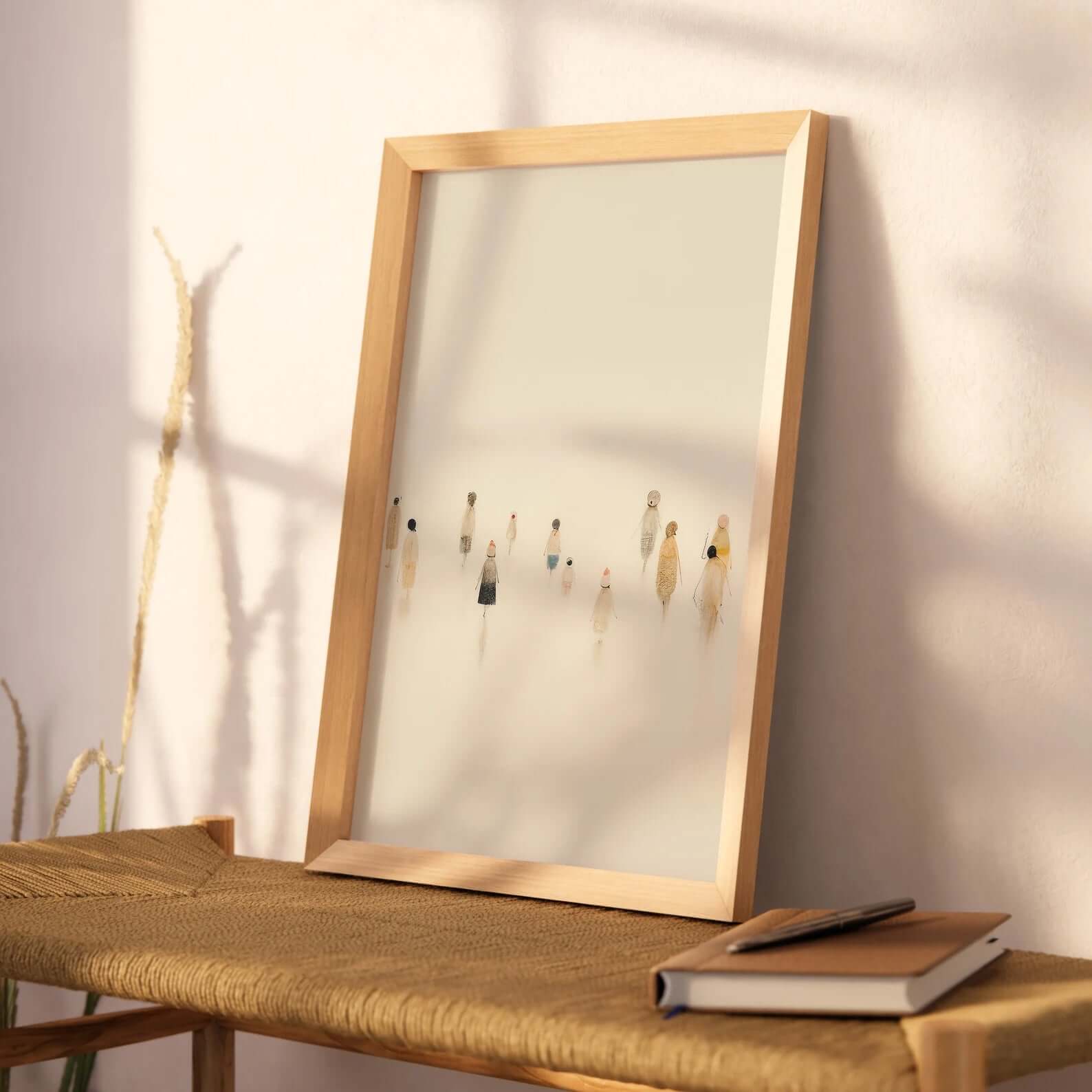 Plakaterne har masser af luft og negative flader, hvilket gør billedvæggen let og elegant – perfekt til moderne, skandinaviske og boho-inspirerede hjem. De små figurer tilfører varme og personlighed uden at virke forstyrrende.