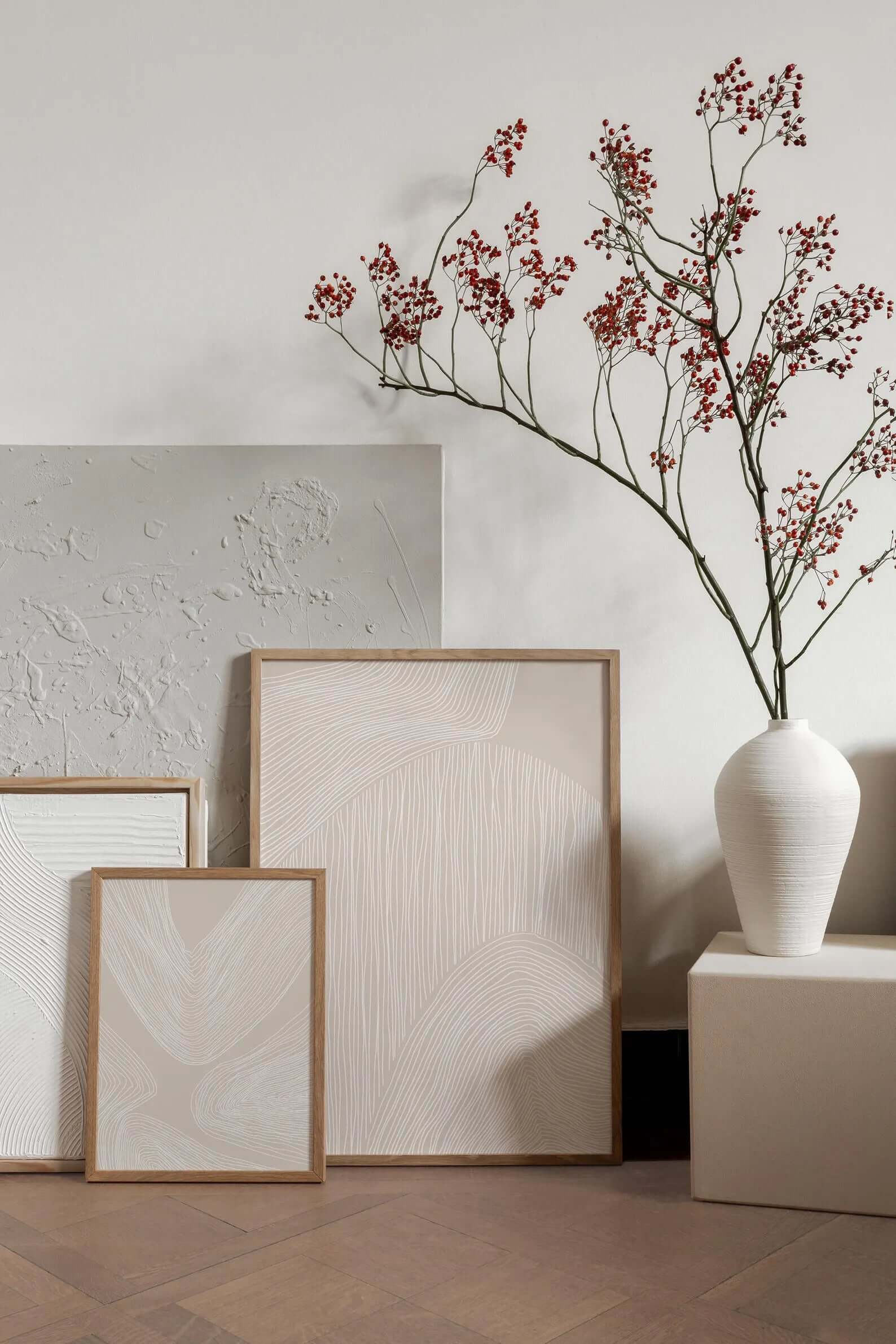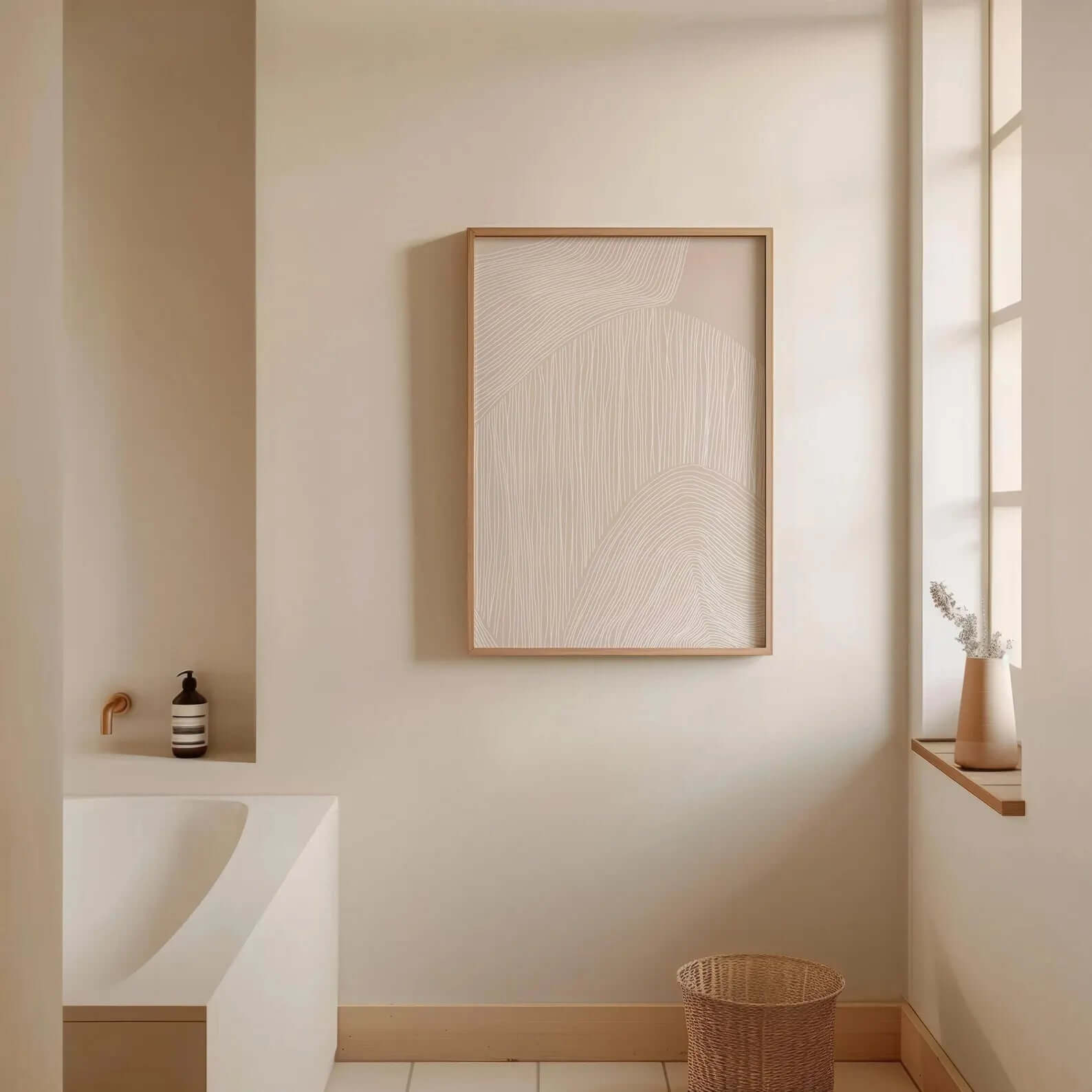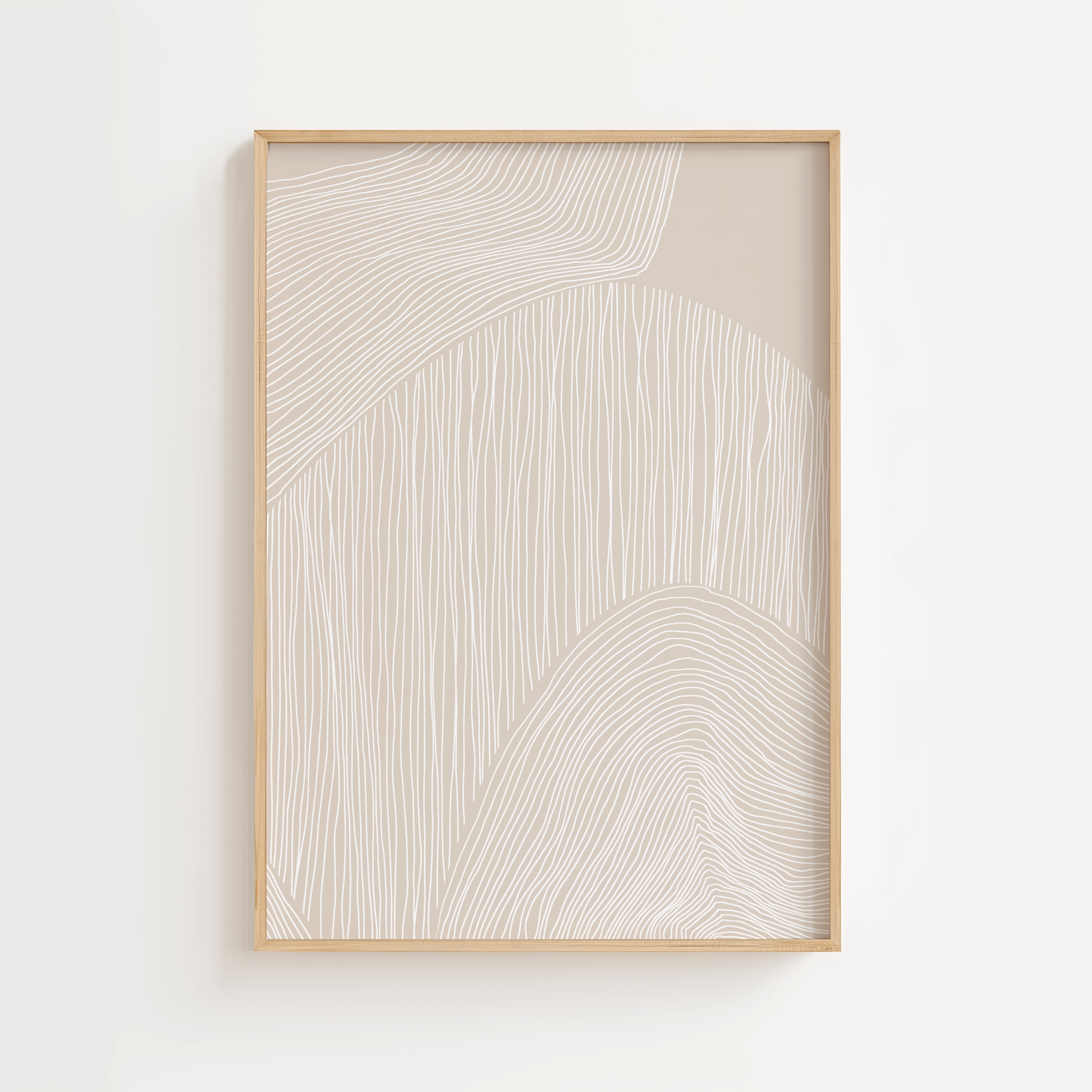 De bløde linjer giver plakaten dybde og bevægelse uden at virke dominerende, hvilket gør den ideel som en rolig baseplakat – både alene og som en del af en billedvæg med andre moderne plakater.