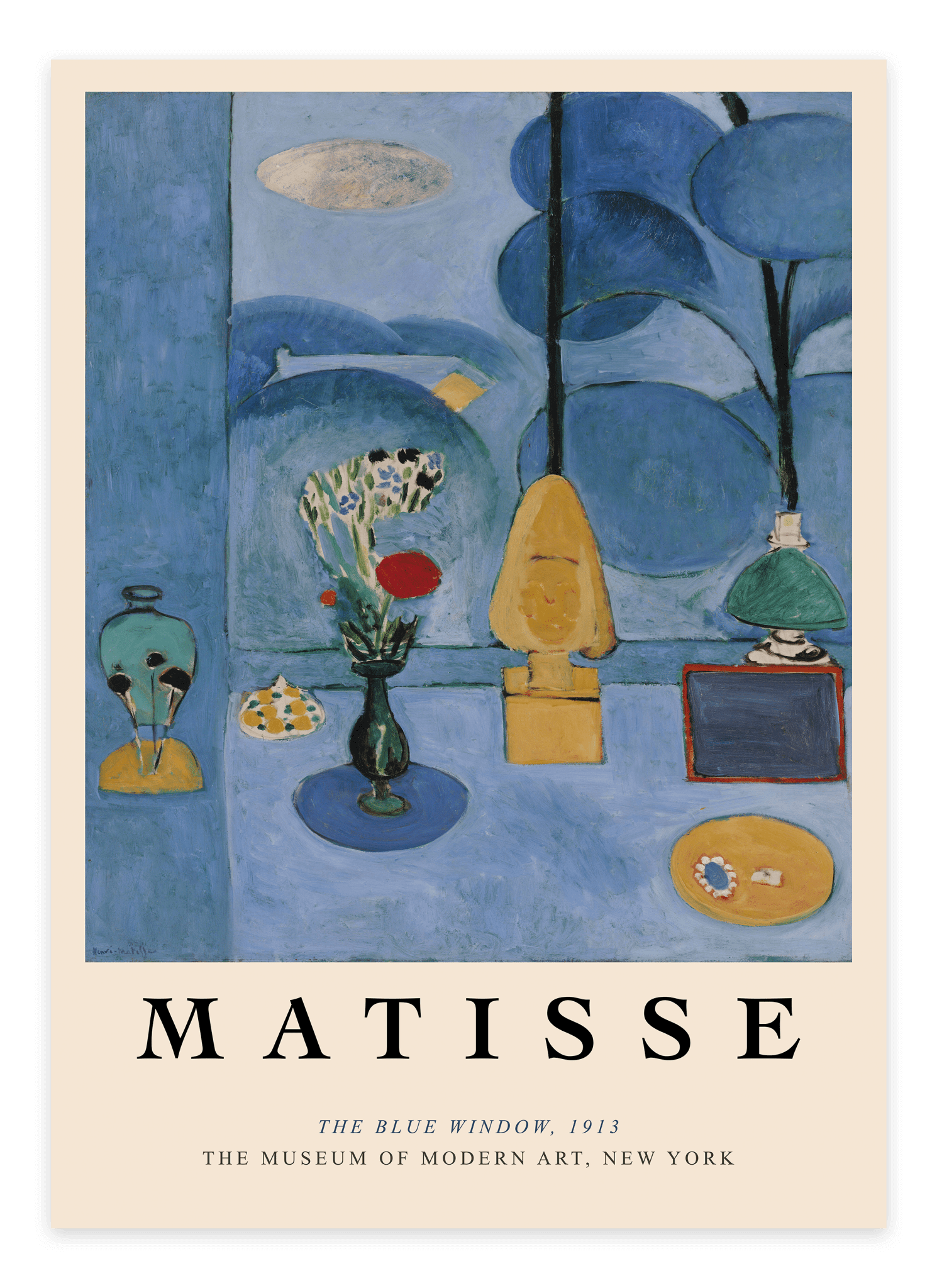 Bring colorful elegance into your home with The Blue Window - Matisse Poster . Inspired by Henri Matisse's famous painting, this poster combines deep blue hues with dreamy compositions and harmonious details. The work reflects Matisse's unique ability to create a balance between form and color, making it an iconic choice for art lovers.