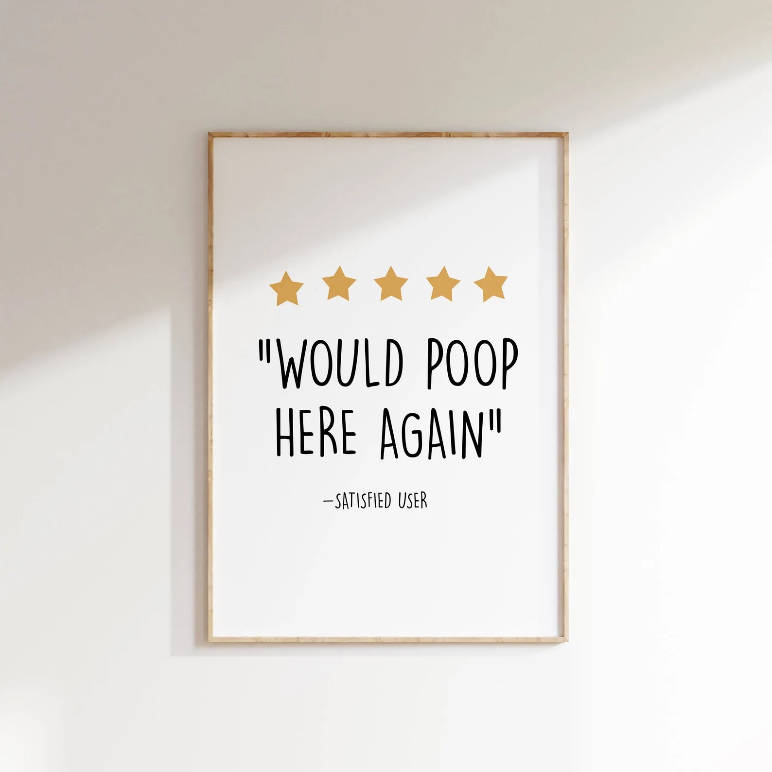 „Würde hier wieder kacken“ ist das perfekte Humor-Poster fürs Badezimmer oder Gäste-WC. Mit seinem klaren Design, den warmen Farben und der kultigen 5-Sterne-Bewertung sorgt es jeden Tag für einen Lacher.