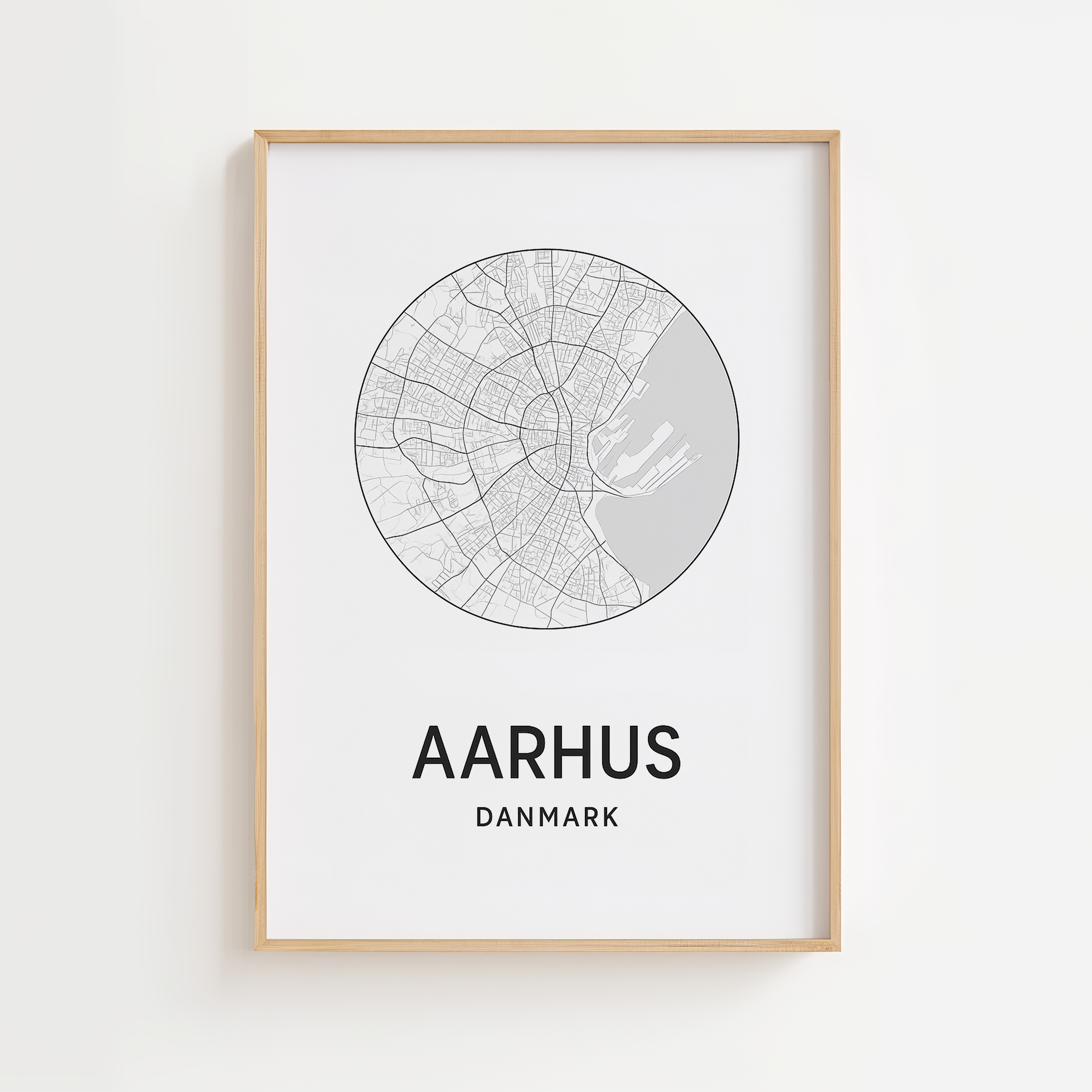 Giv dit hjem et stilrent præg med denne Aarhus Kort Plakat. Det minimalistiske sort-hvide design viser byen i et detaljeret cirkelkort, som kombinerer enkelhed med elegance. Perfekt til dig, der elsker Aarhus og ønsker at fremhæve byen på en moderne måde.