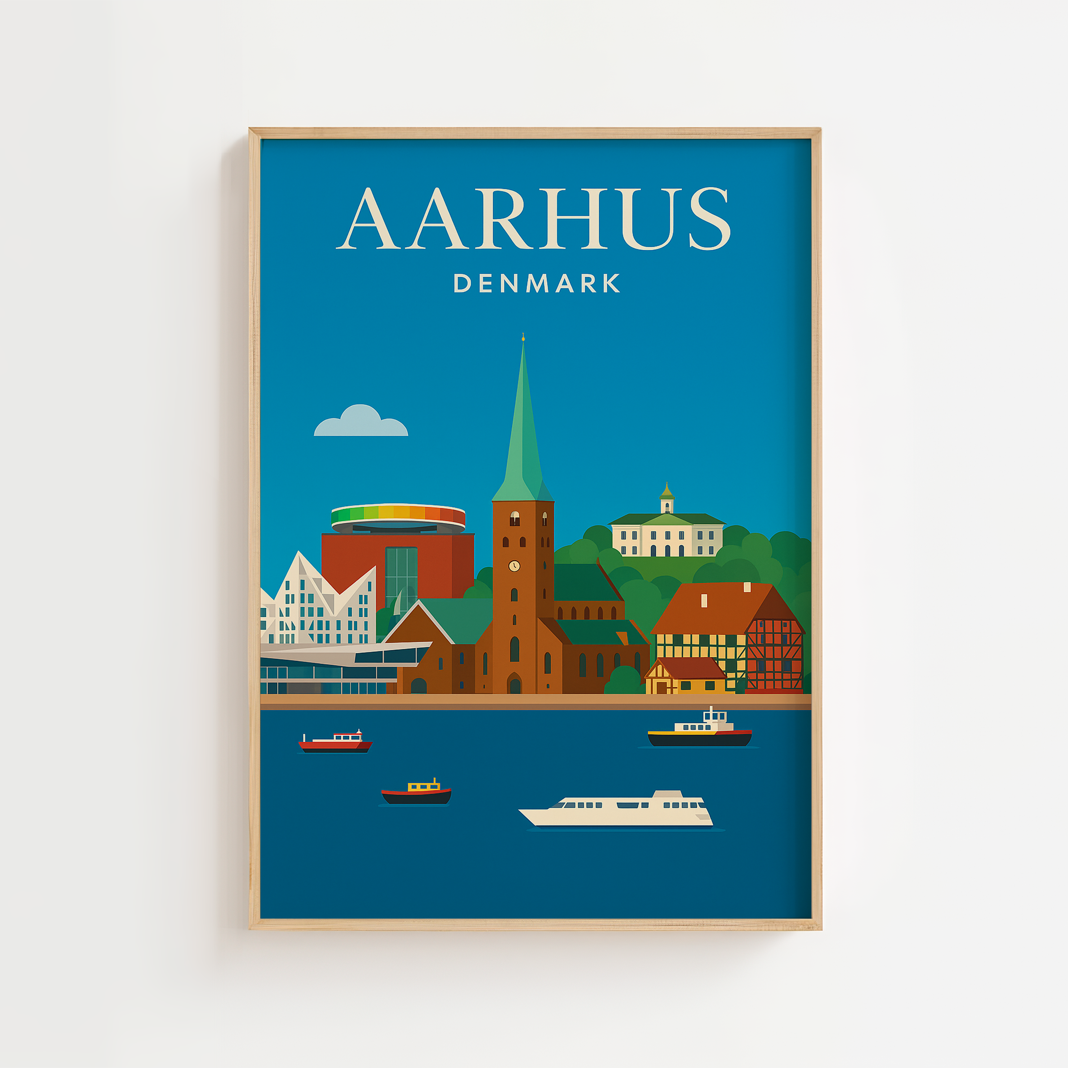 Fang essensen af Smilets By med denne Aarhus skyline plakat, der samler nogle af byens mest ikoniske vartegn: Aarhus Domkirke, Aros’ regnbuepanorama, havnen og de charmerende huse fra Den Gamle By.