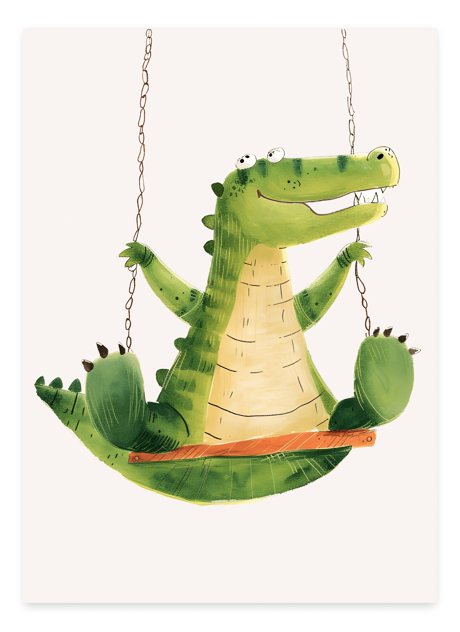 Let the play begin with Alligator on a Swing - Children's Poster ! This fun children's poster shows a happy alligator swinging back and forth on a swing, ready for new adventures. Perfect for creating an imaginative and fun atmosphere in the children's room.