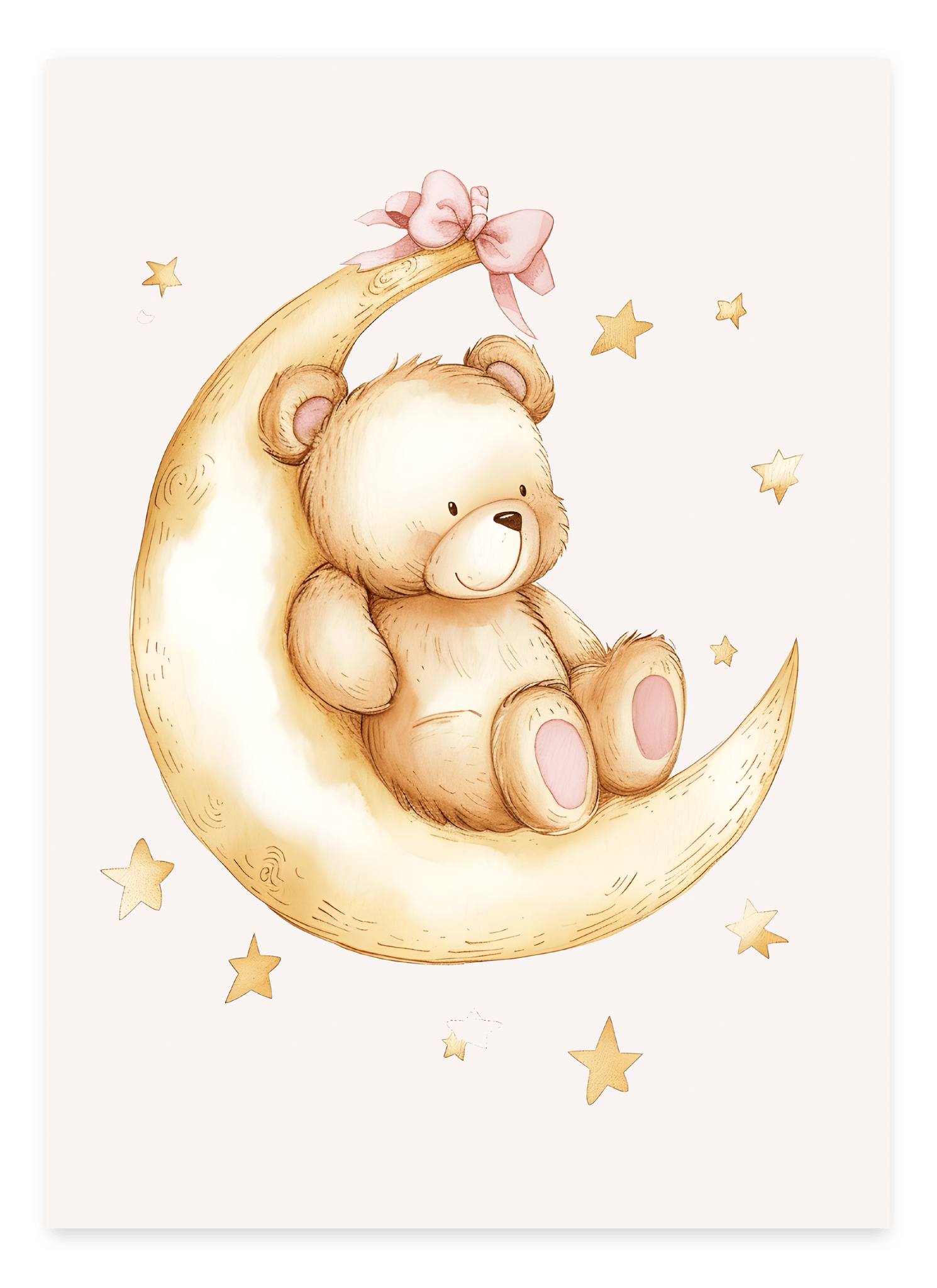 The poster is ideal for both boys' and girls' rooms and can be hung alone or combined with other motifs for a fabulous picture wall. Printed on quality material with beautiful colors and fine details, Teddy Bear on the Moon - Children's Poster makes the children's room a safe and inspiring place.