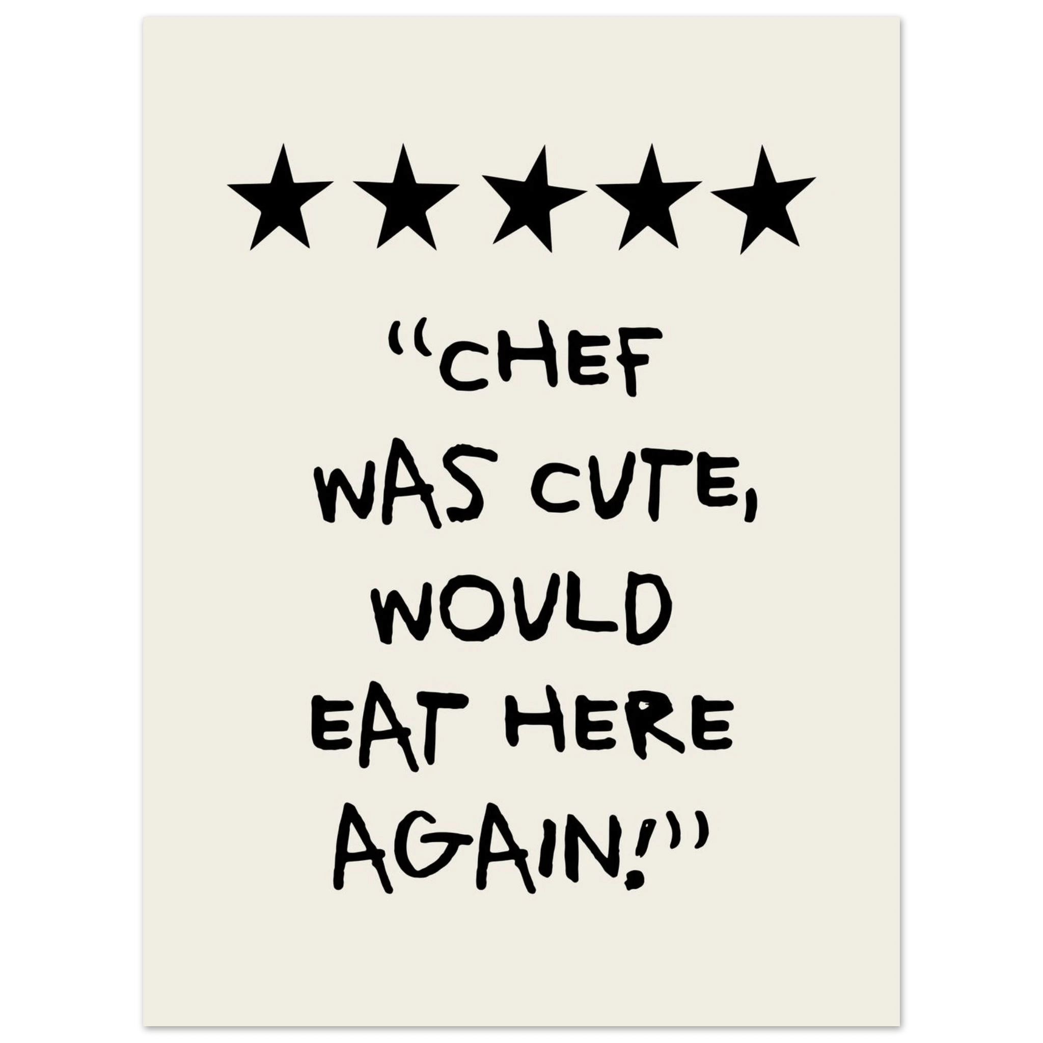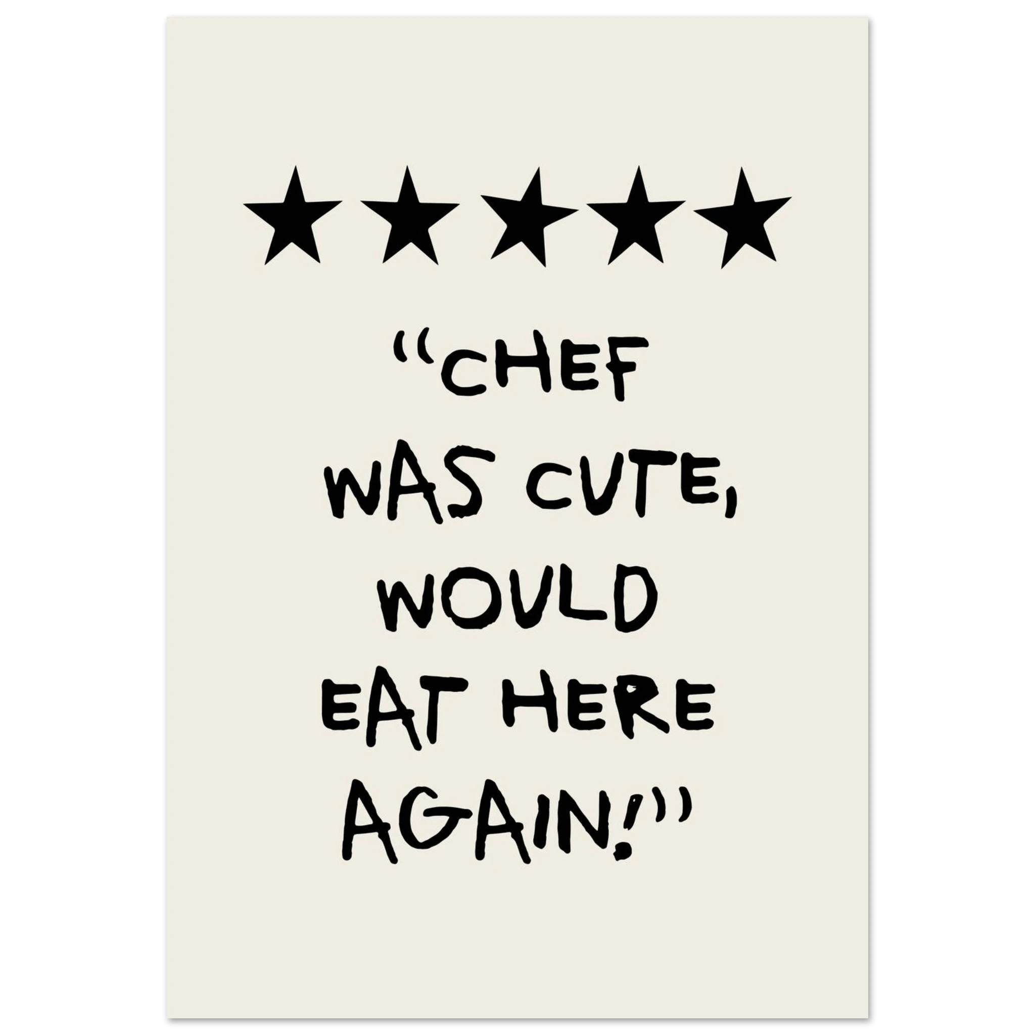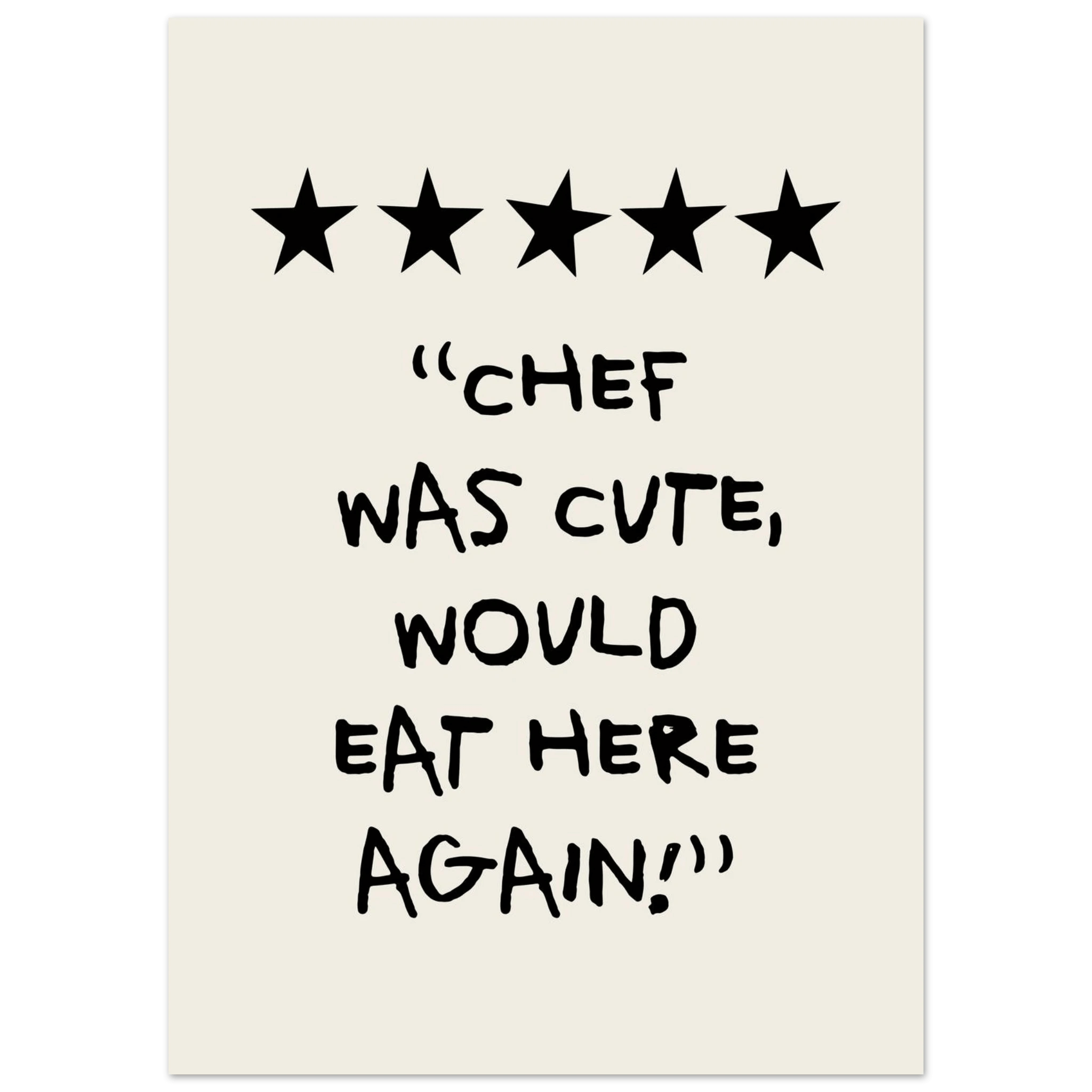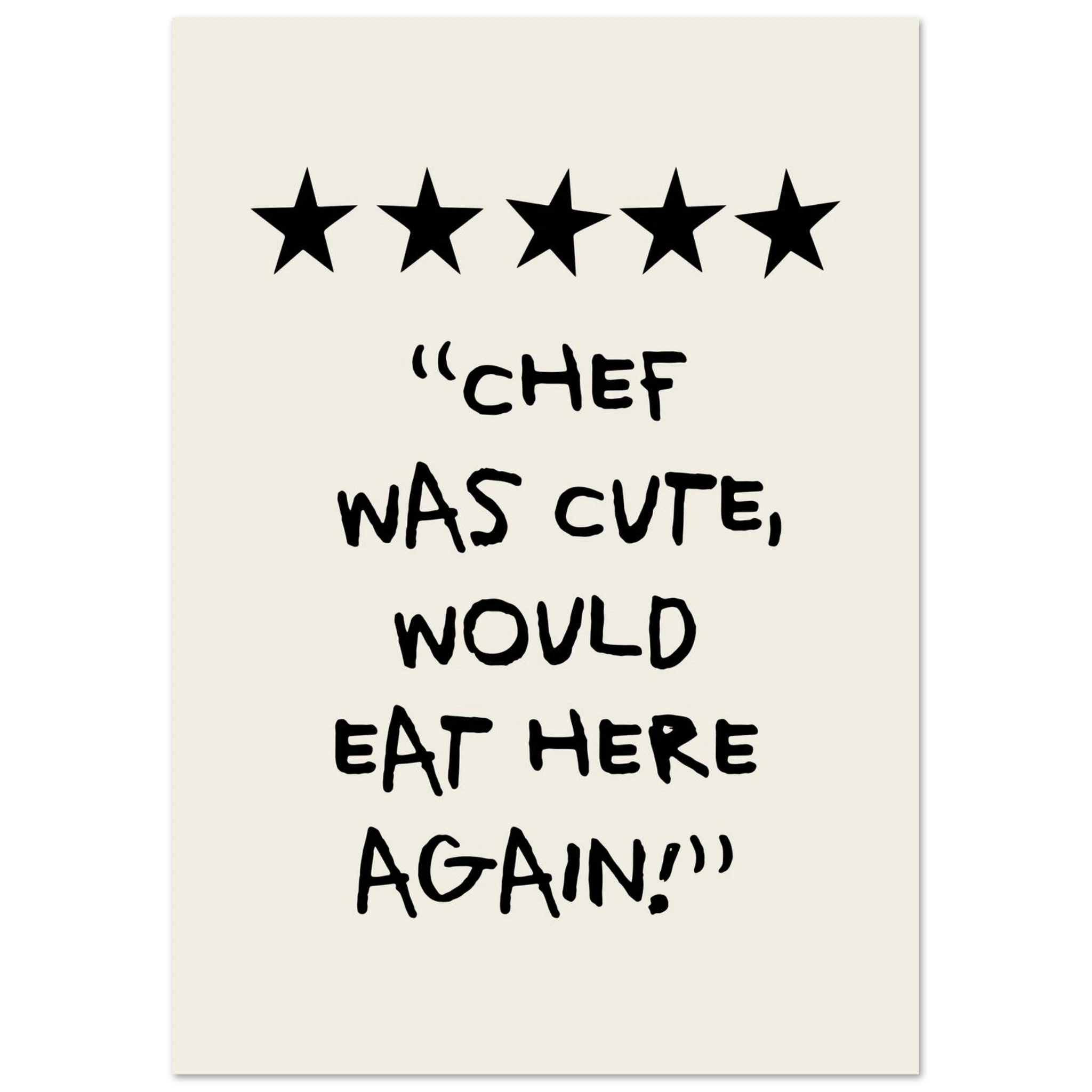 Add a touch of humor and charm to your kitchen with our "Chef Was Cute, Would Eat Here Again Poster". This poster combines fun and style, and is perfect for creating a cheerful and welcoming atmosphere. Printed on high-quality paper, ensuring both beauty and durability, it is a great way to personalize your kitchen walls. Whether you love cooking or just want to add a little fun to your home, this poster is an excellent choice. Buy now and make your kitchen a place filled with smiles and fond memories!