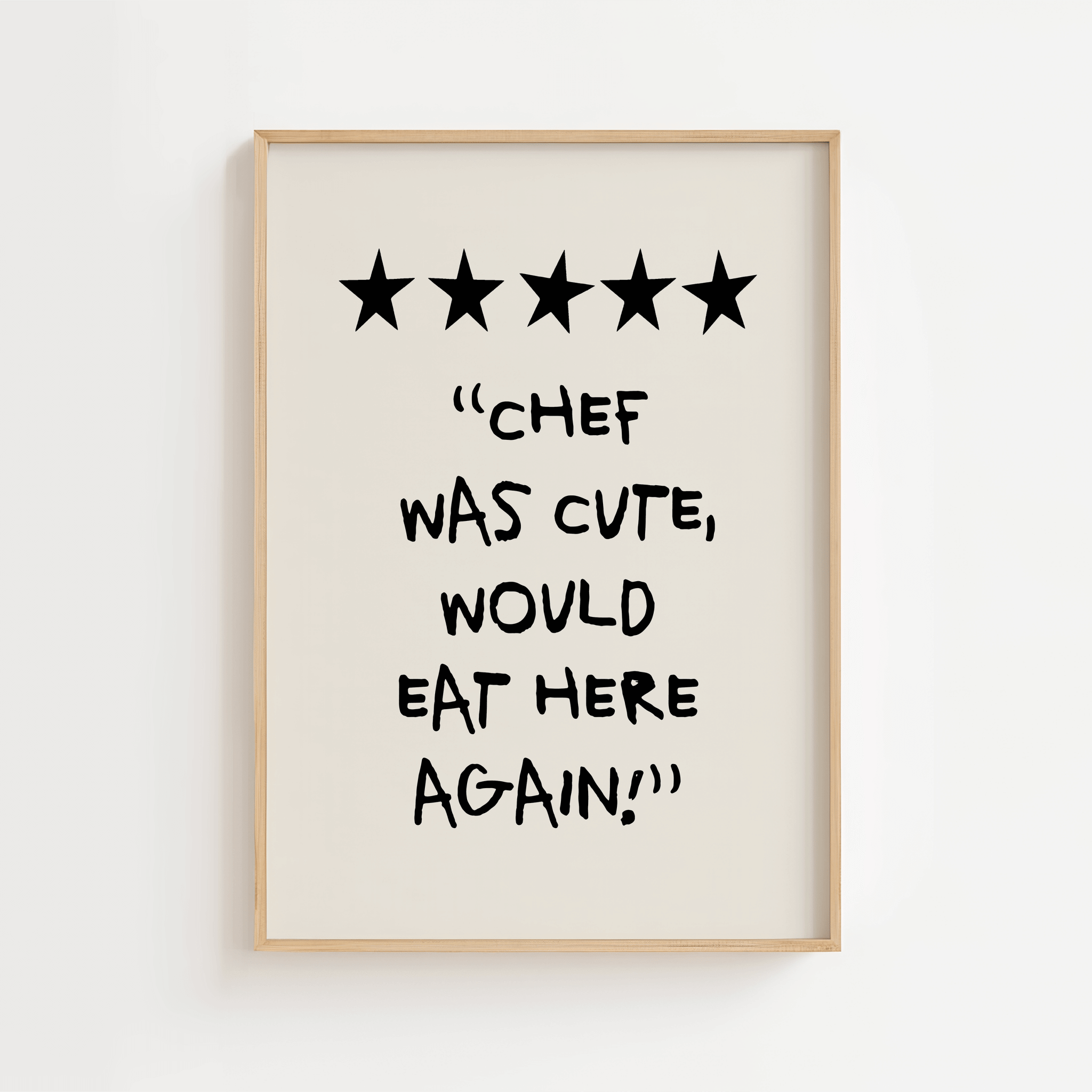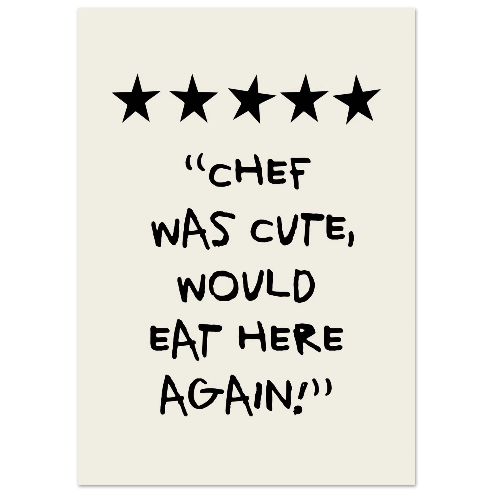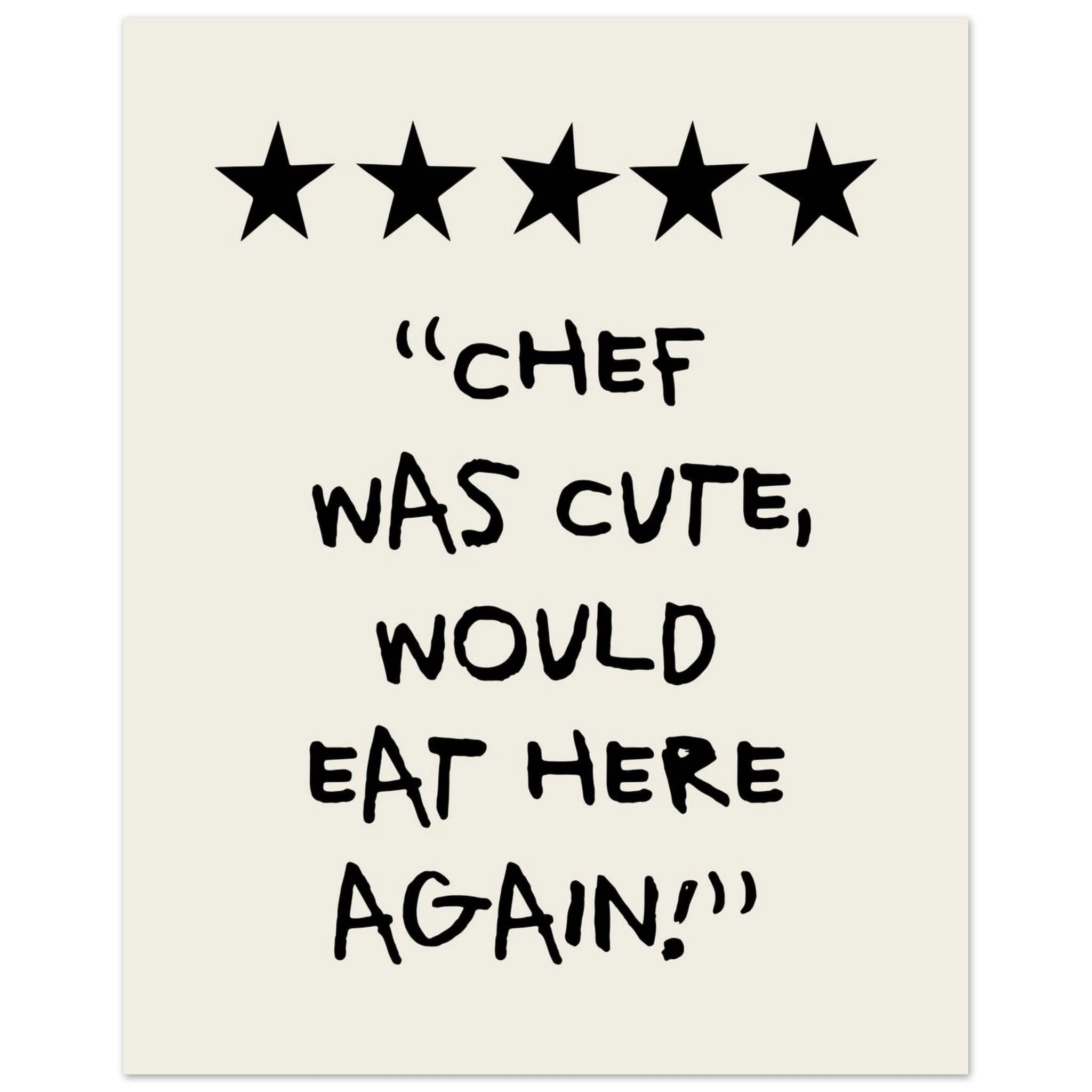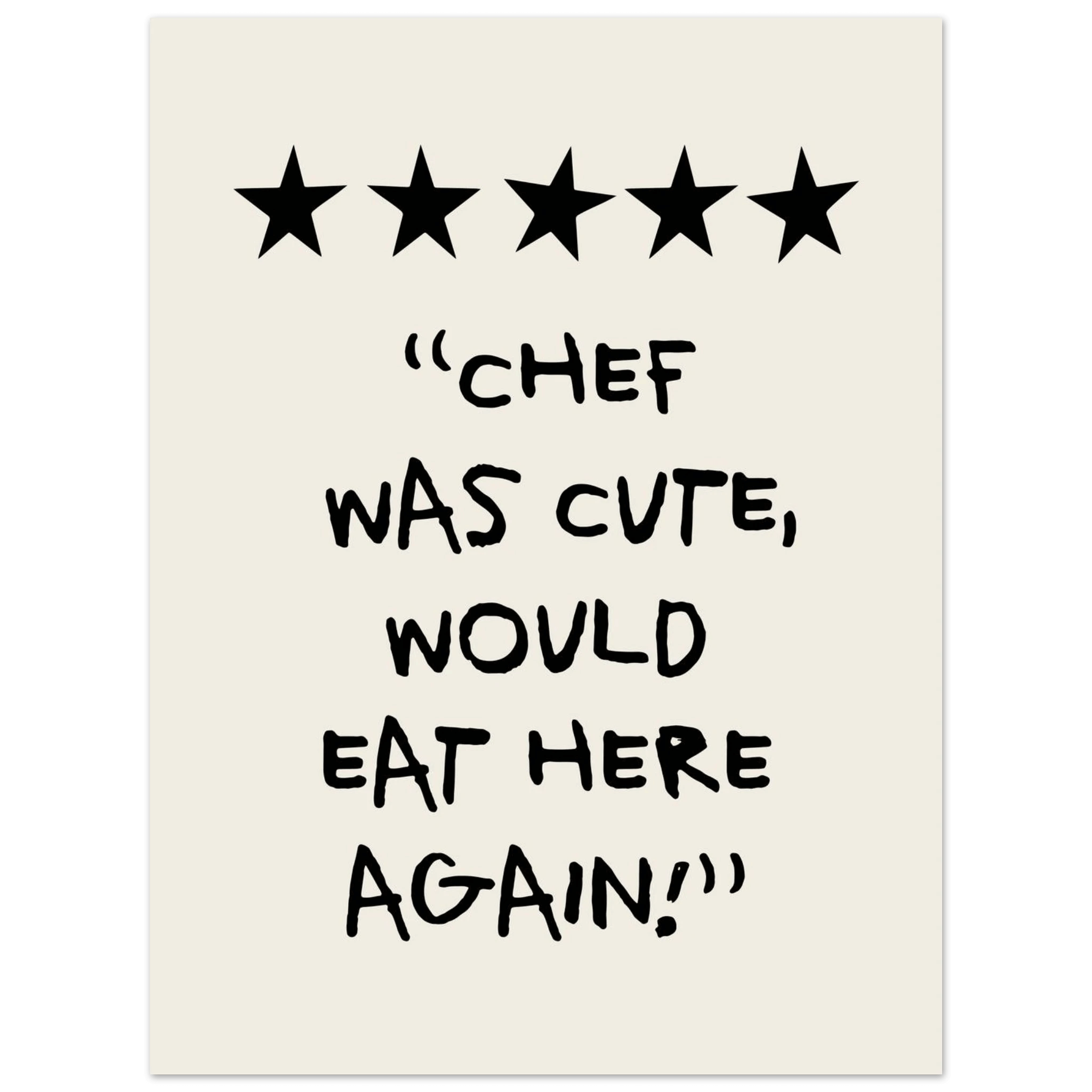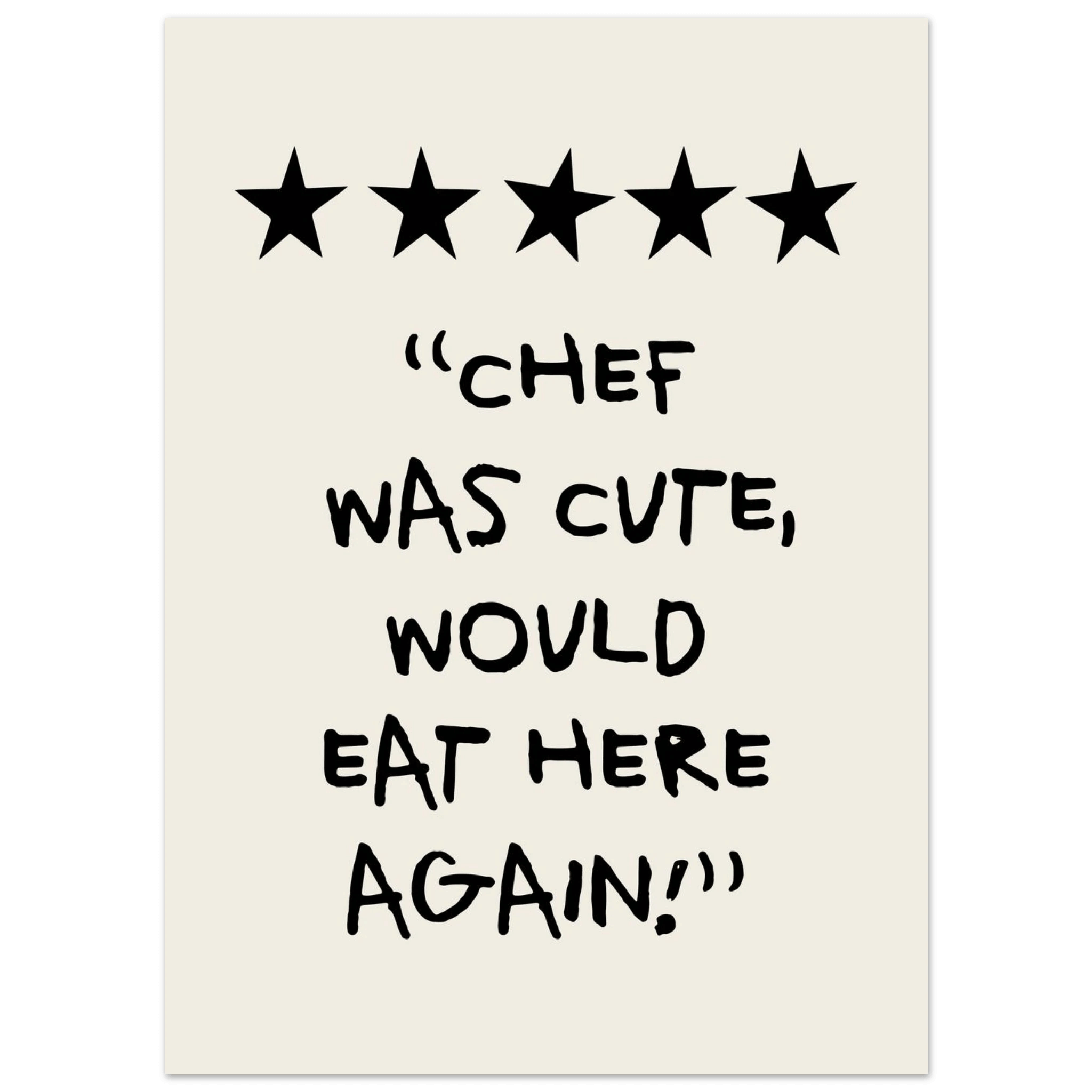 Add a touch of humor and charm to your kitchen with our "Chef Was Cute, Would Eat Here Again Poster". This poster combines fun and style, and is perfect for creating a cheerful and welcoming atmosphere. Printed on high-quality paper, ensuring both beauty and durability, it is a great way to personalize your kitchen walls. Whether you love cooking or just want to add a little fun to your home, this poster is an excellent choice. Buy now and make your kitchen a place filled with smiles and fond memories!