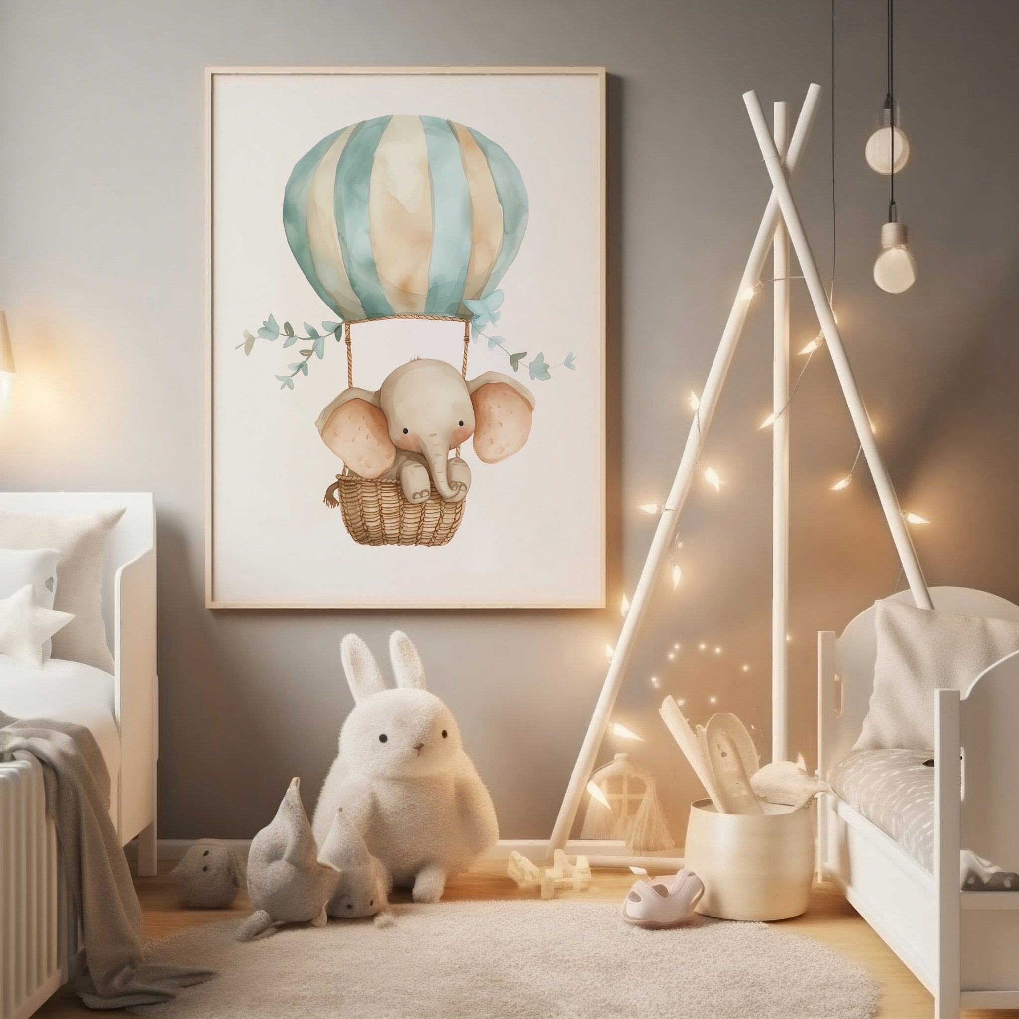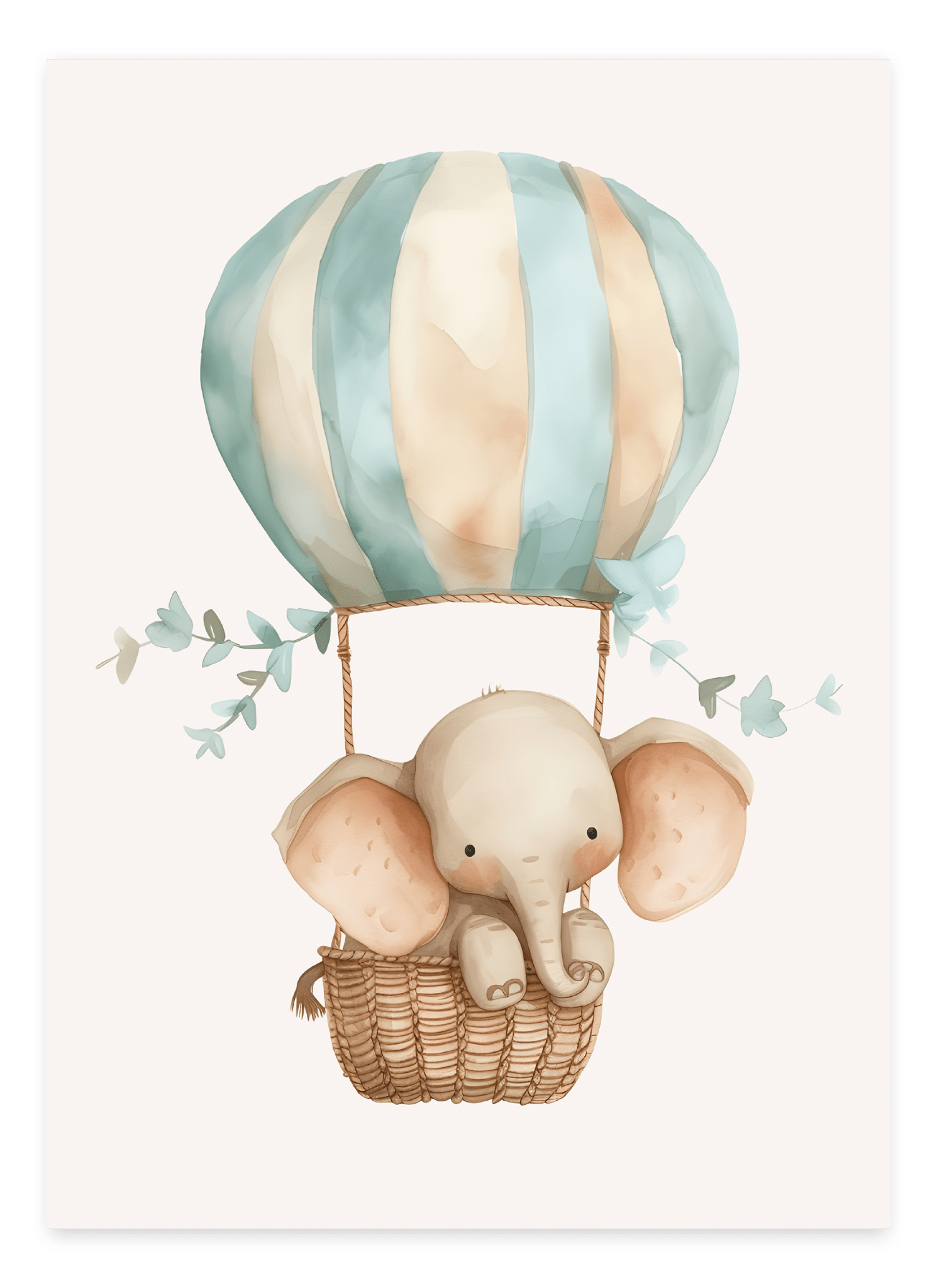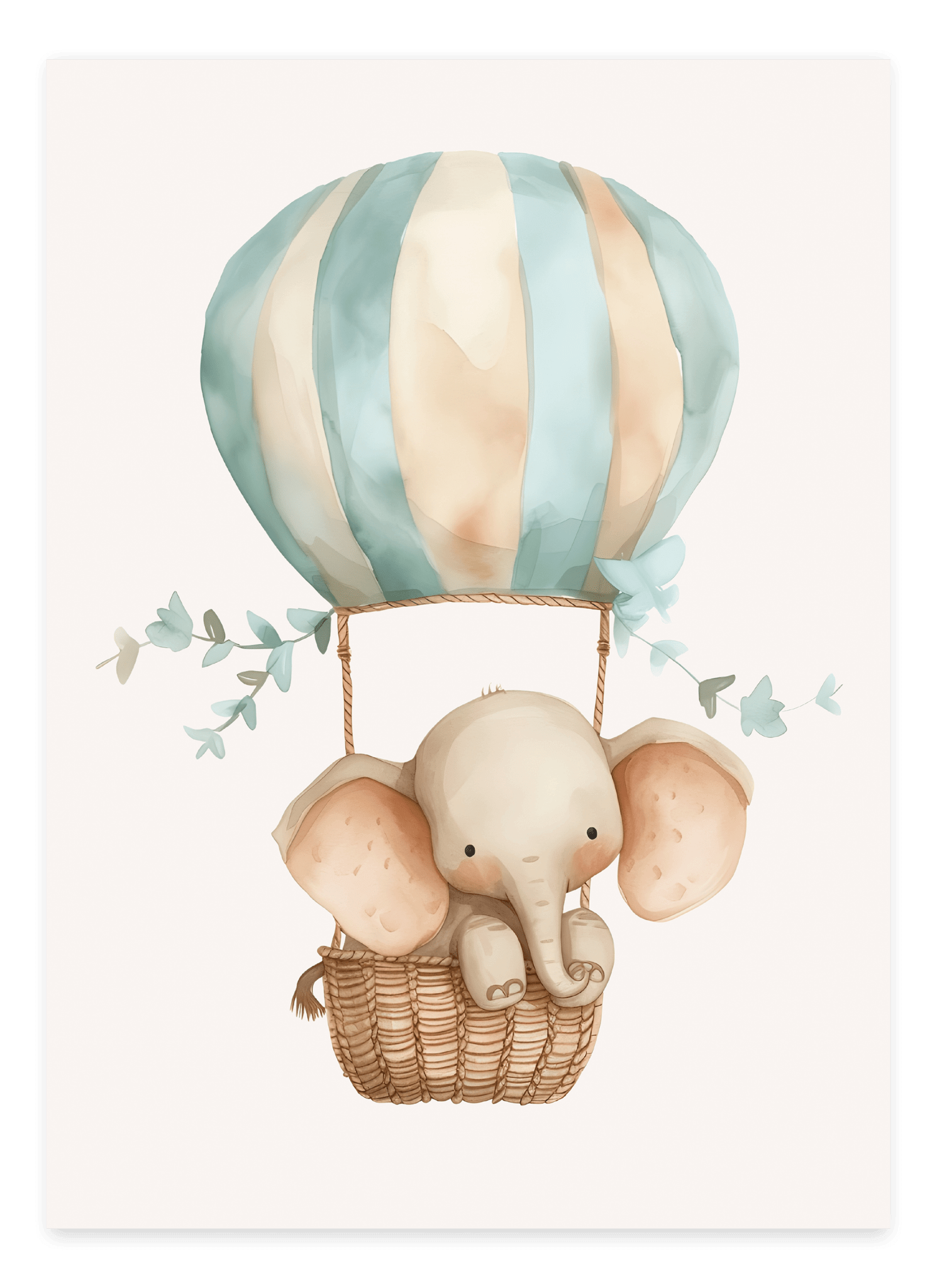 Let your child dream up to the skies with Elephant in Balloon - Children's Poster ! This children's poster shows a cute elephant floating high in the sky in a large, colorful hot air balloon. Perfect for little adventurers who love magical motifs and airy dreams.