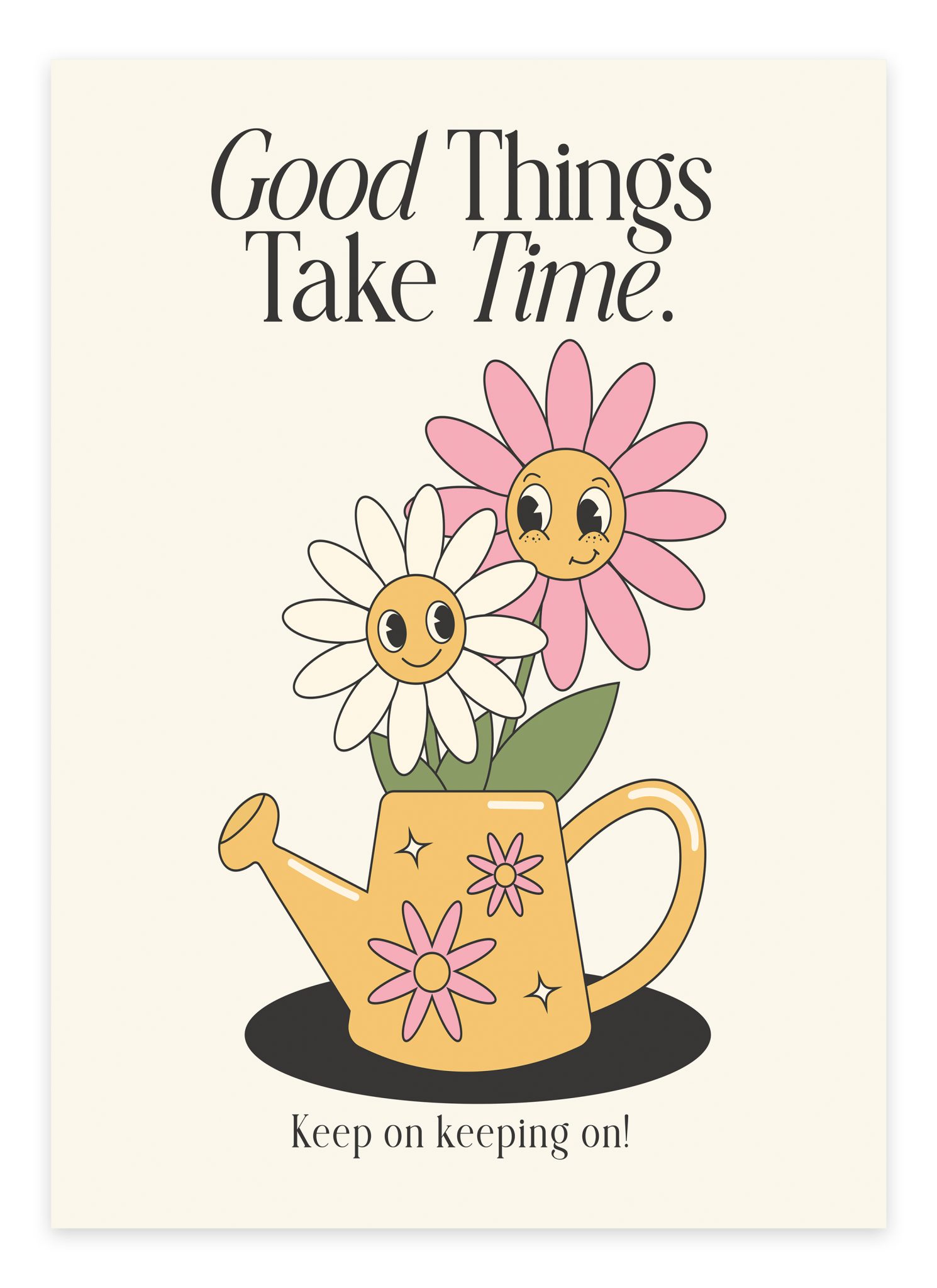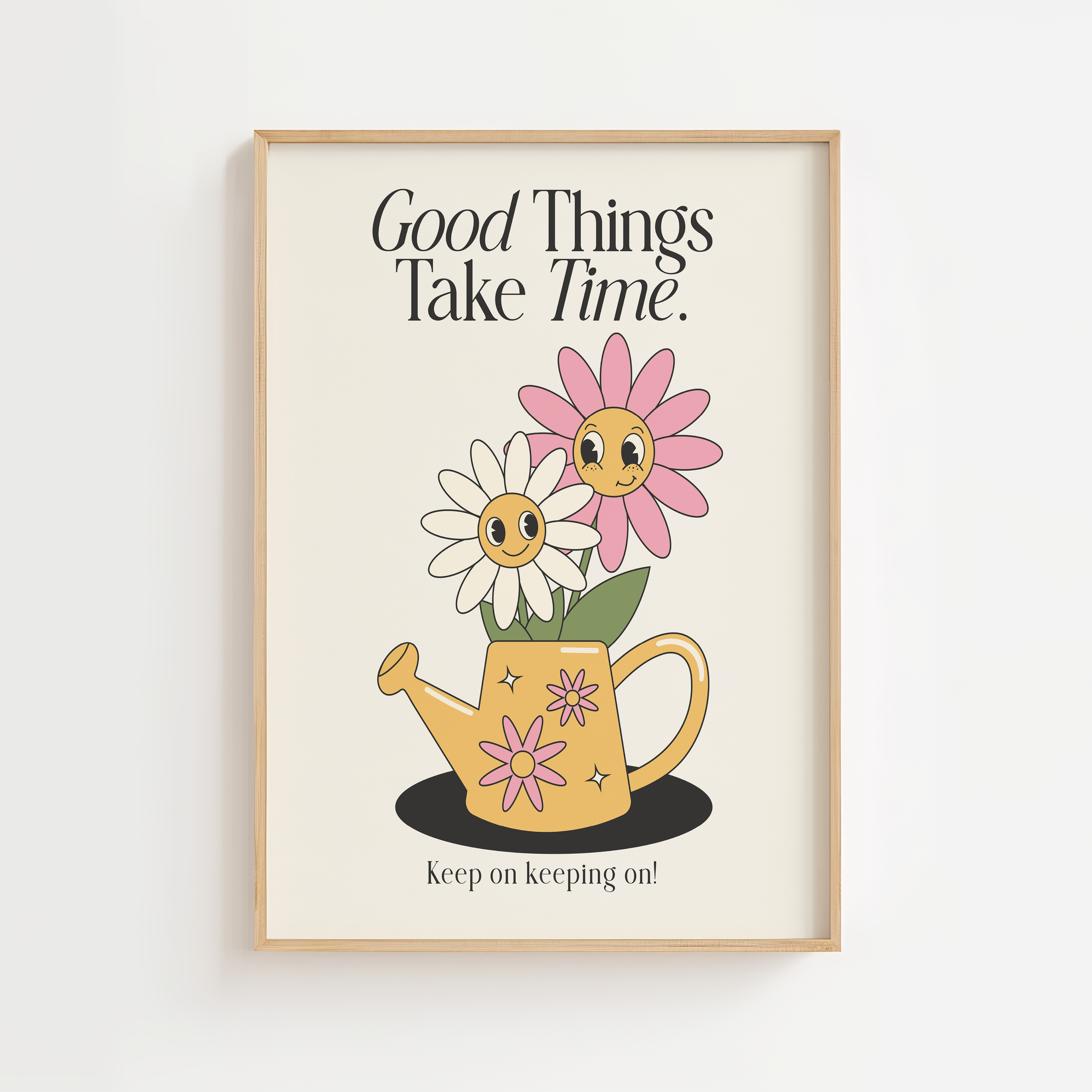 Discover our Good Things Take Time Poster – a retro poster with an inspiring quote that reminds you that good things take time. Combining a classic vintage aesthetic with a motivational message, this poster is perfect as a wall decoration in your living room, bedroom or office. Add a touch of nostalgia and inspiration to your home with this unique piece of art