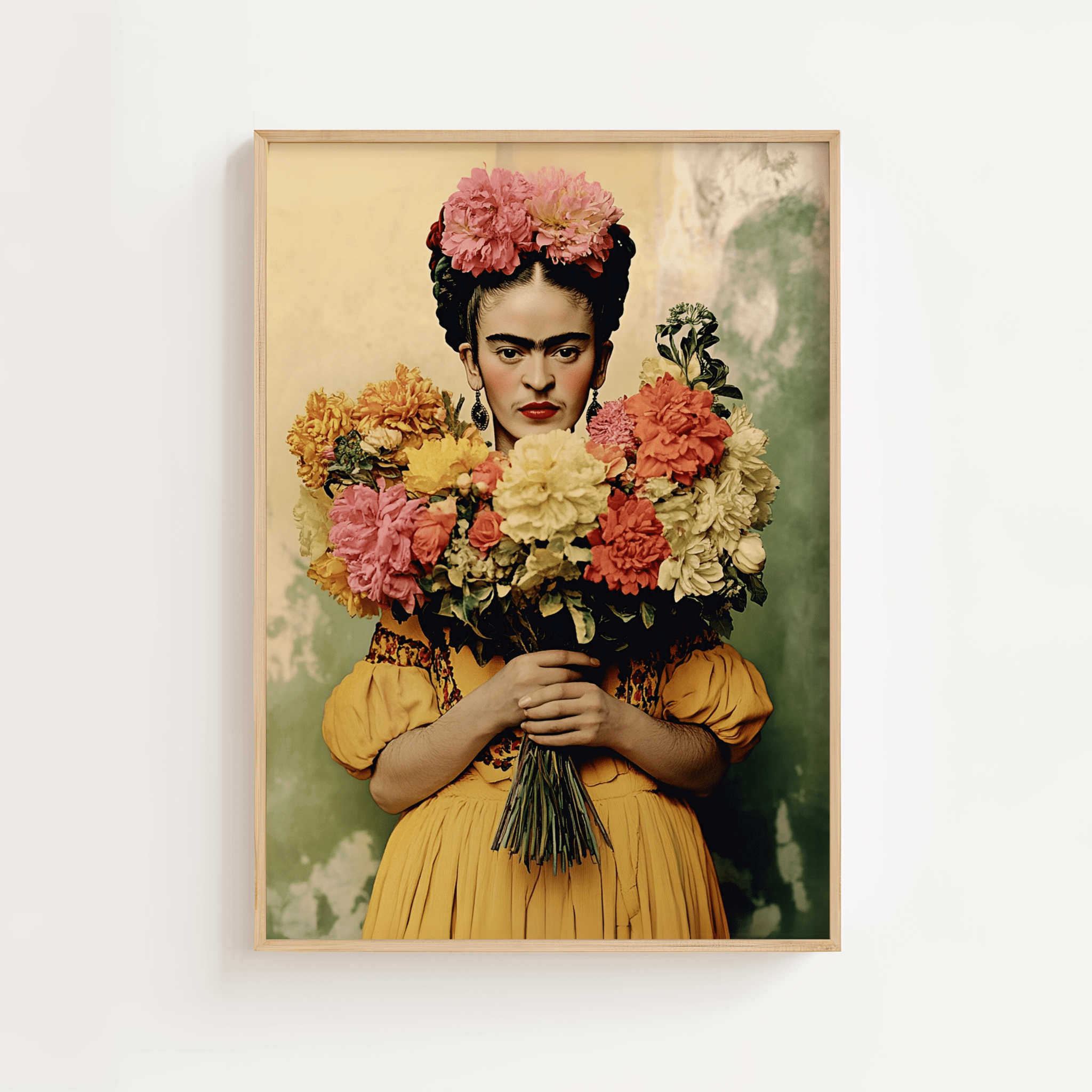 Yellow Dress & Large Flowers – Frida Kahlo Poster captures Frida Kahlo's unique style in a colorful and evocative portrait. The iconic artist is dressed in a beautiful yellow dress and holds a large bouquet of flowers in warm colors that highlight her strength and personality. An ideal art poster for those who want to bring culture, color and history into their interior.