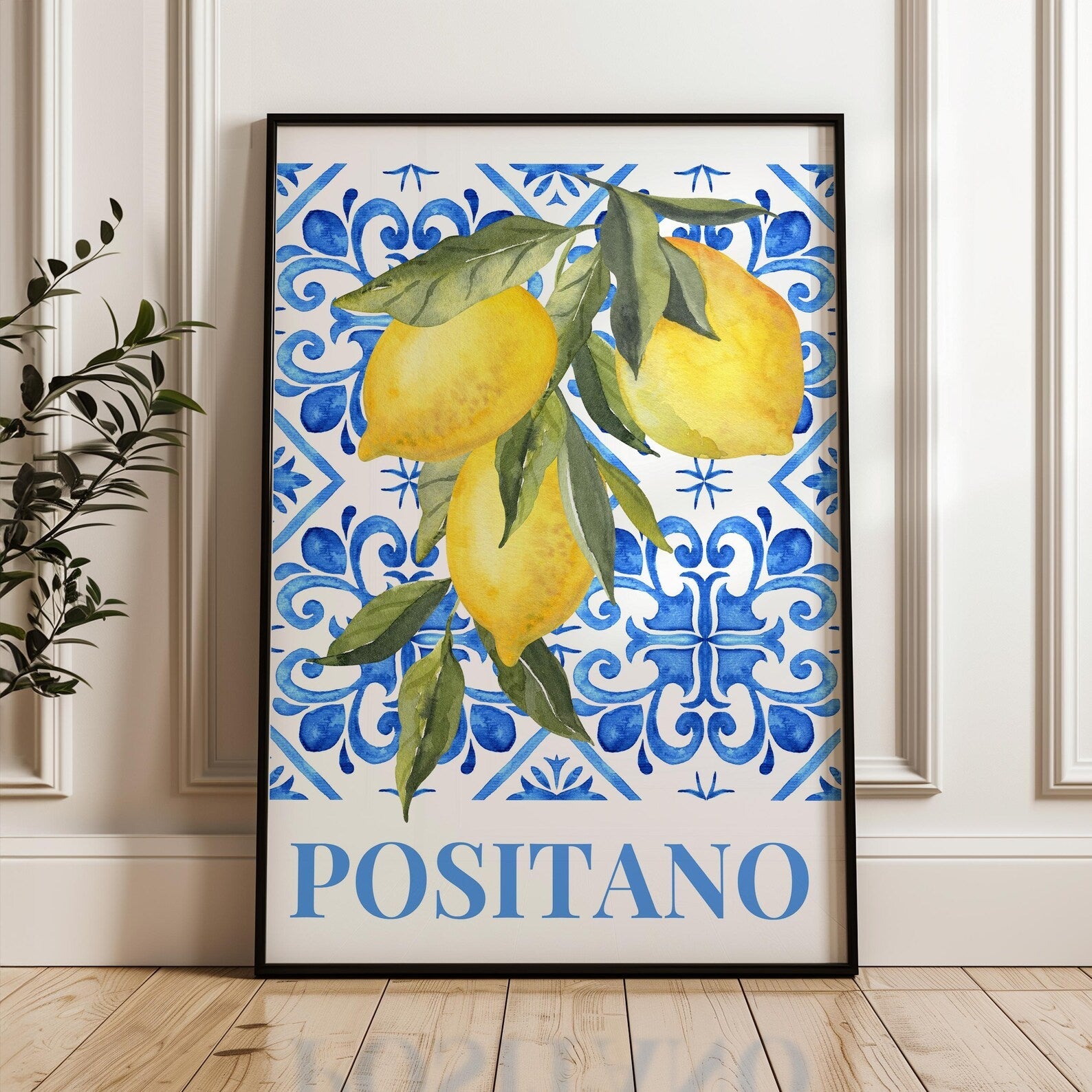 Italian Positano Lemons Poster brings sun, summer and southern Italian charm straight into your home. With yellow lemons, blue tile patterns and the text "Positano", the poster exudes the lightness and warmth of the Mediterranean.