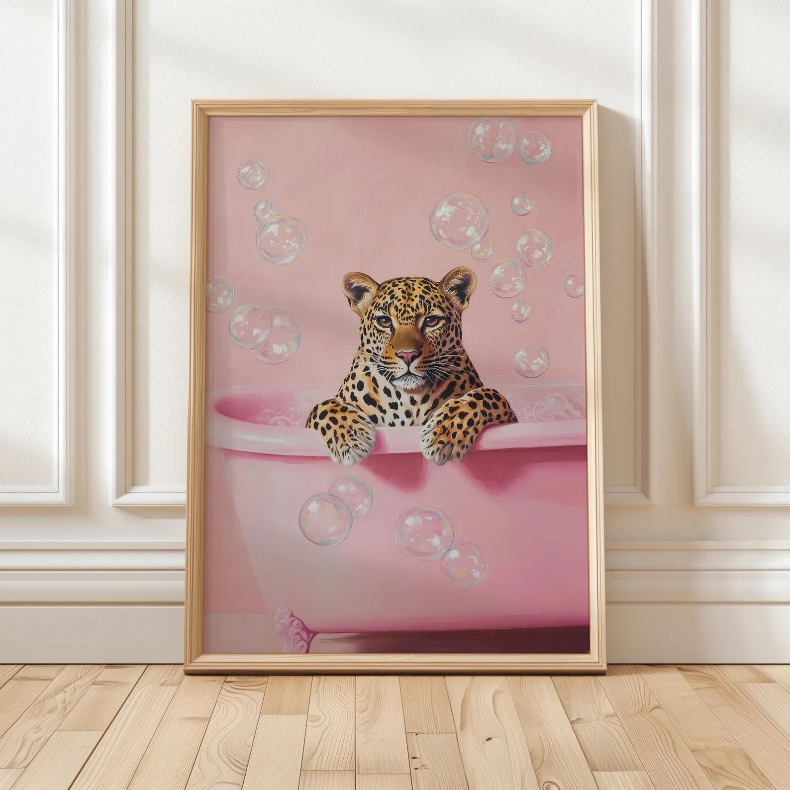 Give your bathroom a touch of wild elegance and humor with this unique poster of a leopard enjoying a relaxing bath in a pink bathtub surrounded by soap bubbles. The detailed illustration combines animal prints and pastel colors in the finest way and creates a luxurious and playful atmosphere. Perfect for those who love art with personality and a twinkle in their eye - and who want to make the bathroom a place with a smile and style. The poster fits beautifully in both modern and classic interiors and is available in several sizes