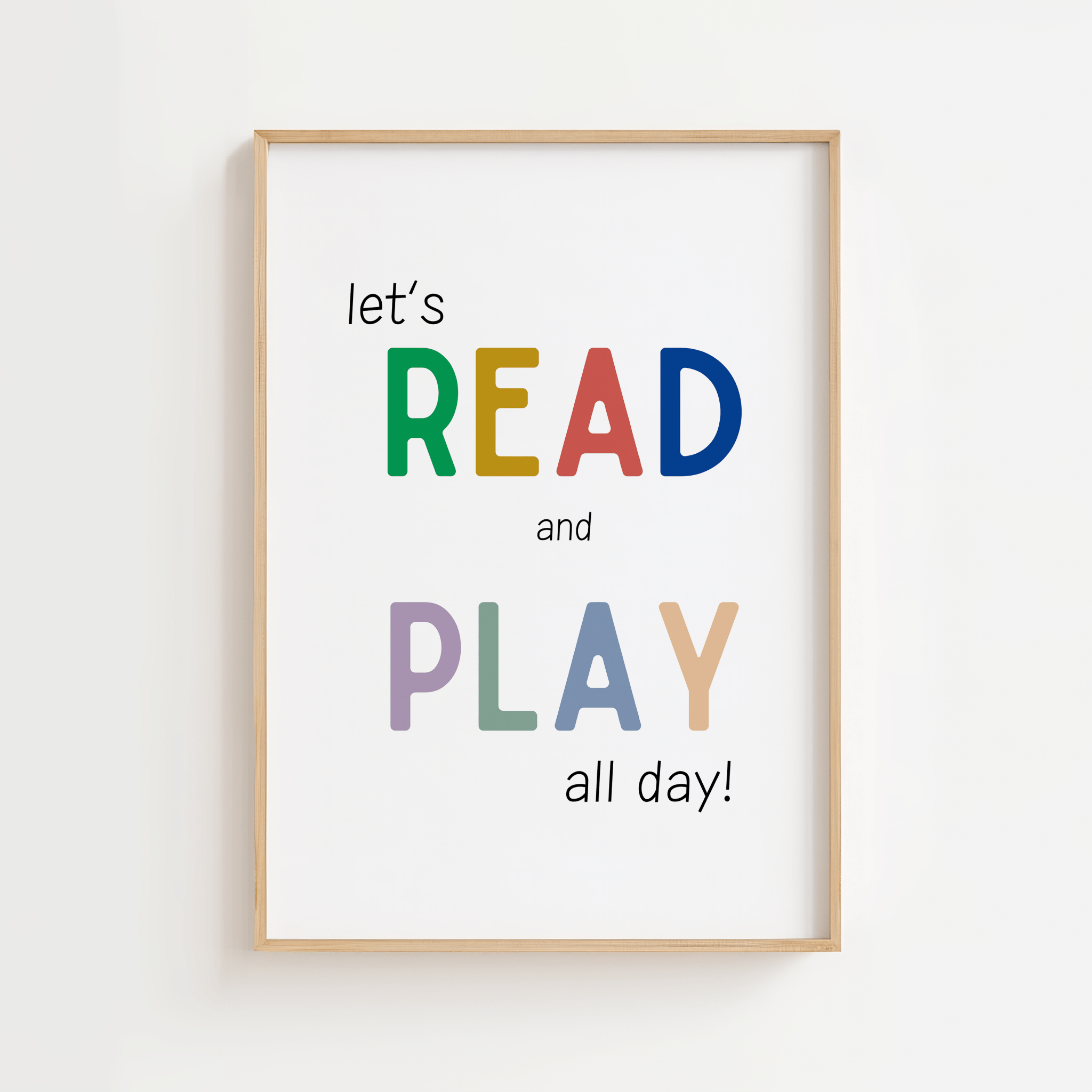Create an inspiring children's room with the Let's Read and Play All Day Poster. Perfect for encouraging reading and play in a colorful and inviting environment