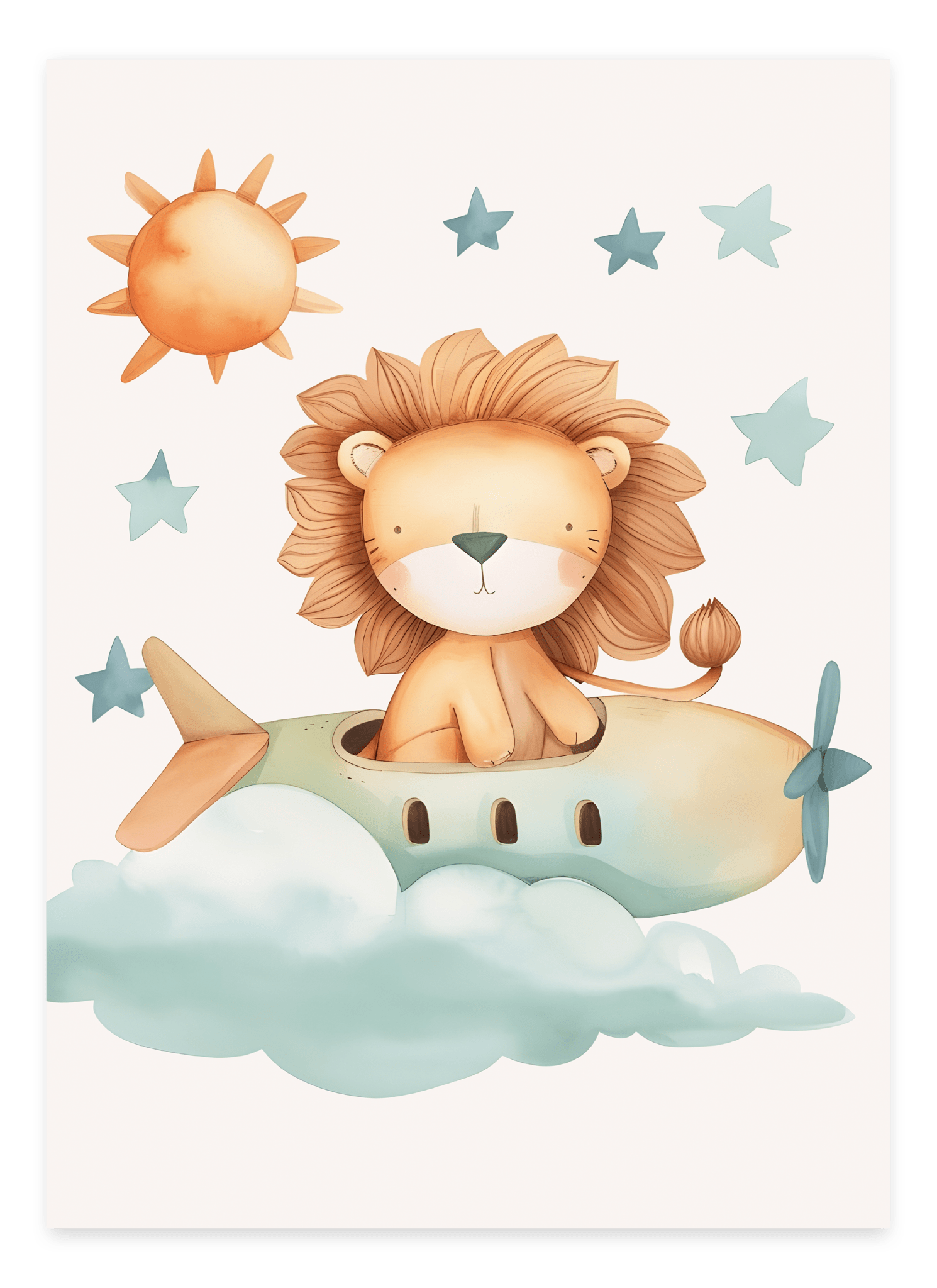 Let your imagination fly with Lion in a Green Plane - Children's Poster ! This fun and creative children's poster shows a brave lion piloting his green plane through the clouds. Perfect for children who love animals, airplanes and exciting adventures.