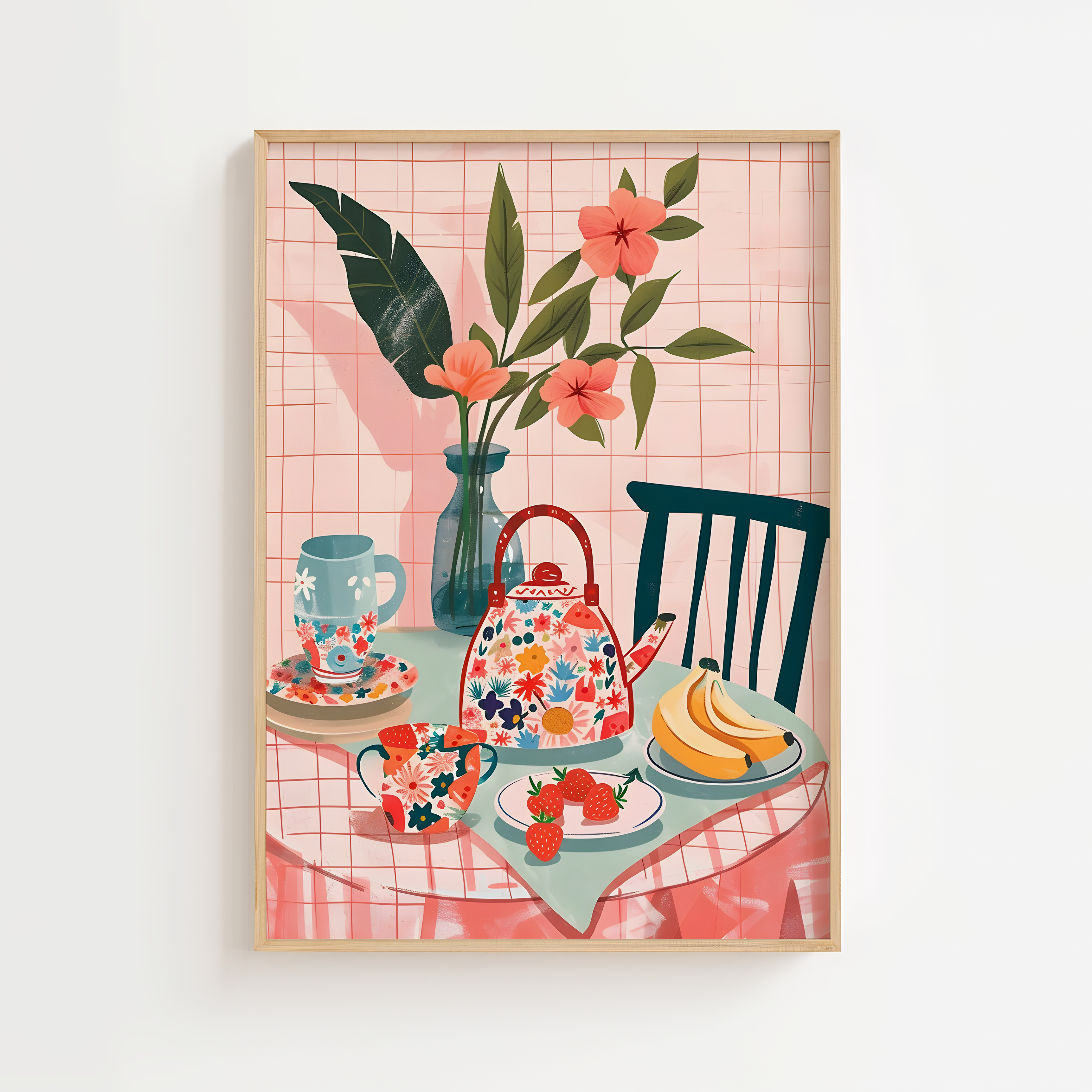 Create a warm and inviting atmosphere with this pink breakfast poster . The motif shows a cozy table set with flowers, tea, fresh fruit and summery colors that bring life and joy to the room. An ideal poster for the kitchen, dining room or cottage where colorful decor is desired.