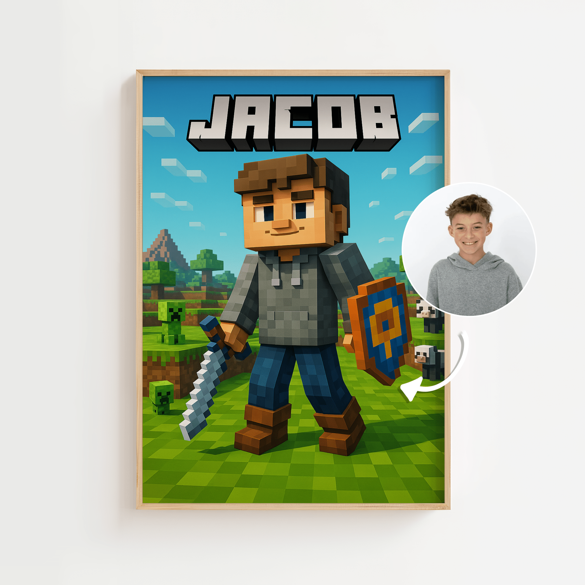Bring the Minecraft universe to life with your very own personalized poster! With the Minecraft poster with sword and shield, you can transform a picture of your child into a cool Minecraft character with sword in hand and shield in arm – ready to fight creepers and zombies.