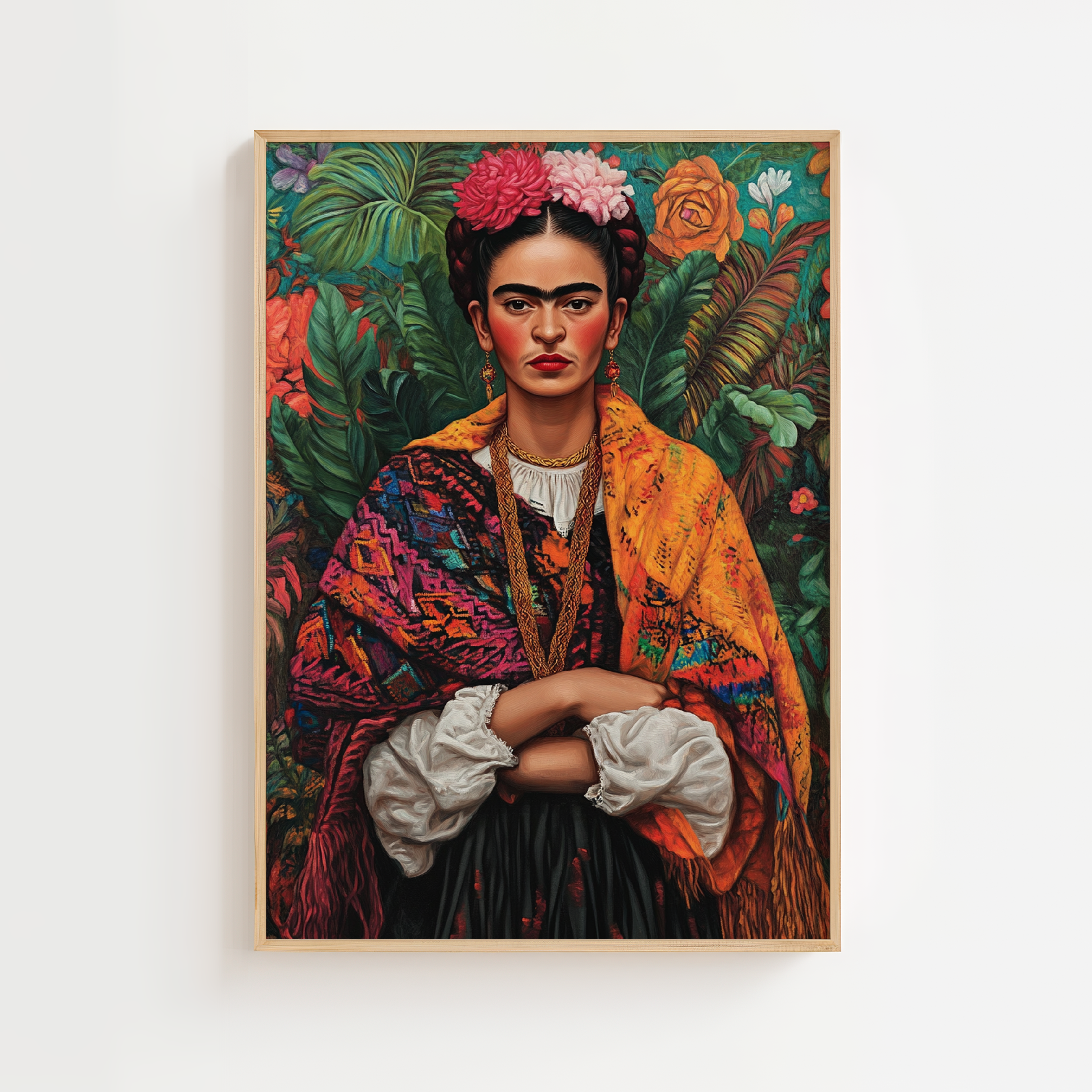 Orange Sjal Junglebaggrund – Frida Kahlo Plakat viser den ikoniske mexicanske kunstner i et stærkt og farverigt portræt. Det orange, mønstrede sjal står smukt imod den grønne, tropiske baggrund fyldt med planter og blomster. En kunstplakat, der både udstråler styrke og skønhed – ideel som blikfang i stuen, soveværelset eller kontoret.