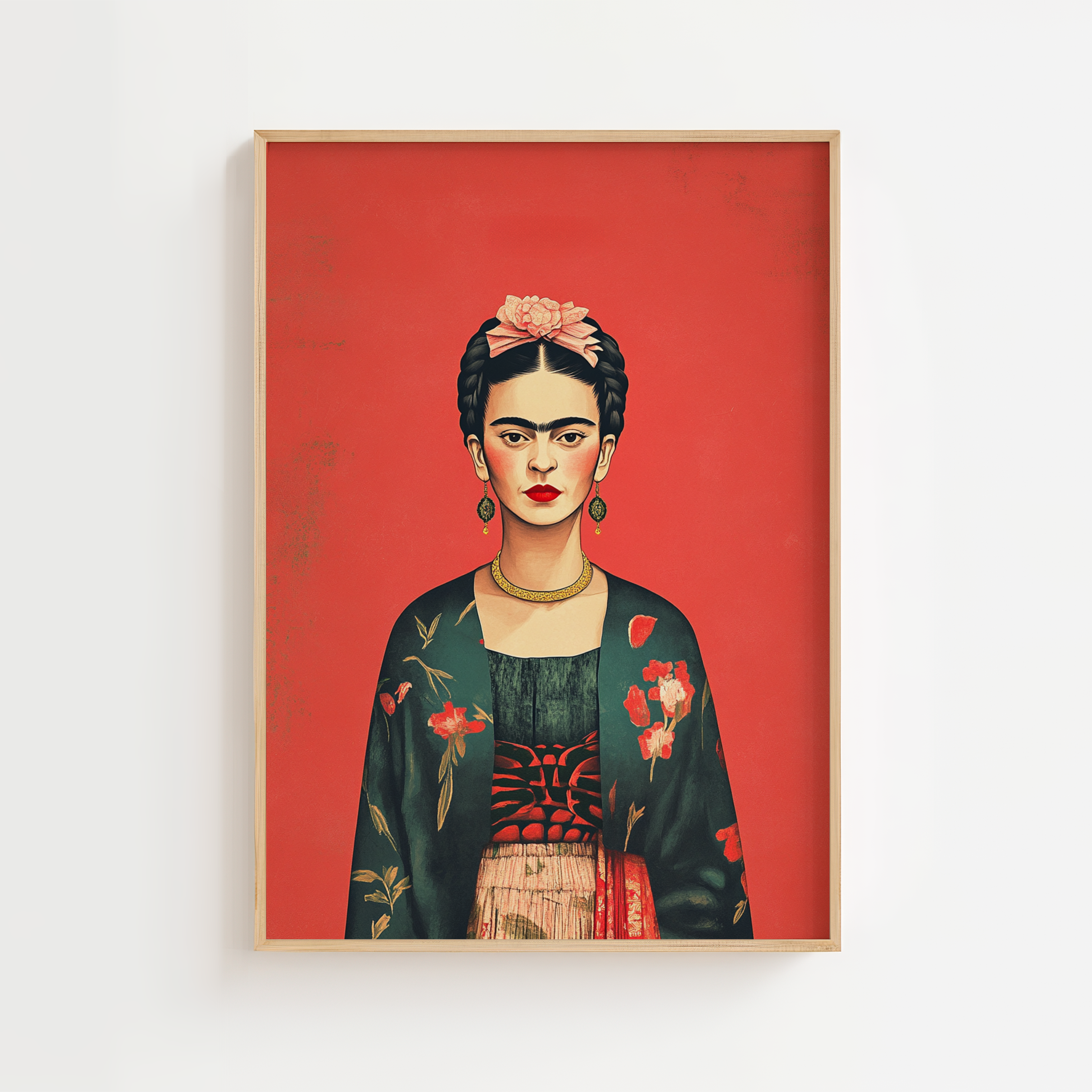 Rød Baggrund Grøn Kimono – Frida Kahlo Plakat