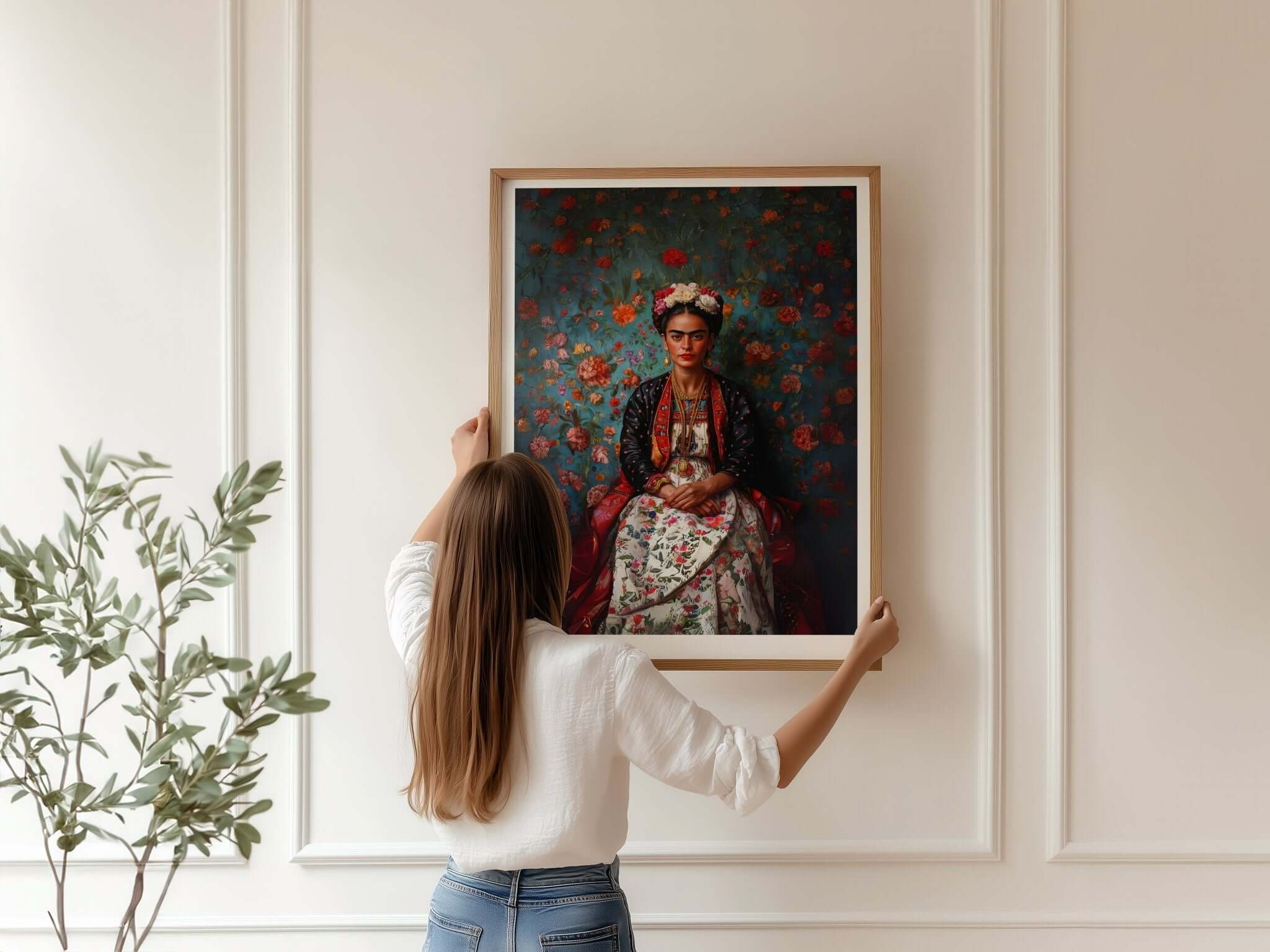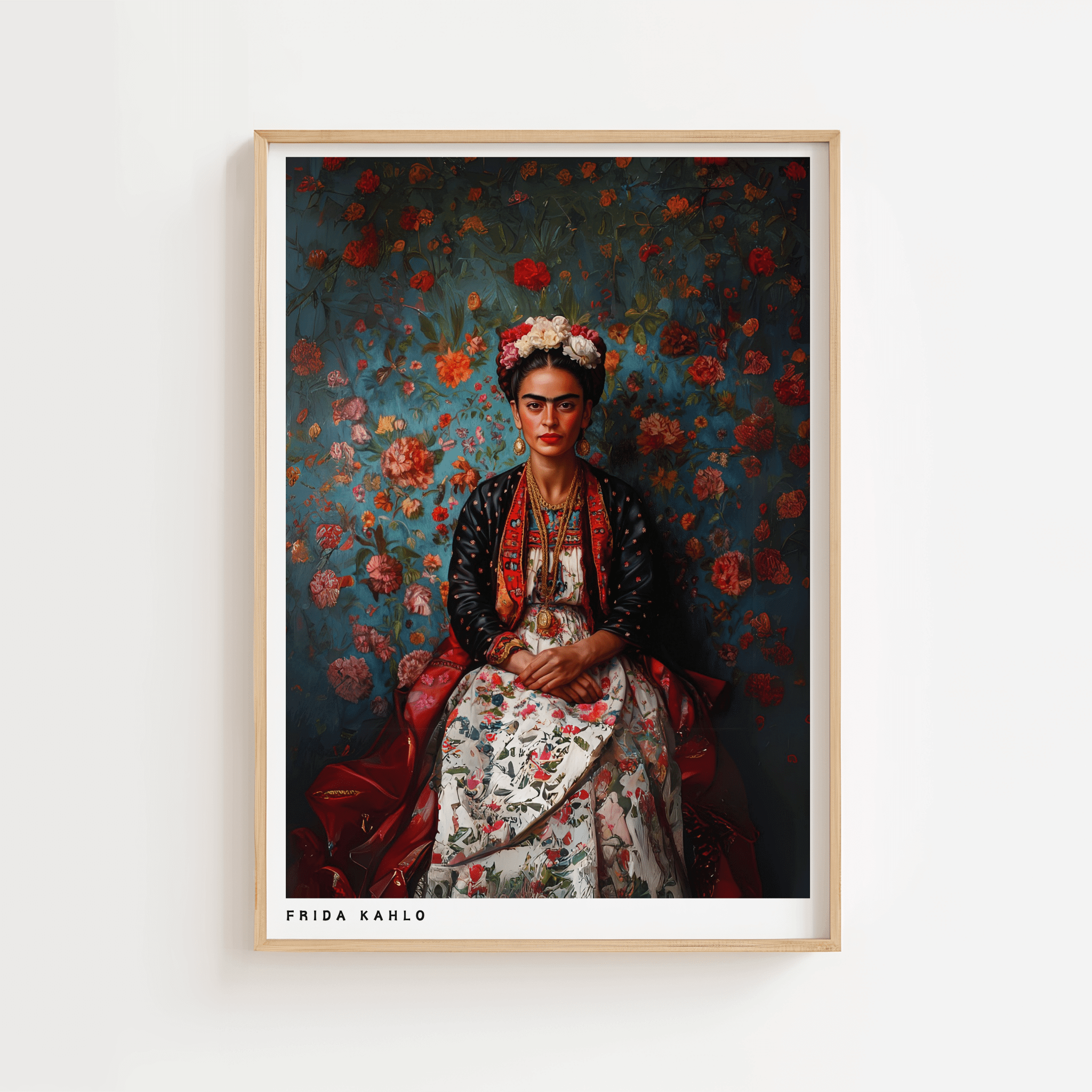 Add artistic charm to your home with the Rose Background – Frida Kahlo Poster . The motif shows the iconic Mexican artist surrounded by a blooming rose background, highlighting her strength and unique style. Perfect as a colorful statement in the living room, bedroom or office. Printed on quality poster paper that retains the colors beautifully for many years.