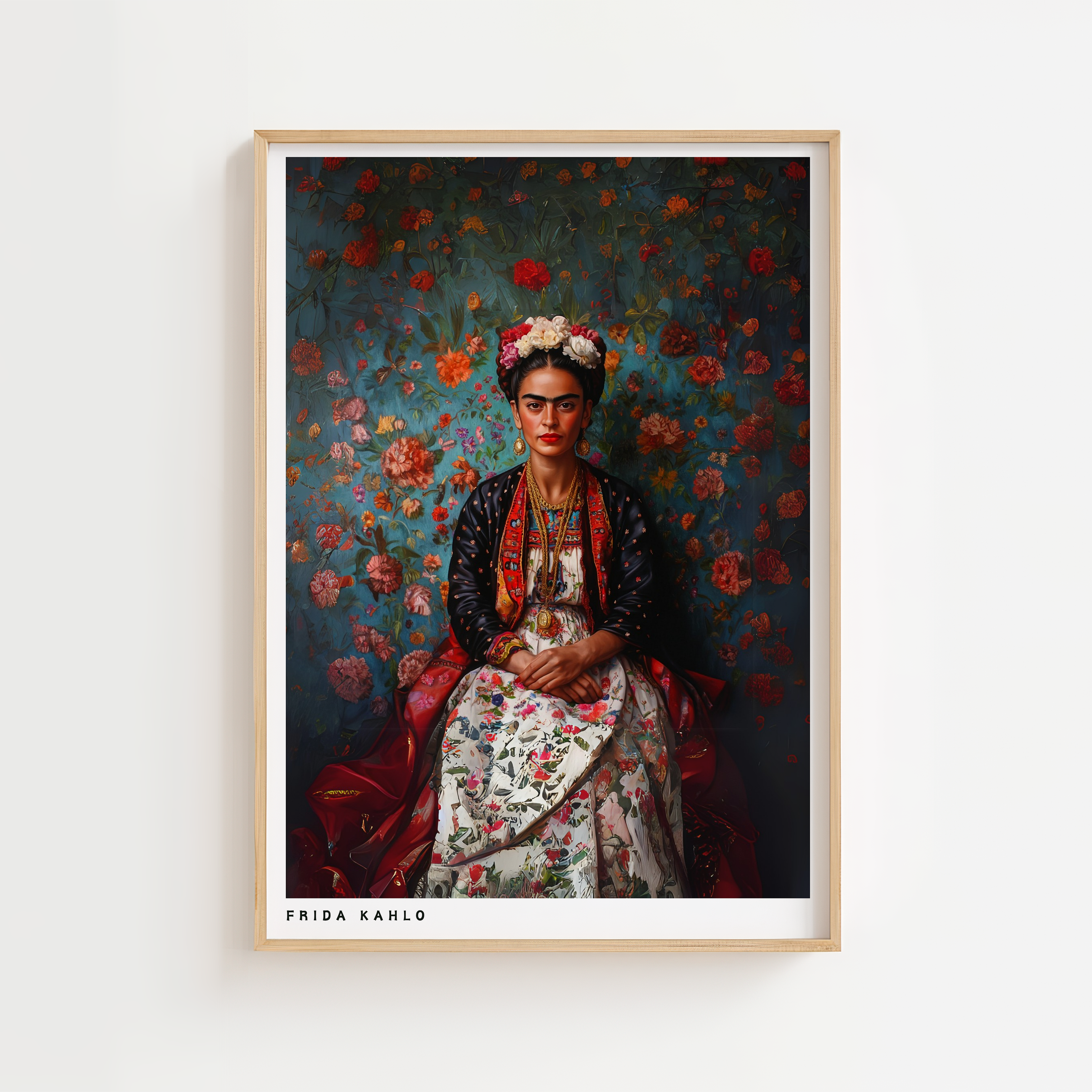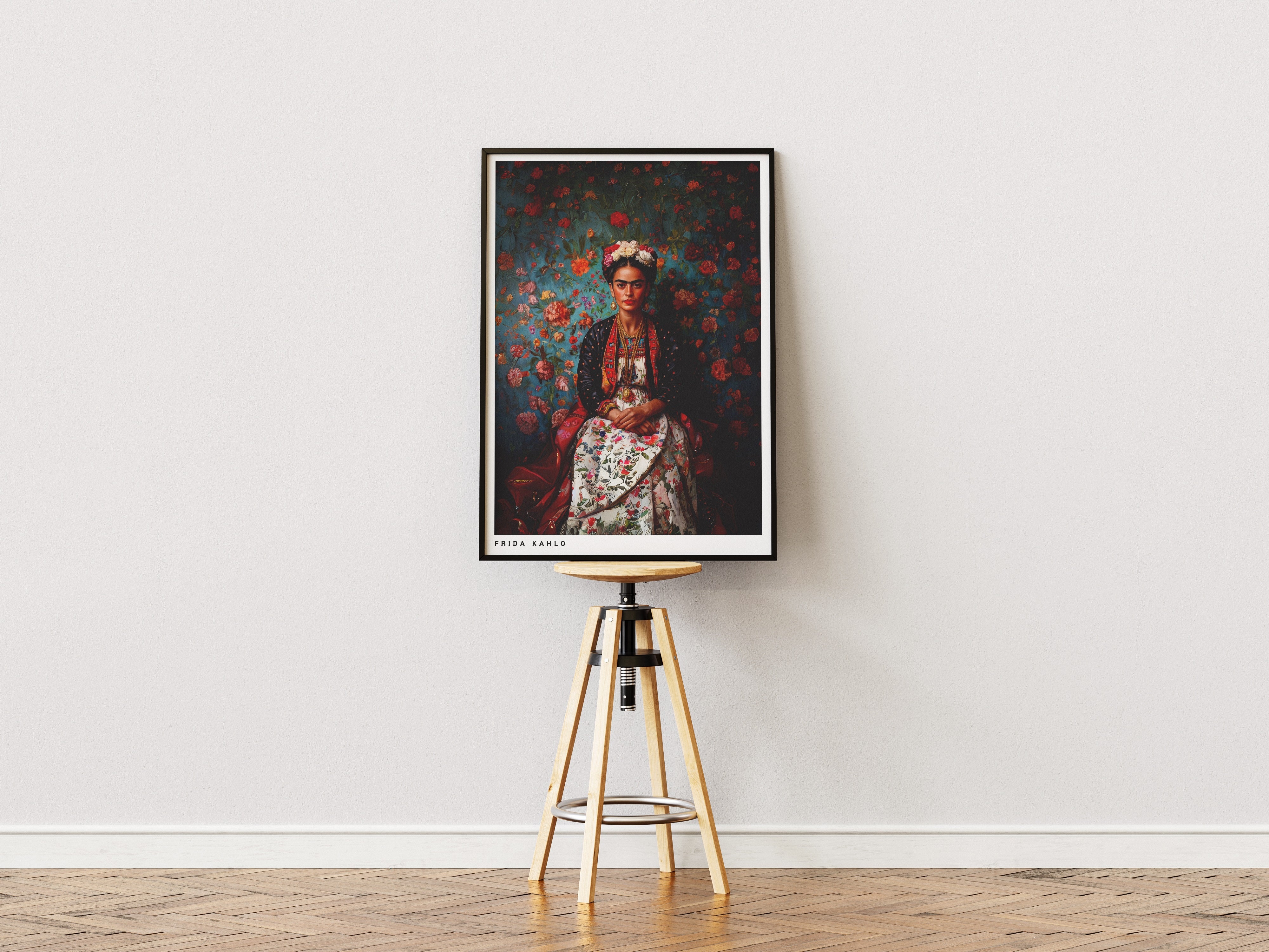 Tilføj kunstnerisk charme til dit hjem med Rosenbaggrund – Frida Kahlo Plakat. Motivet viser den ikoniske mexicanske kunstner omgivet af en blomstrende rosenbaggrund, der fremhæver hendes styrke og unikke stil. Perfekt som et farverigt statement i stuen, soveværelset eller kontoret. Trykt på kvalitetsplakatpapir, der bevarer farverne smukt i mange år.