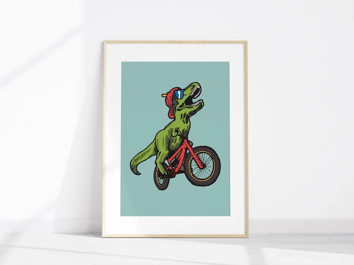 The T-Rex on a Mountain Bike Kids Poster is an energetic and imaginative poster depicting a dinosaur on a mountain bike. It adds speed, excitement and a bit of adventure to a child's room and is perfect for children who love action and outdoor adventures. This colorful poster inspires play and imagination, while adding a fun and creative element to the room. An ideal gift for the active young soul who loves dinosaurs and action